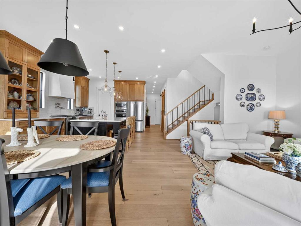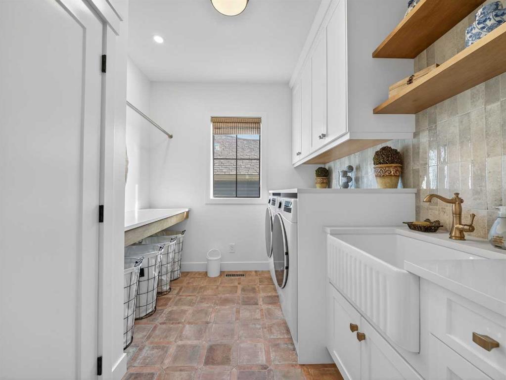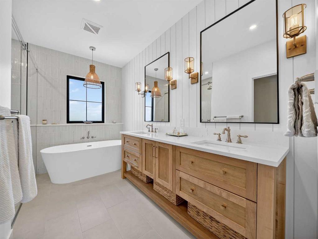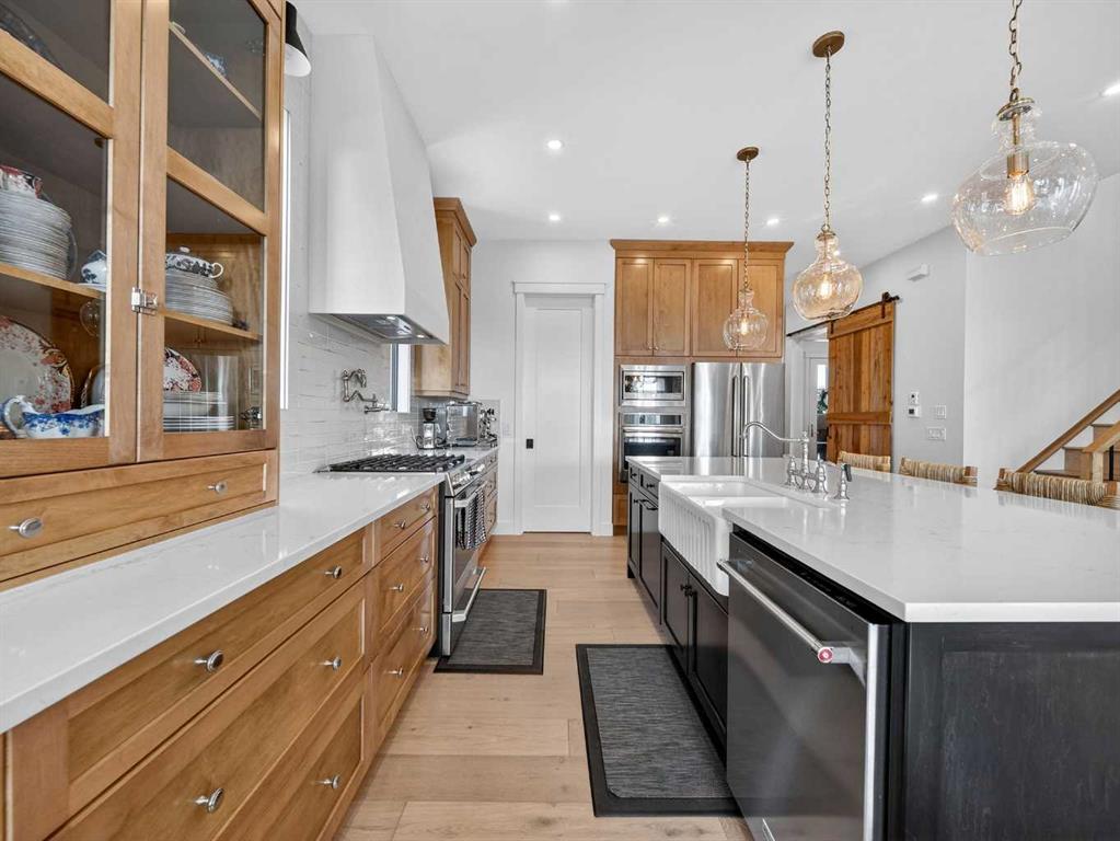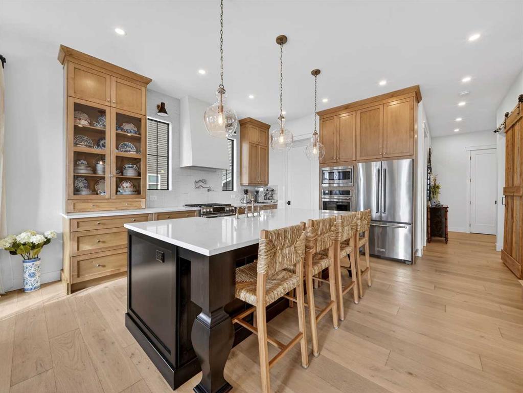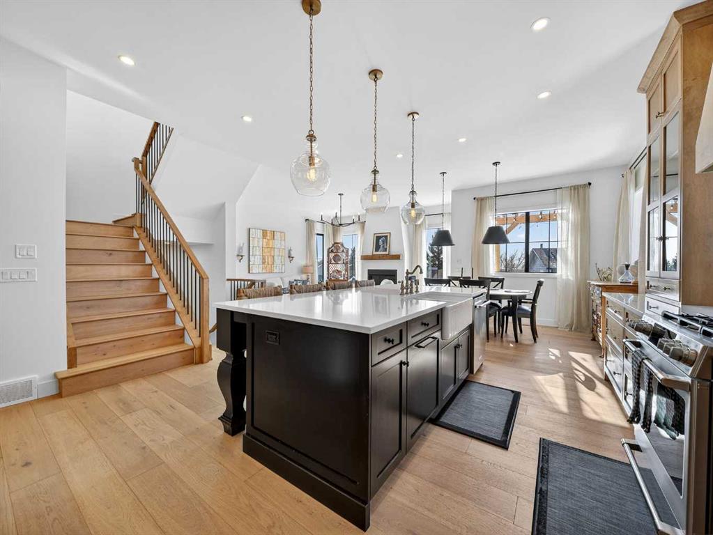 Welcome to an extraordinary custom-built farmhouse by Batten Lane in the prestigious community of Wedderburn in Okotoks — a residence where refined craftsmanship meets timeless elegance. From the moment you arrive, the home’s striking curb appeal, architectural charm, and warm, inviting presence create an unforgettable first impression. A gracious and spacious foyer welcomes you inside, immediately setting the tone for the thoughtful design. Just off the entry, a beautifully appointed office offers both functionality and sophistication, complete with bespoke built-in cabinetry and a custom desk. As you continue into the heart of the home, the 10 ft ceilings and breathtaking kitchen unfolds in true European Tuscan farmhouse style. Floor-to-ceiling custom maple cabinetry, rich in detail and warmth, is perfectly complemented by white oak flooring that flows seamlessly throughout the main level. A generous central island anchors the space, while a statement custom hood fan, built-in appliances, and exquisite imported tile elevate the design. Expansive windows capture sweeping west-facing mountain views and southern vistas overlooking Okotoks. The adjoining dining and living areas are designed for both intimate evenings and elegant entertaining. A custom gas fireplace provides warmth and ambiance, while an abundance of windows invites natural light and frames the stunning landscape beyond. Completing the main floor is a thoughtfully designed mudroom featuring custom cabinetry and a pristine dog bath. Ascending to the upper level, you are welcomed by a stunning bonus room perfectly positioned to take full advantage of the south-facing views over Okotoks and the majestic Rocky Mountains to the west. Three spacious bedrooms offer comfort and refinement. The primary retreat is a sanctuary unto itself, showcasing a spa-inspired ensuite with dual vanities, a freestanding soaking tub, and an oversized custom walk-in shower. Two additional bedrooms share a beautifully appointed bathroom. The laundry room is exceptional — custom cabinetry and farmhouse sink create a space as beautiful as it is functional. The fully developed lower level elevates this home even further. In addition to a completely separate legal basement suite with its own private entrance, quartz countertops, stainless steel appliances, and stacking washer and dryer — the lower level also features an additional bedroom or multifunction room with a full private ensuite. Bright, airy, and finished to the same uncompromising standards as the upper levels, nothing has been overlooked. Outdoors, the property truly shines. Situated on one of the largest lots in Wedderburn, the expansive south-facing backyard offers endless opportunity for relaxation and recreation. A two-tiered deck with pergola creates the perfect setting for summer entertaining with the Aqua Trainer 17AX and open skies. Every detail of this residence has been meticulously curated, the epitome of luxury farmhouse living.