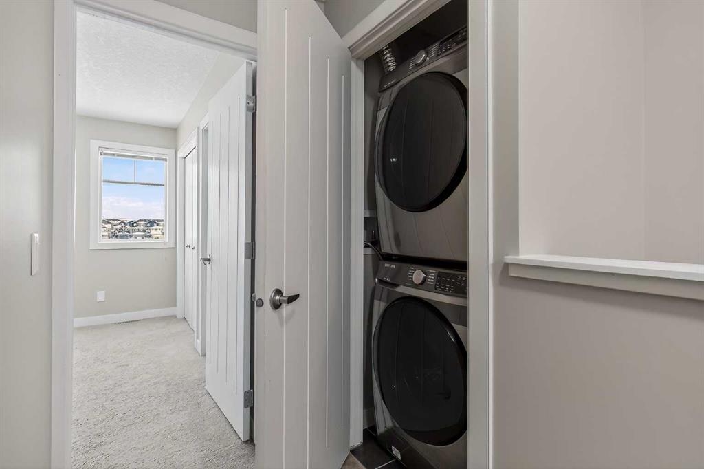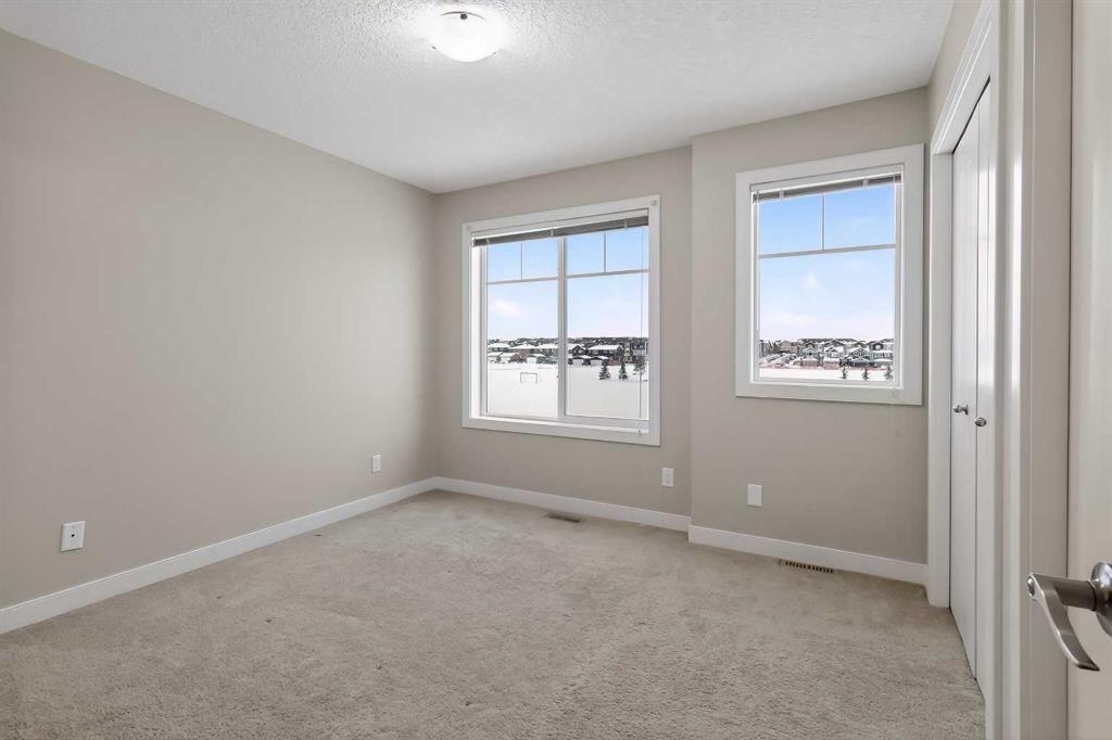 BACKING ONTO A HUGE GREEN SPACE, this bright and spacious open-concept townhouse condo in Kintalla of Redstone offers an exceptional location and layout. The main floor features laminate flooring, a generous living room, and a beautifully designed kitchen with ceiling-height cabinets, ample counter space, and a centre island with breakfast bar, along with a large dining area that opens to the balcony and a convenient 2-piece bath. Upstairs includes two primary bedrooms, each with its own ensuite, plus upper-level laundry for added convenience. Ideally situated near shopping, parks, playgrounds, a future school site, transit, quick access to Stoney Trail, and just minutes from Calgary International Airport, this home is perfect for first-time buyers and investors alike.