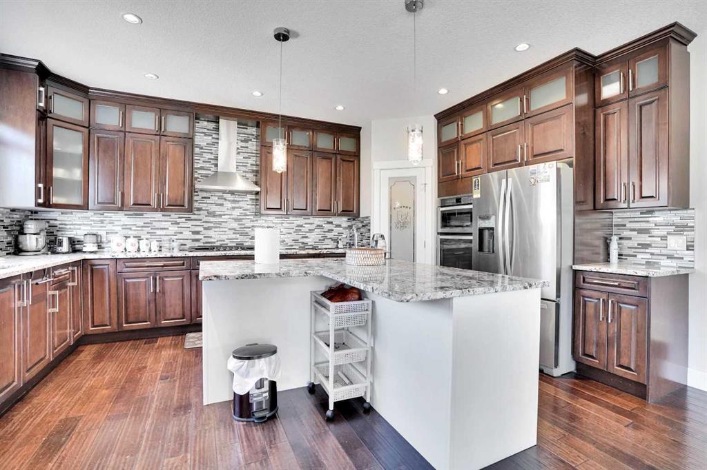 HUGE PRICE REDUCTION. Welcome to luxury living in the heart of Chestermere! This exceptional home boasts outstanding curb appeal, featuring a distinctive sloped roof, custom stonework, and a spacious front porch with an extra-wide entry door. With over 4,000 sq ft of beautifully designed living space, this home is sure to exceed expectations! From the moment you step inside, you’ll be greeted by high-end upgrades throughout—including dazzling crystal chandeliers, a striking stone feature wall with a gas fireplace and built-in shelving, gorgeous granite countertops in every room, and gleaming engineered hardwood floors. Expansive Palladian windows flood the interior with natural light, while walk-in closets, custom built-ins, and premium appliances add to the home’s luxurious appeal. The bright, open-concept main floor includes a spacious foyer, large living and dining rooms, a generous office, bathroom, mudroom, and a chef-inspired kitchen. The kitchen is a true showstopper, equipped with an oversized island featuring a second sink and breakfast bar, ceiling-height cabinetry, and a large walk-in pantry. With 6 large bedrooms and 5 bathrooms, there's room for the entire family and more. The primary suite is a private retreat, accessed through elegant French doors into a massive bedroom with a walk-in closet that’s custom-outfitted with dressers, jewelry drawers, shoe racks, purse hooks, and a full-length mirror. The spa-like ensuite bathroom includes an oversized Jacuzzi tub and a walk-in stone and tile shower. Upstairs, you’ll find a spacious family room with built-ins, three additional bedrooms, two full bathrooms, and a laundry room. (Plus, there are hook-ups for a second laundry area on the main floor.) The fully developed basement offers two more bedrooms, a large rec/family room, and three separate storage rooms—ideal for a growing family or guests. For those who love to entertain, built-in speakers throughout the home and backyard provide the perfect ambiance. The private backyard oasis features a massive exposed aggregate patio and a new quarry stone fireplace—perfect for cozy summer nights. The landscaped yard includes mature trees for privacy, raspberry bushes, perennial gardens, and even fruit trees, including a cherry tree and an apple tree that produces three apple varieties! The oversized triple garage is a dream for hobbyists or mechanics, with high knockdown ceilings, a large built-in workbench, full insulation, and rough-in for a natural gas heater. The expansive driveway offers ample parking, accommodating an RV and three additional vehicles, plus there's backyard access via a large gate for storing a boat or RV on this huge 5,527 sq ft corner lot! Tucked away on a quiet street with minimal traffic, this home is just one block from Eastlake School and Camp Chestermere, and close to walking paths, parks, playgrounds, as well as shopping, dining, and other amenities.