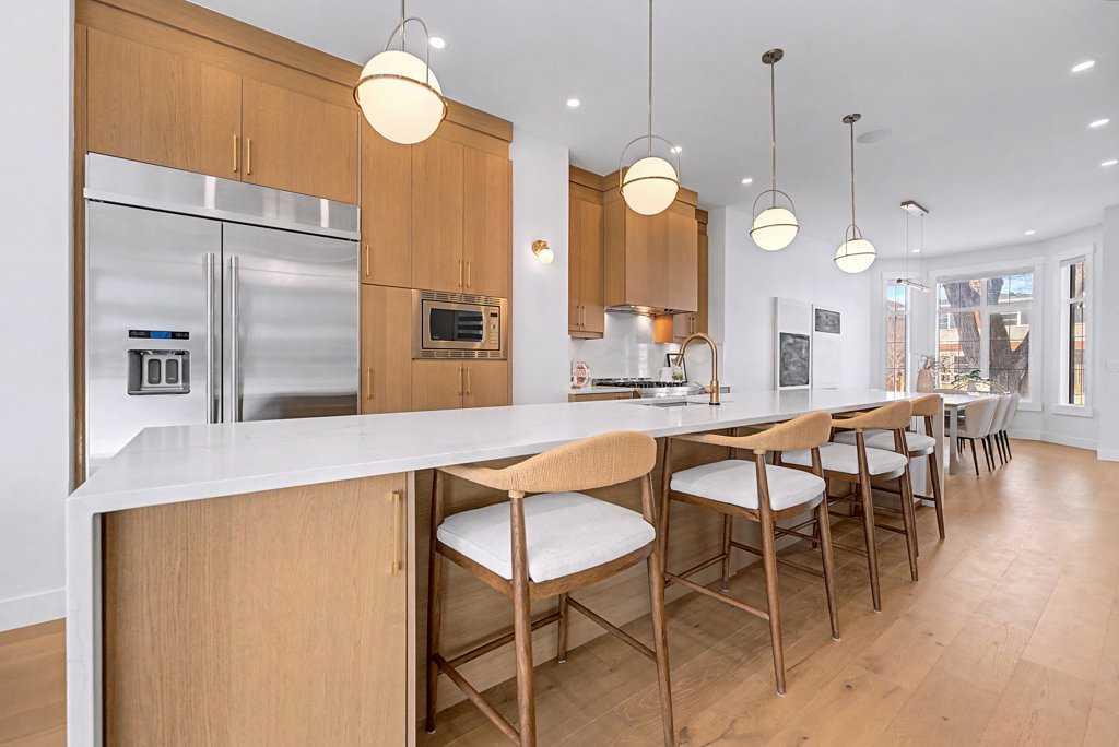 Absolutely STUNNING CURB APPEAL on this 2000 SQ. FT. two-storey (2800 total) in desirable ALTADORE! Classic FULL-BRICK facing & TURRETED roofline, BRICK WINDOW LEDGES, BLACK WINDOWS and MATCHING BLACK METAL ROOFING complete this gorgeous front elevation! Tell your guests to pull up to the nicest-looking house on the street & ring the doorbell! Come see 1935 43 Ave SW! Built in 2022, this home is beautiful and move-in ready! Mature trees grace this community and this front lawn, plus a paver patio, perfect for summer socializing with the neighbours. Step in the front door and you will instantly appreciate 10' CEILINGS, 8' interior doors and extensive ENGINEERED HARDWOOD flooring (running through the main level, upper level & both staircases)! Do you like to entertain? How about an ISLAND THAT IS ROUGHLY 16' LONG with stylish STONE COUNTERS, completed by 'WATERFALL' end panels! Plenty of room at the island, and in the SPACIOUS EATING AREA where you can comfortably seat the entire family! Fantastic kitchen, with perimeter CABINETS TO THE CEILING, ELEGANT CROWN MOULD DETAILING, UNDER-CABINET LIGHTING, plus STAINLESS-STEEL APPLIANCES including a fantastic SIX-BURNER GAS-STOVE for those delicious meals you like to serve. HUGE FRIDGE and BUILT IN MICROWAVE! The kitchen also features a CUSTOM VENTED HOOD over the stove, SOFT-CLOSE drawers, PULL-OUT SHELVES and an ADDED SERVING COUNTER with beverage fridge adjacent to the staircase. Enjoy a quiet evening in the living room with a cozy gas fireplace or step out the triple panel slider doors to your back deck for a summer BBQ (also accessible through the mudroom). When you park in the double garage - enter through the back mudroom (with BUILT-IN LOCKER units). For a game or an evening movie, head downstairs. The lower level has another bedroom and full bathroom, office space (with built-in shelving) and a bar area siding onto the rec room. IN-SLAB HEAT keeps your basement toasty all year round! The upper floor of this beautiful home has three spacious bedrooms, laundry and two bathrooms. The primary bedroom is three steps up, giving separation from the rest of the upper level. It also boasts a spa-like ensuite, with deep soaker tub and fully tiled steam shower (with inset wall niche for organization), plus walk-in closet with organizers. You will love the south-facing balcony off the primary bedroom for a quiet start to your day, or some sunshine in the afternoon. This home is beautifully finished with 'rose-gold' accents on the plumbing and light fixtures. Generous built-ins and added cabinetry storage spaces throughout the home. Large windows for plenty of natural lighting. The community of Altadore borders east & south to vast greenspaces, connecting you to river pathways, Glenmore Athletic Park, Glenmore Aquatic & Fitness Centre plus reservoir pathways where you can walk or cycle as much as you please! Perfectly located and beautifully finished. Book your showing today!