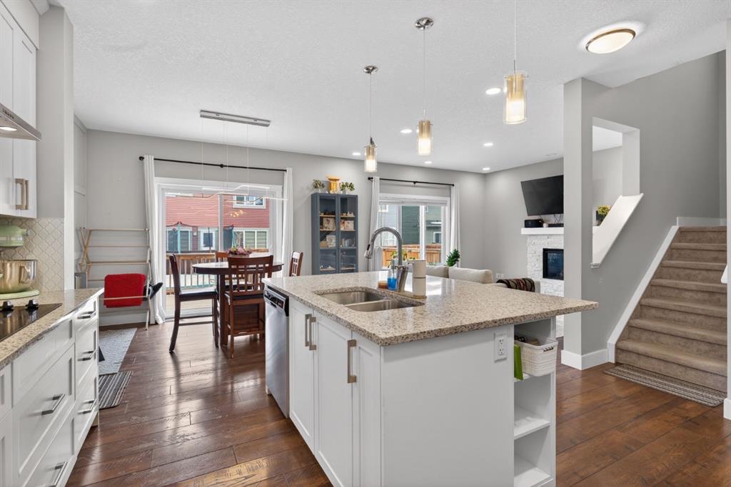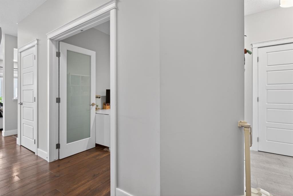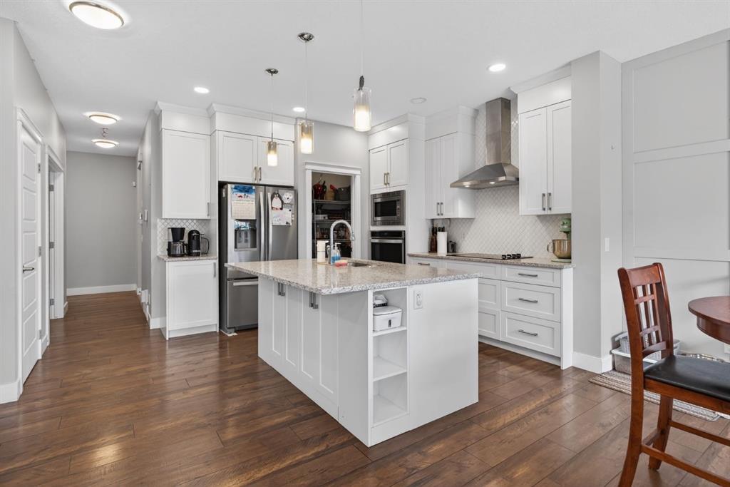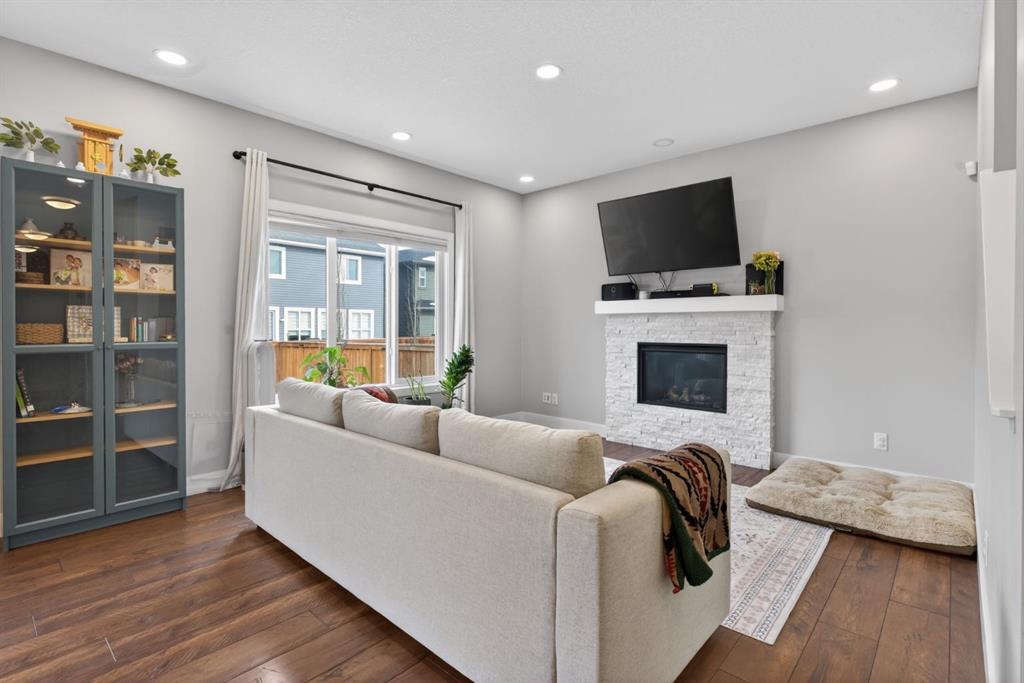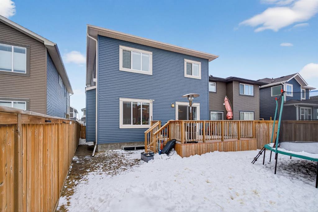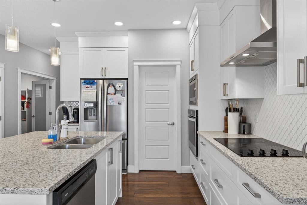 Welcome to this beautifully upgraded home offering 2,331 sq. ft. of refined living space, complete with a double-car garage, four upper-level bedrooms, a versatile main-floor office, and a fully landscaped, fenced yard. Situated on a quiet no-through street, the property showcases a distinctive exterior and high-end interior finishes throughout, including air conditioning. The home features white shaker-style kitchen cabinetry, quartz countertops, and a large central island. Premium built-in stainless steel appliances and a walk-in pantry complete this gourmet kitchen. The open-concept family room is ideal for entertaining family and friends, while the dining area opens onto a raised deck overlooking a beautifully finished yard with a striking fence. The bright living room offers an oversized window and a cozy, child-safe ledgestone fireplace with cool-to-the-touch glass. Durable hand-scraped laminate flooring runs throughout the main floor — perfect for busy households. A standout feature is the enclosed main-floor office with etched-glass French doors, providing a private workspace. A tiled mudroom off the garage adds practical storage, including a full closet for organized family living. Upstairs, four spacious bedrooms with 9-foot ceilings are complemented by a central bonus room with vaulted ceilings — an ideal secondary living space. The 5-piece main bathroom includes dual sinks and a tub/shower combination. The secluded primary bedroom features a designer feature wall, walk-in closet, and a spa-inspired ensuite with a 6-foot soaker tub, separate shower, and dual quartz vanities. The open basement offers excellent potential, providing ample room for storage, a home gym, or a play area for the kids.