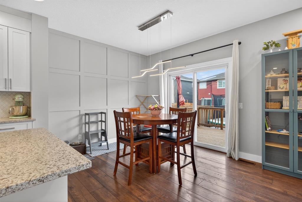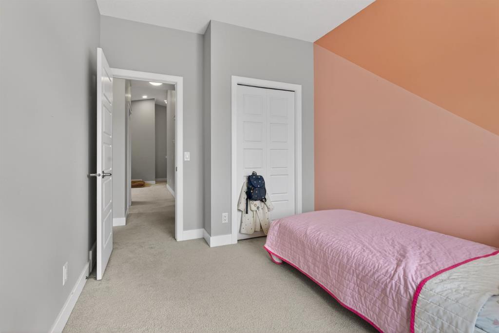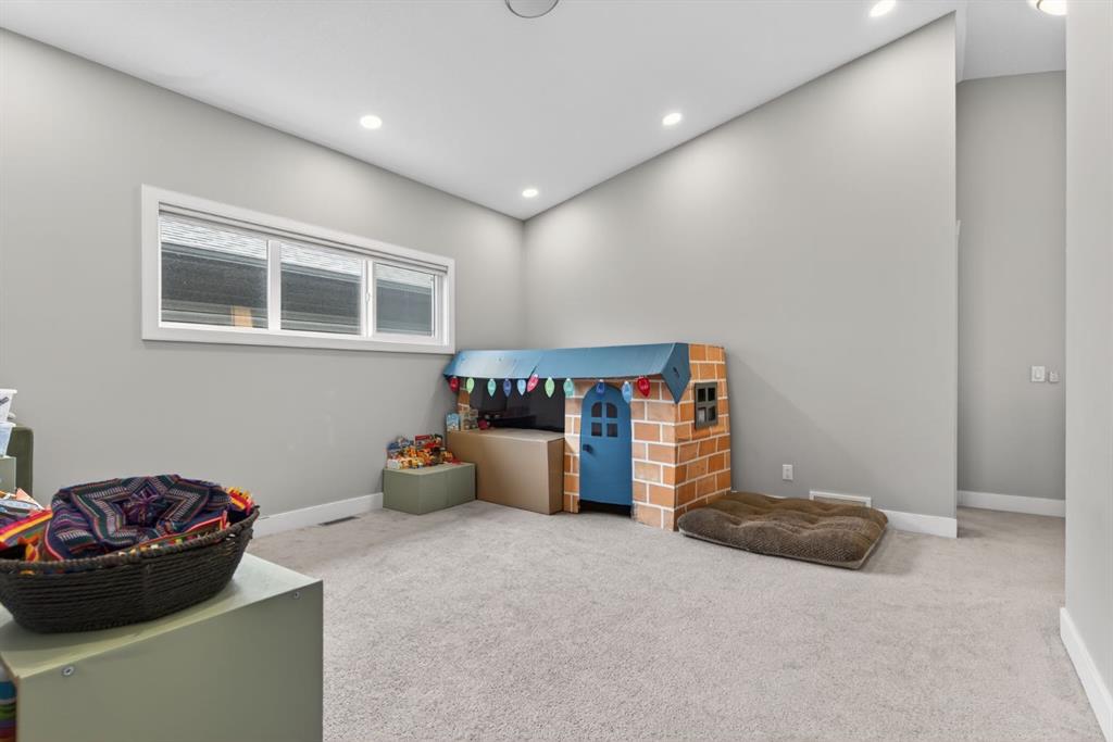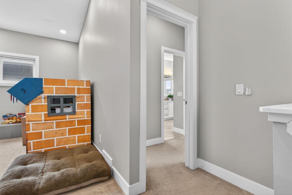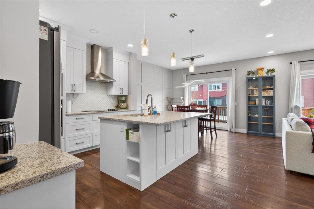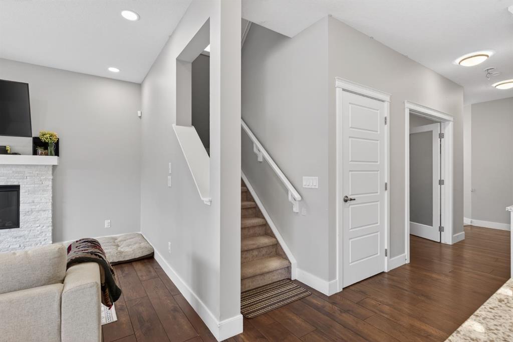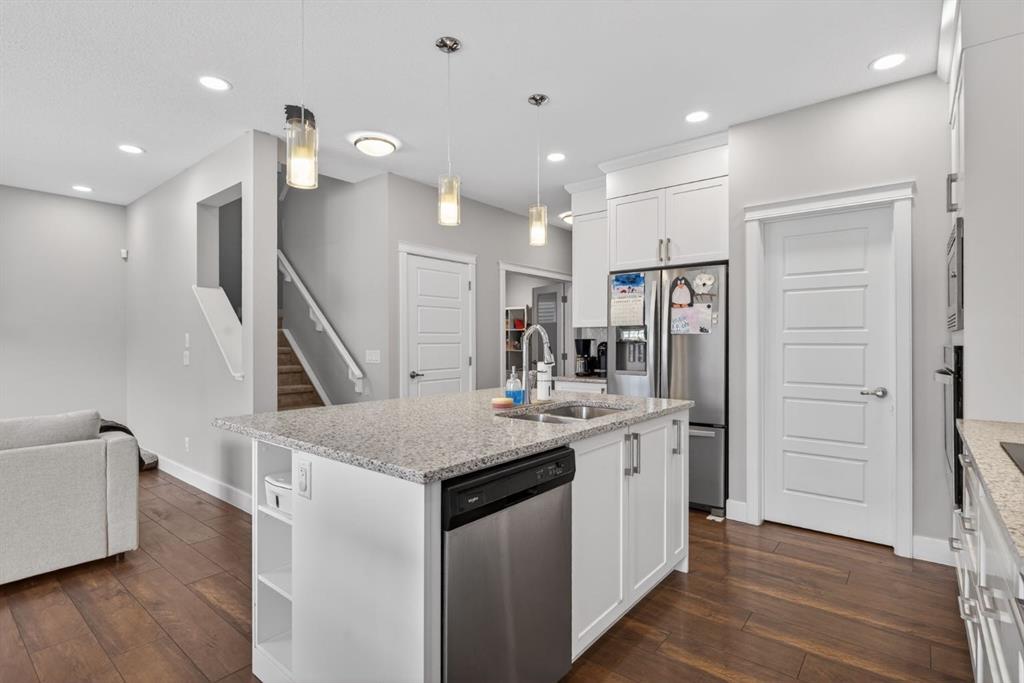 Welcome to this beautifully upgraded home offering 2,331 sq. ft. of refined living space, complete with a double-car garage, four upper-level bedrooms, a versatile main-floor office, and a fully landscaped, fenced yard. Situated on a quiet no-through street, the property showcases a distinctive exterior and high-end interior finishes throughout, including air conditioning. The home features white shaker-style kitchen cabinetry, quartz countertops, and a large central island. Premium built-in stainless steel appliances and a walk-in pantry complete this gourmet kitchen. The open-concept family room is ideal for entertaining family and friends, while the dining area opens onto a raised deck overlooking a beautifully finished yard with a striking fence. The bright living room offers an oversized window and a cozy, child-safe ledgestone fireplace with cool-to-the-touch glass. Durable hand-scraped laminate flooring runs throughout the main floor — perfect for busy households. A standout feature is the enclosed main-floor office with etched-glass French doors, providing a private workspace. A tiled mudroom off the garage adds practical storage, including a full closet for organized family living. Upstairs, four spacious bedrooms with 9-foot ceilings are complemented by a central bonus room with vaulted ceilings — an ideal secondary living space. The 5-piece main bathroom includes dual sinks and a tub/shower combination. The secluded primary bedroom features a designer feature wall, walk-in closet, and a spa-inspired ensuite with a 6-foot soaker tub, separate shower, and dual quartz vanities. The open basement offers excellent potential, providing ample room for storage, a home gym, or a play area for the kids.