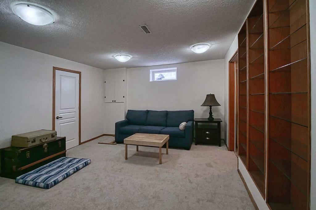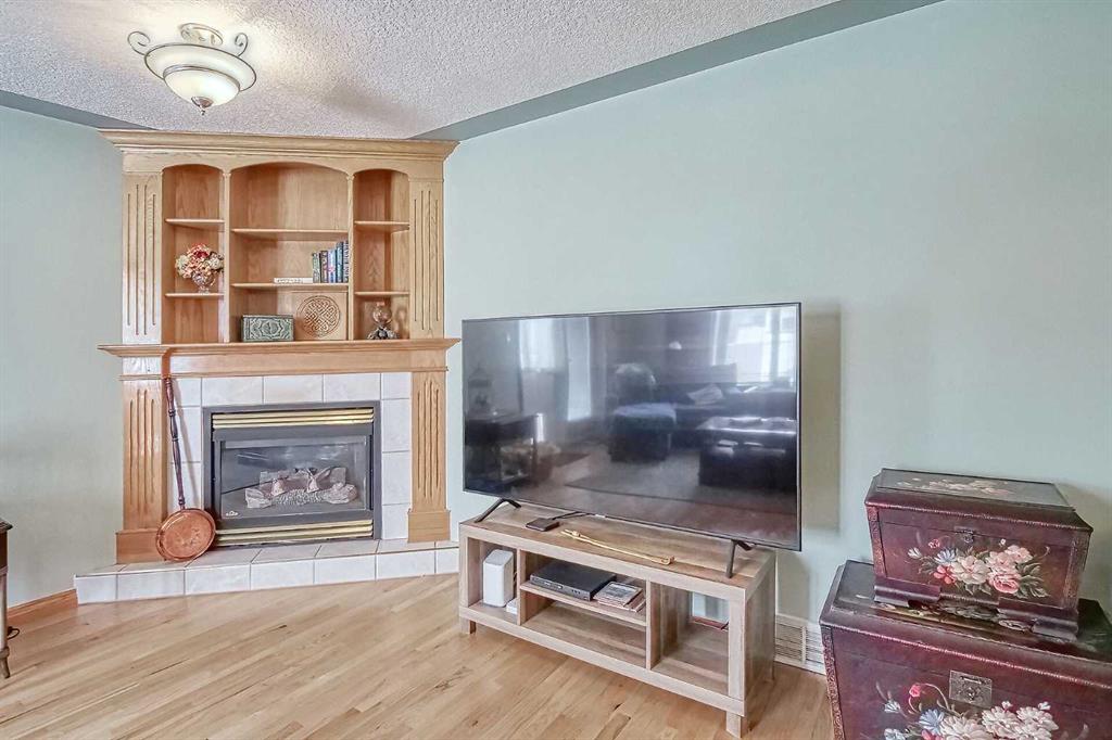 BEAUTIFULLY MAINTAINED BUNGALOW ON A HUGE CORNER LOT IN Crossfield, ideally located near parks and green spaces in a quiet neighbourhood. LOTS OF FRONT PORCH SITTING in this charming 4 bedroom, 3 bath home with a HEATED DOUBLE ATTACHED GARAGE features an updated kitchen with refreshed paint, flooring and lighting, some newer upper cabinetry, GRANITE COUNTERTOPS AND UPGRADED STAINLESS STEEL APPLIANCES INCLUDING A GAS RANGE, plus a two-seat breakfast bar and bright bay window nook for casual dining. The adjoining dining room has space for a large table and hutch and flows seamlessly into the inviting living room with a COZY GAS FIREPLACE. Patio doors lead to the SPACIOUS BACK DECK WITH PERGOLA overlooking the fully fenced yard with plenty of room for kids and pets to run. Down the hall are a 4 piece bathroom, two bedrooms, and a generous primary retreat with a LARGE WALK-IN CLOSET and oversized windows. Hardwood runs throughout the main floor with newer carpet in the bedrooms. There is A MAIN FLOOR LAUNDRY/MUDROOM just as you come in from the heated garage. The fully finished basement includes a LARGE MEDIA/RECREATION ROOM, a fourth bedroom with cheater access to a 4 piece bath (ideal for teens or guests), a flex room with built-in bookcases, a spacious utility area set up as a craft room, and dedicated cold storage. Complete with a newer deck and storage shed, this MOVE-IN READY HOME offers space, comfort, and functionality inside and out.