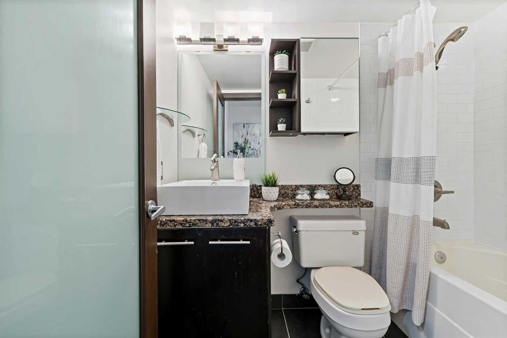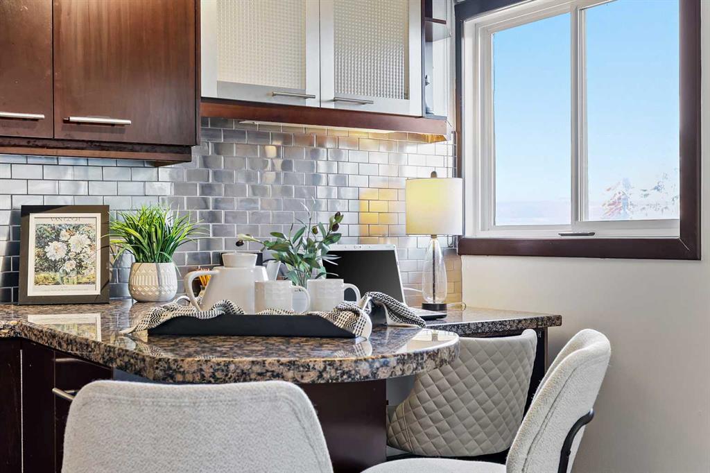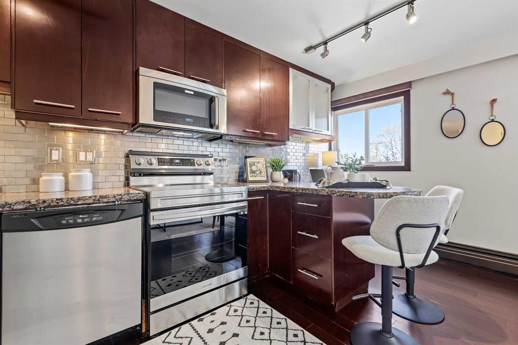 Welcome to this stunning condo with downtown views in the desirable community of Bankview! This one bedroom unit has been carefully planned to maximize space and has a great open concept living and kitchen area with engineered hardwood floors. The kitchen has granite countertops, espresso cabinets, and a breakfast bar! And an added bonus of a study nook which is a great spot for a university student or someone who works from home. The living room is a good size and has a beautiful feature wall with lights to highlight your artwork. What an amazing spot to entertain your friends and family! Next to the living room the primary bedroom has room for a queen-sized bed and has a large closet for all your clothes. A laundry room with a stacked Bosch washer and dryer combo and a 4 piece bathroom finish off the main floor. Moving onto the patio notice how private and quiet it is! And don’t forget the amazing downtown views. What a serene place to unwind at the end of the day with a glass of wine gazing at the twinkling lights of the city. And did we mention that this fantastic condo is in a CEMENT building so it is extremely quiet and private. Pets are allowed with board approval so you can bring your beloved fur baby to live here as well. And as an added bonus heat, water and ELECTRICITY are all included in the condo fees. Call your favorite realtor today for a showing. This one won’t last long!