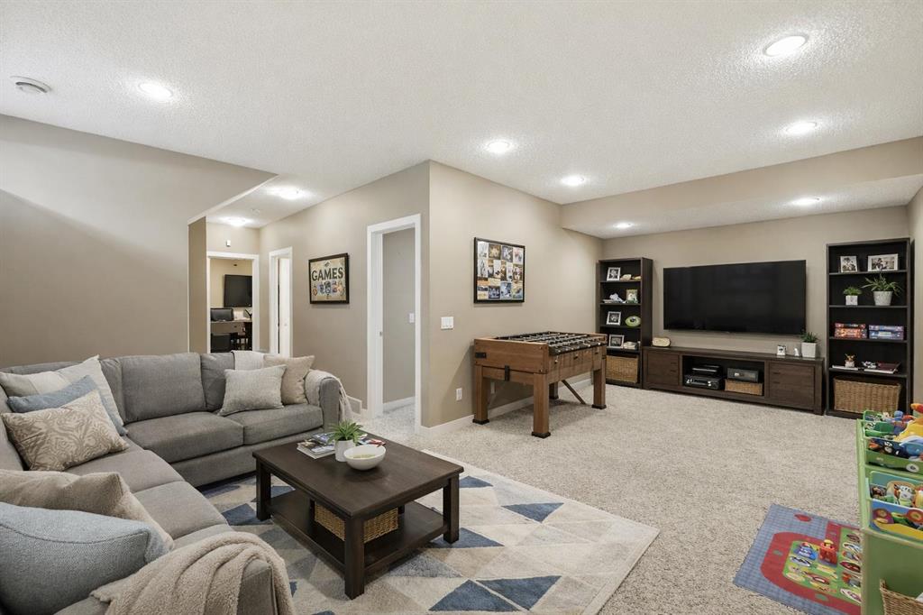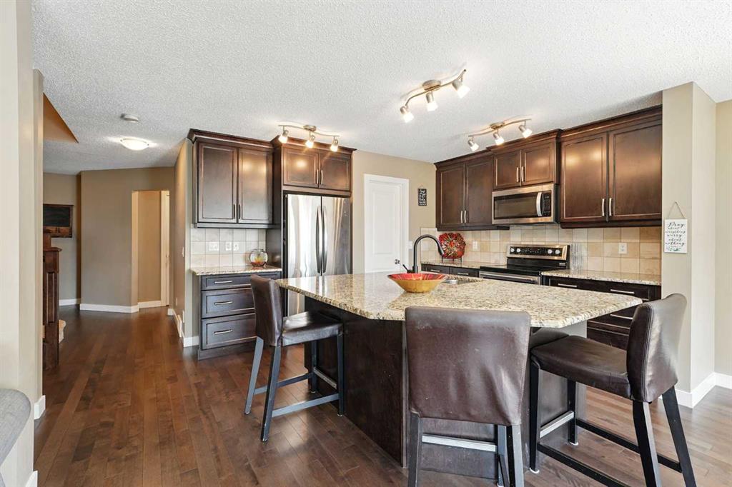 Welcome to this exceptional 2-storey home in the highly desirable community of King’s Heights, offering over 3,047 sq.ft. of developed living space with 5 bedrooms, 3.5 bathrooms, and a spacious upper bonus room—designed for growing families. The bright, open-concept main floor is filled with natural light from oversized windows and finished with durable luxury vinyl plank flooring. The chef-inspired kitchen anchors the home, featuring an island, granite countertops, stainless steel appliances, and a walk-through pantry that connects seamlessly to the mudroom and insulated double attached garage—ideal for busy households. The inviting living room centers around a gas fireplace with tile surround, creating a warm, comfortable space. Upstairs, the generous bonus room offers the perfect setup for a media space, home office, or kids’ retreat. The primary suite is a true escape, complete with a walk-in closet, dual vanities with granite counters, a separate shower, and a spa-style soaker tub. Two additional bedrooms and a full bath complete the upper level. The fully finished basement expands your options with a large recreation room, an additional bedroom, full bathroom, and dedicated laundry area—ideal for guests, teens, or multi-generational living. Enjoy sunny days in the private backyard from the rear deck, or relax on the charming covered front porch. Located just steps from ponds, walking paths, parks, schools, and shopping, this home combines space, upgrades, and location in one of Airdrie’s most family-friendly communities. A complete package in King’s Heights—move-in ready and built to grow with you.