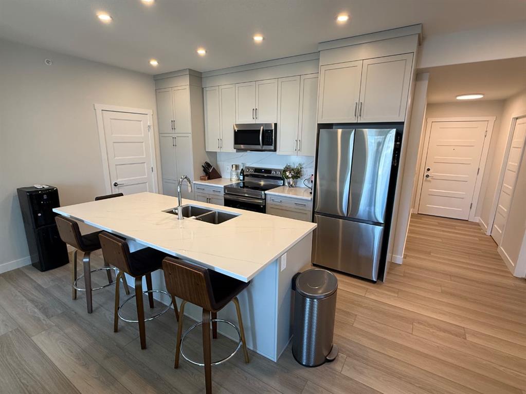 A polished top-floor 1-bedroom + den in The Whitney of Springbank Hill, this upgraded home offers modern finishes, bright open living, and unbeatable walkability. The kitchen features quartz countertops, a full-height quartz backsplash, sleek cabinetry, and a large island with plenty of workspace and storage. Luxury vinyl plank flooring runs throughout, and motorized Alta blinds—controlled through the Bliss Automation app—add effortless convenience. The spacious bedroom includes a walk-in closet, while the den provides the perfect home office or flex space. Air conditioning, 1.5 baths, and in-suite laundry complete the interior. This unit includes titled underground parking and a dedicated storage locker. Located just a 5-minute walk from Aspen Landing, you’re steps from over 50 shops and services including Safeway, Starbucks, Shoppers Drug Mart, restaurants, and banks. Transit, the C-Train, and major routes like 17th Ave SW are moments away, offering a quick 10-minute commute downtown. A rare opportunity to own in one of Calgary’s most desirable west-side communities—modern luxury and everyday convenience come together beautifully in this Springbank Hill gem.