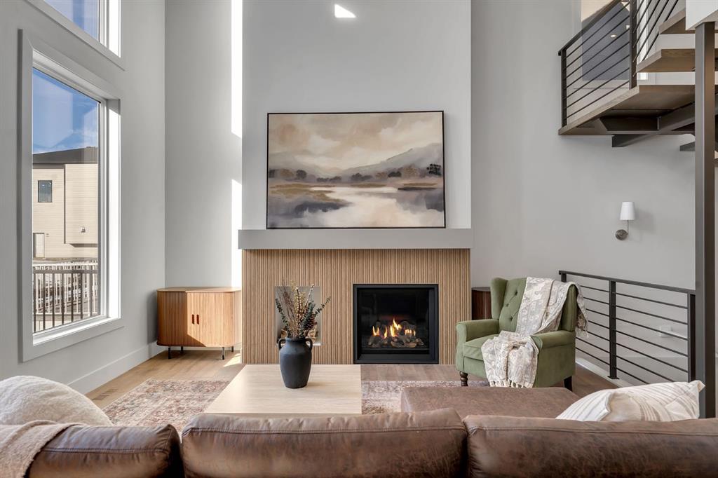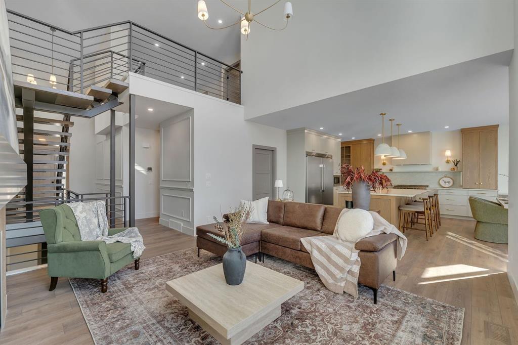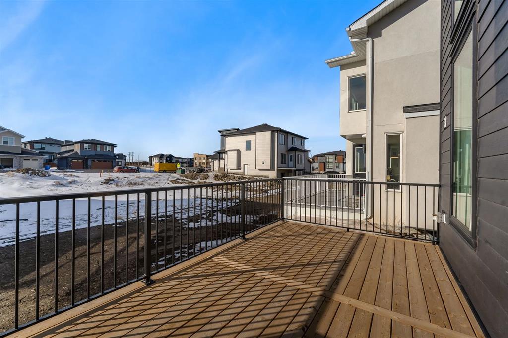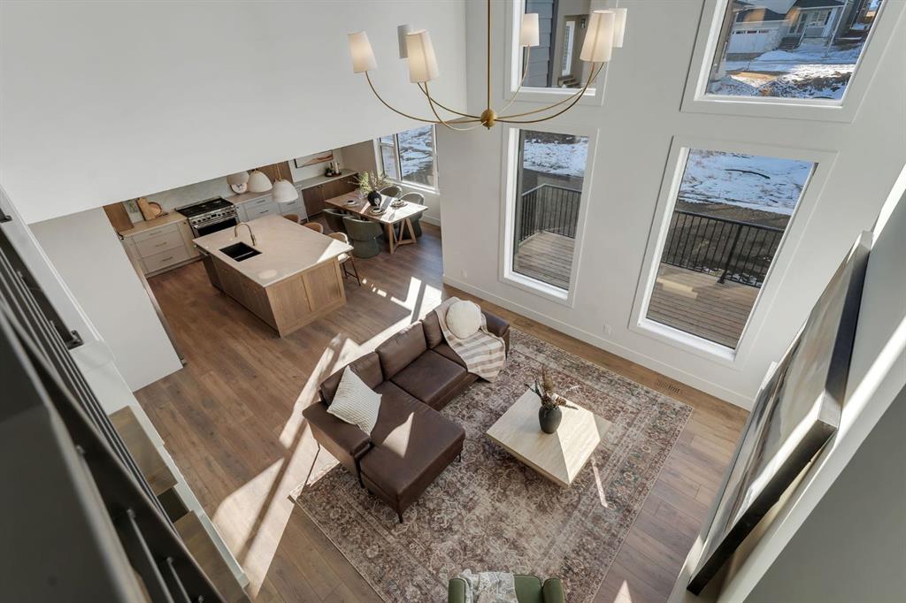 Showhomes like this rarely come on the market. Located in Waterford Estates, this home combines architectural presence with intentional design. An east-facing front welcomes the morning sun, while the west-facing backyard captures natural daylight throughout the day. The exterior makes a confident first impression with Hardie board siding, extensive stone detailing, and a heated triple garage. Inside, a curated feature wall and a striking floating metal staircase create an unforgettable entry moment, sculptural, clean, and refined. Hardwood flooring flows across the main level, guiding you into a dramatic open-to-below living space framed by expansive west-facing windows. Light pours in, enhancing the fireplace feature wall and amplifying the sense of volume and openness. The kitchen is where craftsmanship meets restraint. An oversized island with cabinetry anchors the space, complemented by a Silgranit sink and elevated brushed brass fixtures. Soft neutral cabinetry extends to the ceiling, paired with warm wood accents and designer pendant lighting. A seamless stone backsplash flows cleanly behind the gas cooktop and custom hood fan, creating a cohesive, tailored aesthetic. Storage is generous and intentional, from deep pot drawers to concealed cabinetry, ensuring the space functions as beautifully as it presents. Just beyond, a dedicated breakfast nook and formal dining area offer flexibility for both everyday living and elevated hosting. Tucked discreetly behind two-way swinging doors is a fully equipped SPICE KITCHEN with additional pantry space, a rare and highly desirable estate feature that keeps entertaining seamless. The main floor also offers a spacious bedroom with its own full ensuite and custom built-in closet shelving, plus an additional powder room, ideal for guests or multigenerational living. Upstairs, open metal railings overlook the main level, leading to a generous bonus room with a dedicated media wall and an upper laundry room for convenience. The primary retreat is thoughtfully designed with a privacy feature wall, open closet concept with built-in wood shelving, and a spa-inspired ensuite featuring a freestanding tub, double vanities, fully tiled shower with bench and niche detailing, and refined brass fixtures throughout. A second upper-level bedroom enjoys its own private ensuite, while additional bedrooms and bathrooms provide comfort and independence for family members. Outside, a finished deck with metal railings extends onto a wide lot, just minutes from Chestermere Lake, East Hills Shopping Centre, parks, and playgrounds. This is not simply a home, it is a carefully composed showpiece built for those who appreciate detail, light, and lasting design. Book your showing today.