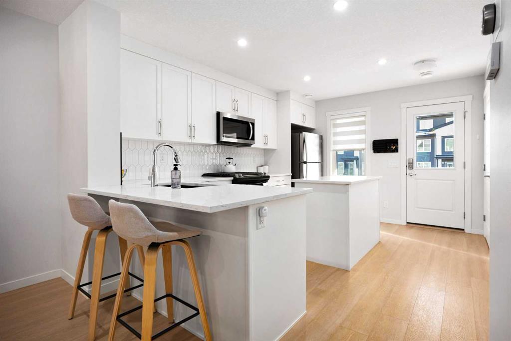 Welcome to this stunning 2023-built townhome in the vibrant community of Seton, offering modern design, thoughtful upgrades, and incredible rooftop views. As you step inside, you’re greeted by a bright open-concept main floor where the living, dining, and kitchen areas flow seamlessly together. Large windows flood the space with natural light, creating a warm and inviting atmosphere. The beautifully upgraded kitchen features stylish cabinetry, upgraded appliances, and a contemporary backsplash that ties the space together perfectly for both everyday living and entertaining. Knockdown ceilings and pot lights add to the fresh, modern feel, making this home truly feel brand new. From the main level, step outside to your fully fenced backyard complete with a shed—ideal for pets, kids, or BBQing on hot summer evenings. On the second level, you’ll find a spacious primary bedroom highlighted by a stunning feature wall and a private 3-piece ensuite. A generously sized second bedroom includes a convenient Murphy bed, creating flexibility for guests, a home office, or both. An additional 4-piece bathroom and laundry closet completes this level. The third floor offers an impressive and versatile family space that can function as a bonus room, media room, home gym, or entertaining lounge. Complete with a wet bar and mini fridge, it’s perfectly set up for hosting friends and family. Step out onto the incredible rooftop deck where you can soak up sun all day long while enjoying expansive views stretching to the mountains and beyond. Additional features include central air conditioning, high-end zebra blinds and curtains, upgraded carpet, luxury vinyl plank flooring throughout, low condo fees, and a fantastic location just steps from the HOA and its amenities. Living in Seton means enjoying one of Calgary’s most dynamic and amenity-rich communities. Residents have access to the impressive Brookfield Residential YMCA at Seton, one of the largest YMCA facilities in North America, as well as the nearby South Health Campus. The community offers a growing urban district filled with shops, restaurants, entertainment options including a VIP Cineplex theatre, grocery stores, cafés, parks, pathways, and convenient access to major roadways. Seton truly delivers the perfect blend of urban convenience and connected community living—and this exceptional townhome allows you to experience it all in style.