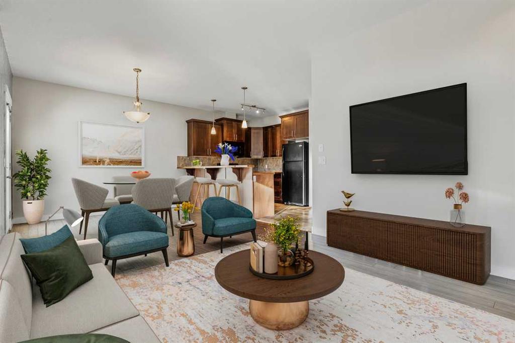 Welcome to this affordable, beautiful and comfortable townhouse located in the desirable community of The Ranch in Strathmore. Offering over 1400 ft.² of well- lit and sunny living space. This freshly painted home features 3 bedrooms 2.5 bathrooms and a double attached garage. As you enter, you are welcomed by a good-size foyer, leading into the open concept main floor. The kitchen offers ample cabinetry, black appliances, and a breakfast bar, making it both functional and inviting. The living and dining areas, flow nicely together, with the living room featuring a cozy gas fireplace and a built-in wall unit. The dining area is a comfortable size and provides access to your private patio, and is perfect for summer barbecues. The top floor of this spacious townhome features a master bedroom that includes a walk-in closet and a private 4 -piece en suite, along with 2 additional generously sized bedrooms and a 4- piece bathroom completing the upper floor. The unfinished basement offers great potential for future development, whether you envision a fourth bedroom, home gym, or additional living space. This home is an excellent opportunity for first home buyers, growing families, or those looking to downsize. Conveniently located close to parks, schools, shopping, and major roads. This home is move-in ready! Book your showing with your favorite realtor today before it's gone!