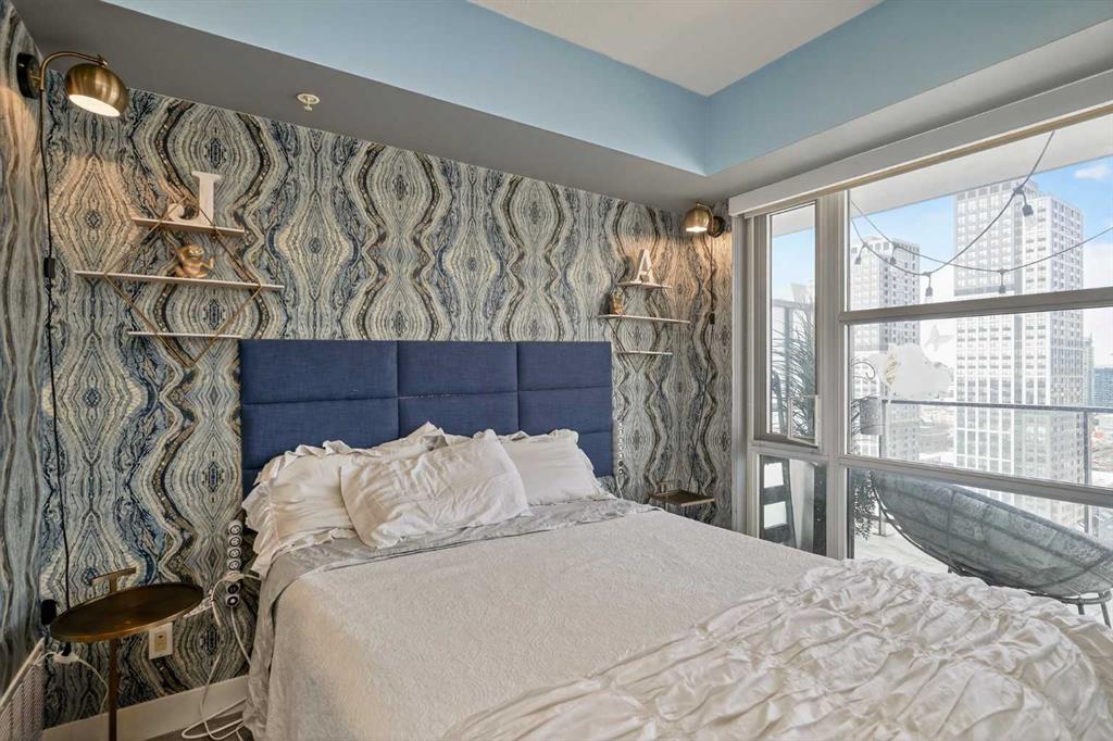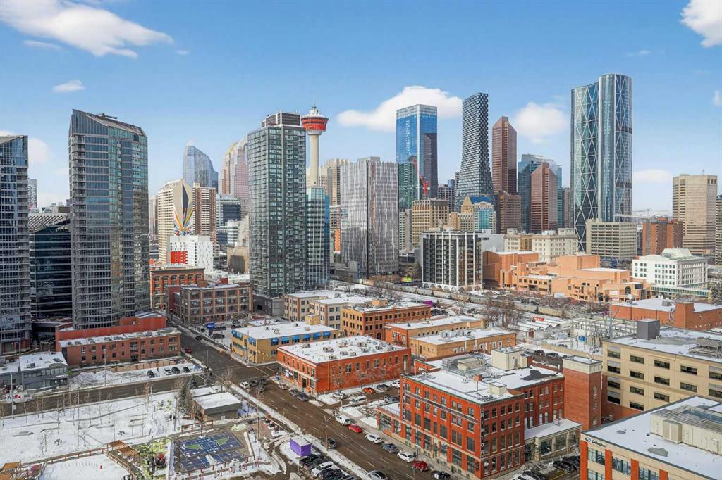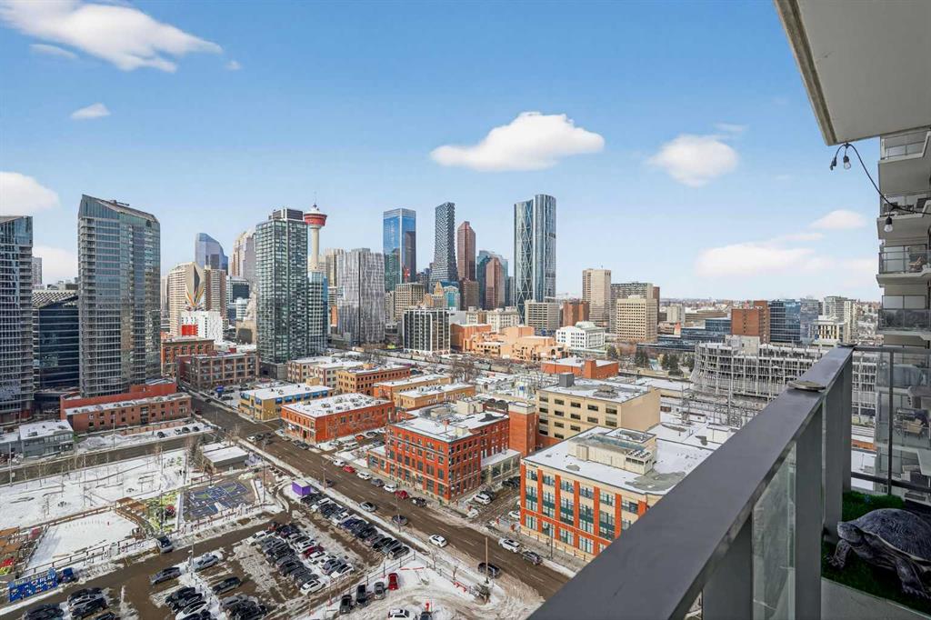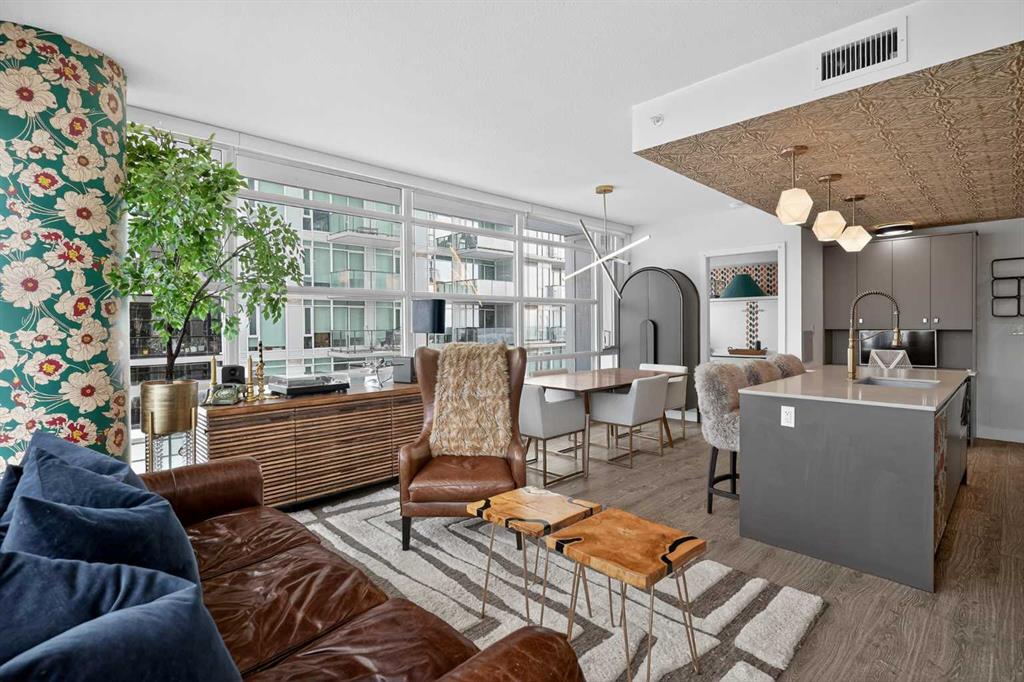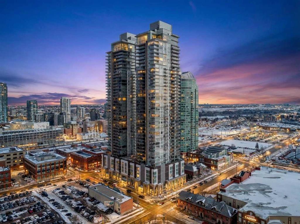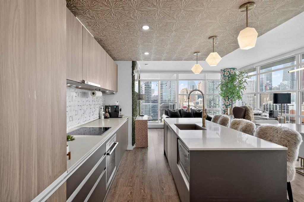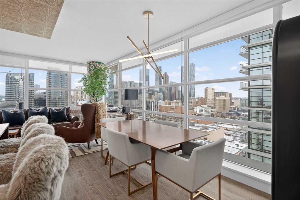 Welcome to the Gaurdian, South Tower. Truly one of Calgary's most sought after and spectacular buildings. This 2 bedroom, 2 bathroom home is unlike any other you have seen. Walking in you are greeted with gorgeous laminate floors, a white and gold feature wall and custom light fixtures. Entering into your open floor plan starts with your chef inspired kitchen with gold fixtures, custom built-in's in the cabinets and drawers, custom back splash, quartz counter tops and built-in stainless steel appliances. The large dining space is not something you normally find in a condo and is a great area to entertain or for quiet nights at home with the family. Your living room is a great size and offers you expansive VIEWS of DOWNTOWN, THE CALGARY TOWER, the MOUNTAINS, and connects to you west facing balcony. With this home being a corner unit you have amazing floor to ceiling windows offering views from every room. The primary bedroom is large enough for a king size bed as well as additional bedroom furniture and has a beautiful ensuite bathroom. The second bedroom is also a great size and has a custom MURPHY BED that was designed for the space and doubles as a home office. The second bathroom is custom designed and has a huge walk-in shower. The unit INCLUDES ALL TV'S AND MOUNTS as well as 2 TITLED SIDE BY SIDE UNDERGROUND PARKING SPACES!!!!! The Gaurdian has great amenities including a massive gym, social room, garden terrace, workshop, and is steps from the stampede grounds, great restaurants, shopping, bus and train routes giving you the best of downtown living. Do not miss out on your opportunity to own the most unique home in one of Calgary's most desired luxury buildings.