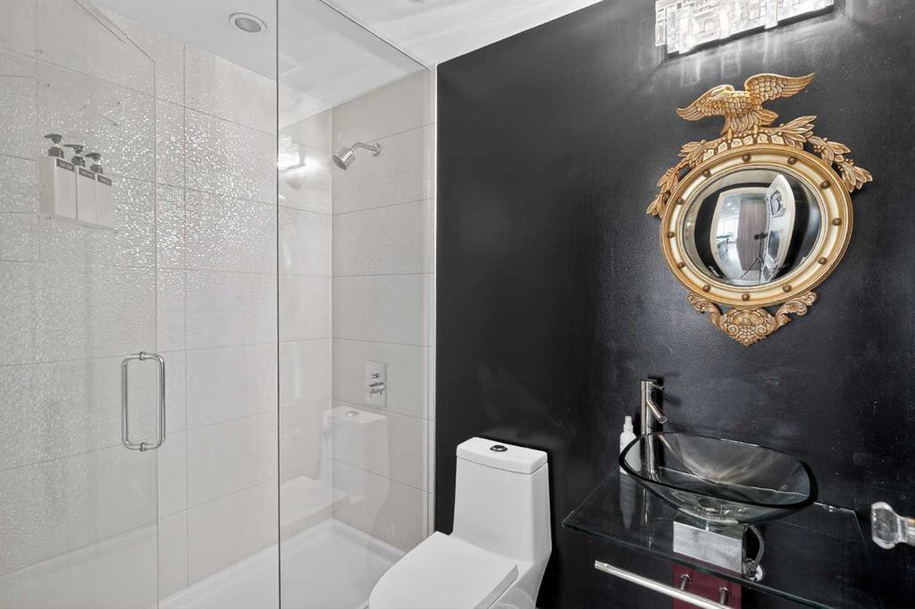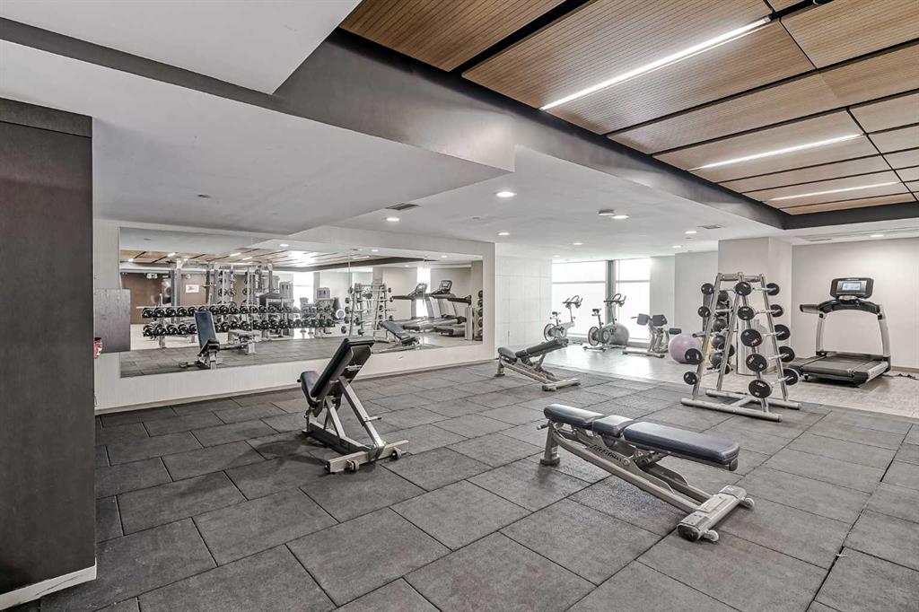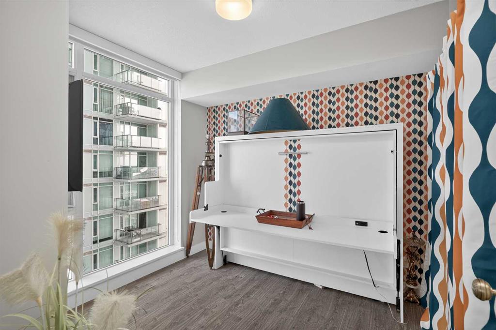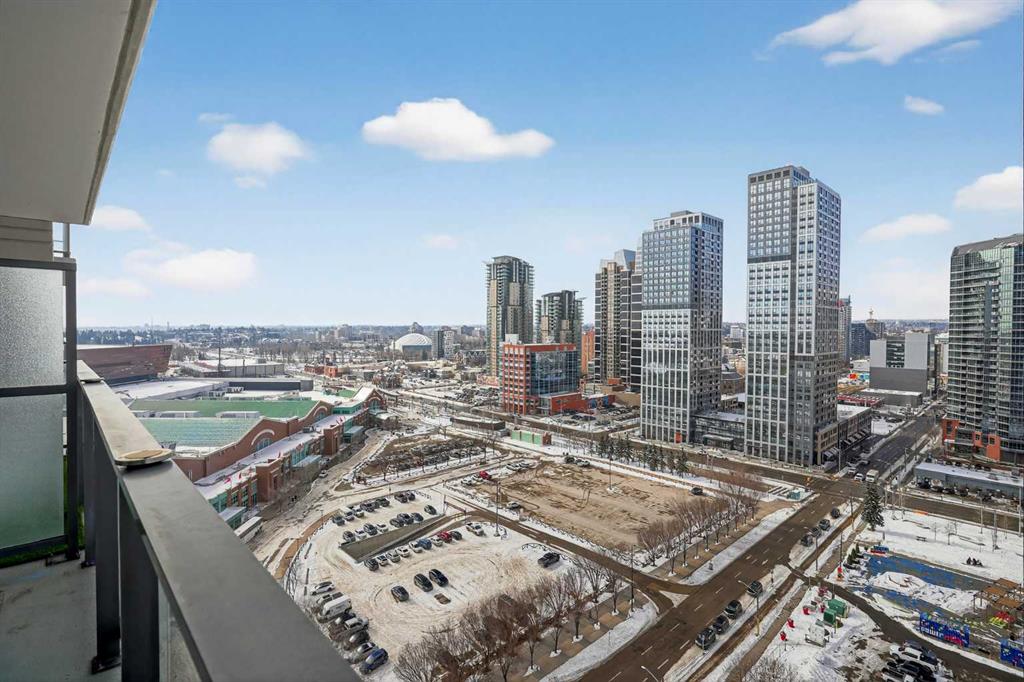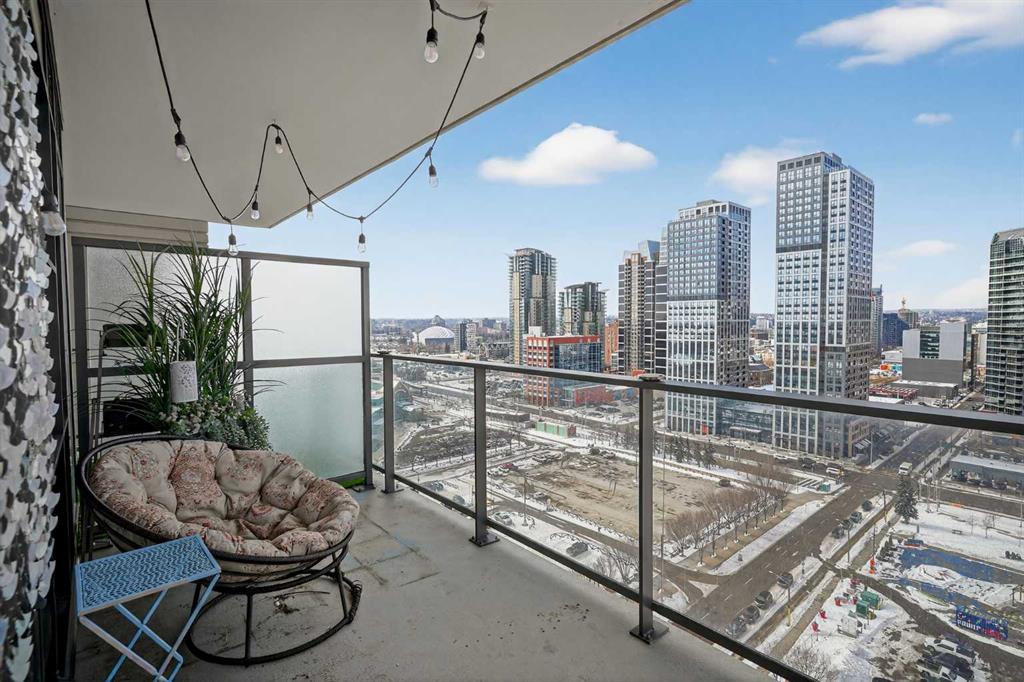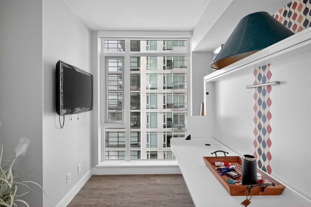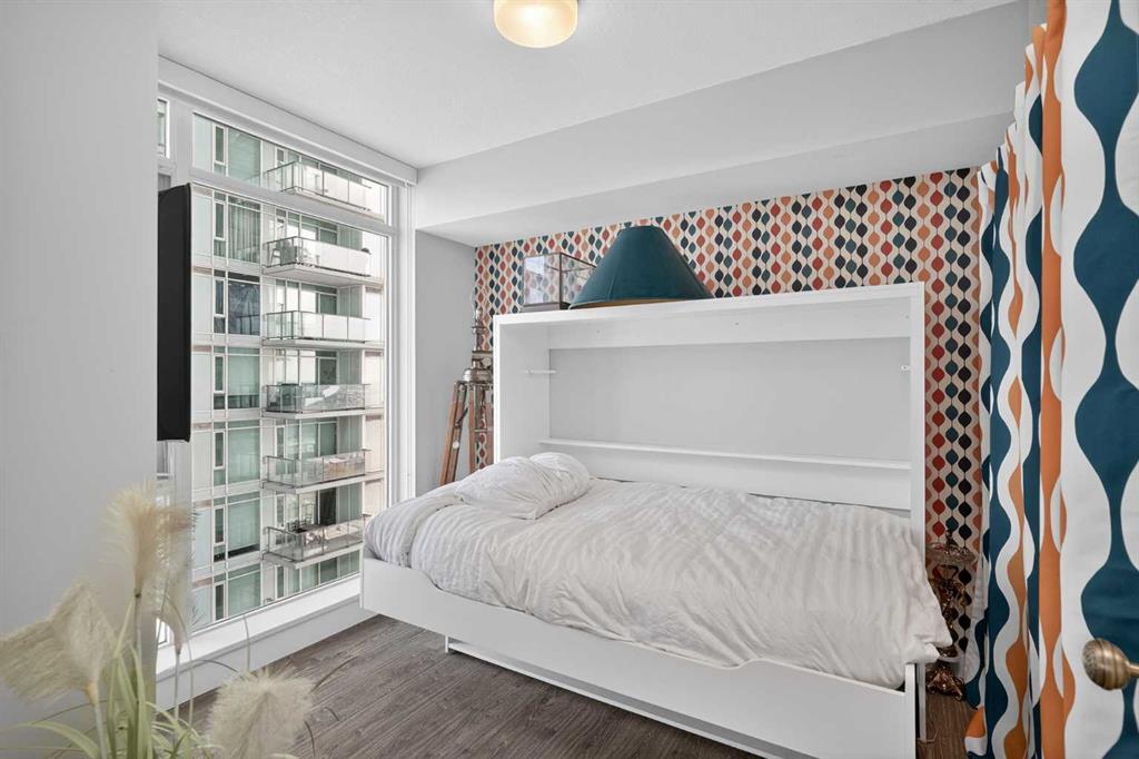 Welcome to the Gaurdian, South Tower. Truly one of Calgary's most sought after and spectacular buildings. This 2 bedroom, 2 bathroom home is unlike any other you have seen. Walking in you are greeted with gorgeous laminate floors, a white and gold feature wall and custom light fixtures. Entering into your open floor plan starts with your chef inspired kitchen with gold fixtures, custom built-in's in the cabinets and drawers, custom back splash, quartz counter tops and built-in stainless steel appliances. The large dining space is not something you normally find in a condo and is a great area to entertain or for quiet nights at home with the family. Your living room is a great size and offers you expansive VIEWS of DOWNTOWN, THE CALGARY TOWER, the MOUNTAINS, and connects to you west facing balcony. With this home being a corner unit you have amazing floor to ceiling windows offering views from every room. The primary bedroom is large enough for a king size bed as well as additional bedroom furniture and has a beautiful ensuite bathroom. The second bedroom is also a great size and has a custom MURPHY BED that was designed for the space and doubles as a home office. The second bathroom is custom designed and has a huge walk-in shower. The unit INCLUDES ALL TV'S AND MOUNTS as well as 2 TITLED SIDE BY SIDE UNDERGROUND PARKING SPACES!!!!! The Gaurdian has great amenities including a massive gym, social room, garden terrace, workshop, and is steps from the stampede grounds, great restaurants, shopping, bus and train routes giving you the best of downtown living. Do not miss out on your opportunity to own the most unique home in one of Calgary's most desired luxury buildings.