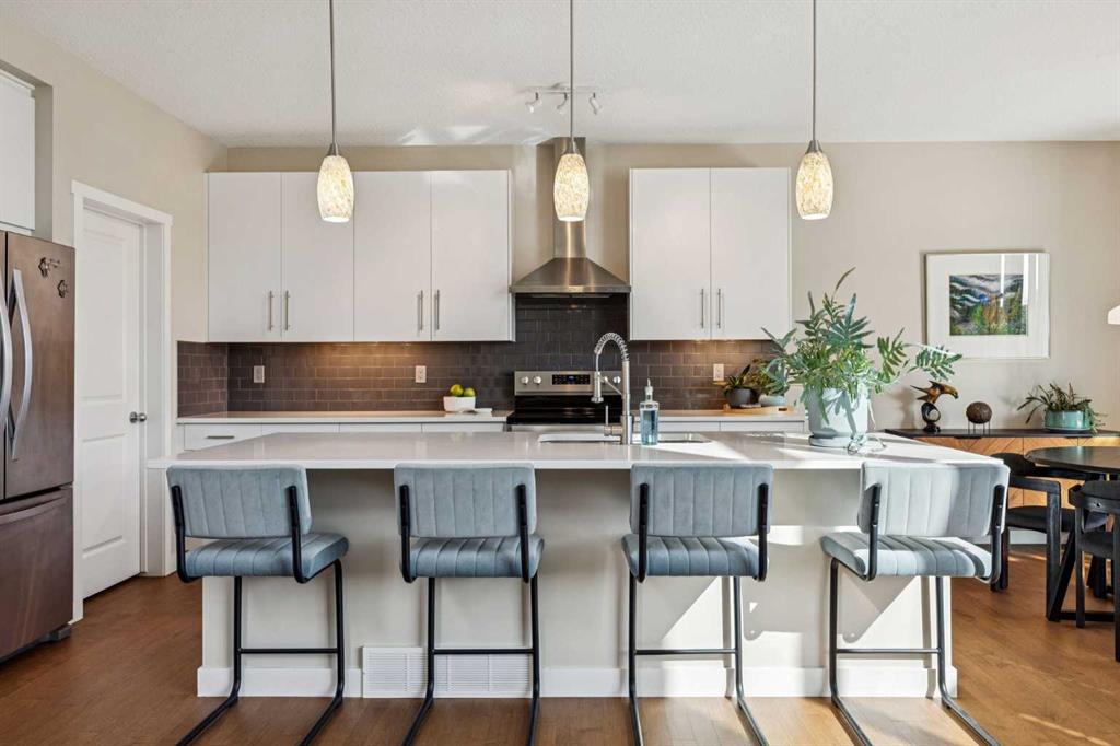 This beautifully updated two-storey with a fully developed basement offers over 3,000 sq ft of living space and an exceptional lifestyle. Perfectly situated on a spacious pie-shaped lot backing onto an alley, the property stands out with refreshed landscaping, raised garden beds framed in black iron, flourishing perennials, and a treated wood two-tier deck overlooking the yard. Patio doors open to the deck and are equipped with a retractable screen, allowing fresh air to flow through the home during warmer months. With plenty of space for summer BBQs, gardening, or even the potential for RV parking, the backyard is built for entertaining and family fun. Step inside and you are welcomed by a bright and inviting layout with 9-foot ceilings, hardwood, luxury vinyl plank, tile flooring, upgraded lighting, and thoughtful finishes throughout. The show-stopping great room boasts 18-foot ceilings, large windows that flood the space with natural light, and a dramatic gas fireplace surrounded by a wall of floor-to-ceiling stone. The chef’s kitchen offers sleek cabinetry, stainless steel appliances, a large central island, modern fixtures, and a walkthrough pantry conveniently connected to the mudroom and laundry. The open flow into the dining area makes this level ideal for both casual family meals and formal entertaining. A private office/den with French doors provides the perfect spot for working from home, and a stylish two-piece bath completes the main floor. Upstairs, you’ll find three spacious bedrooms including a primary suite with mountain views, a large walk-in closet, and a spa-inspired 5-piece ensuite with dual sinks, a soaker tub, and a separate shower. A bonus room with vaulted ceilings offers the perfect gathering place for family movie nights, a playroom, or simply a quiet retreat. A full 4-piece bathroom completes the upper level. The fully developed basement extends your living space with endless possibilities, featuring a spacious fourth bedroom and a 4-piece bathroom with tub/shower combination, making it ideal for guests, teens, or extended family. The remainder of the basement offers flexible space for a home gym, recreation area, or media room, along with generous storage. Additional highlights include LVP flooring on all three levels, gas stove hookup, custom blinds, a heated garage, upgraded interior and exterior lighting, a 75-gallon hot water tank, and a beautifully maintained exterior with a stained fence and deck. This move-in ready home combines style, comfort, and practicality in a highly sought-after community, an ideal fit for families looking to enjoy both space and modern upgrades.