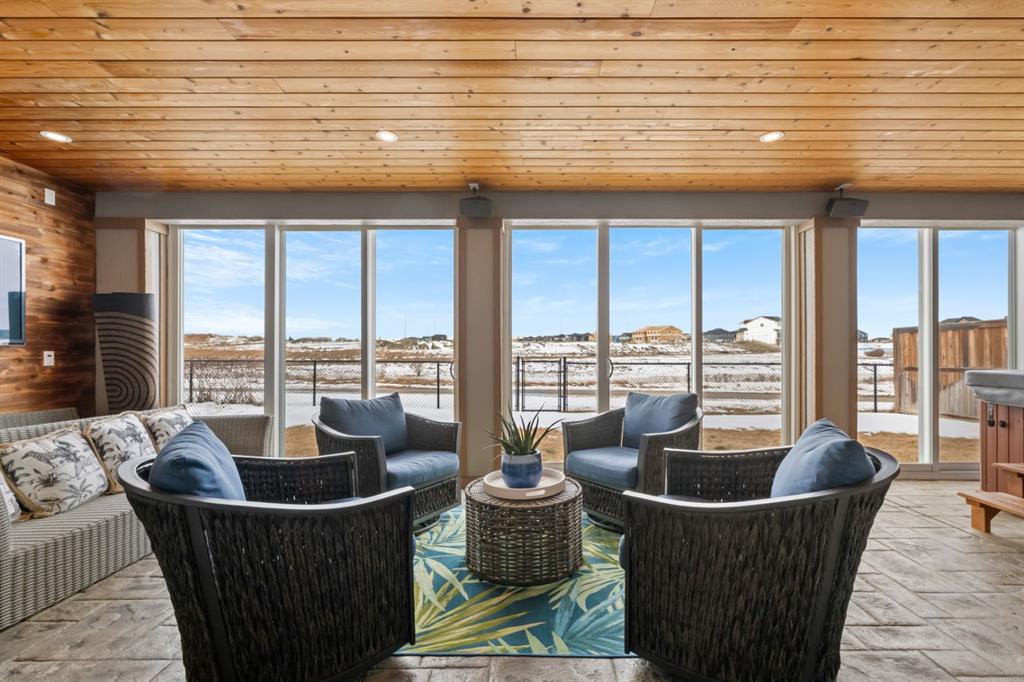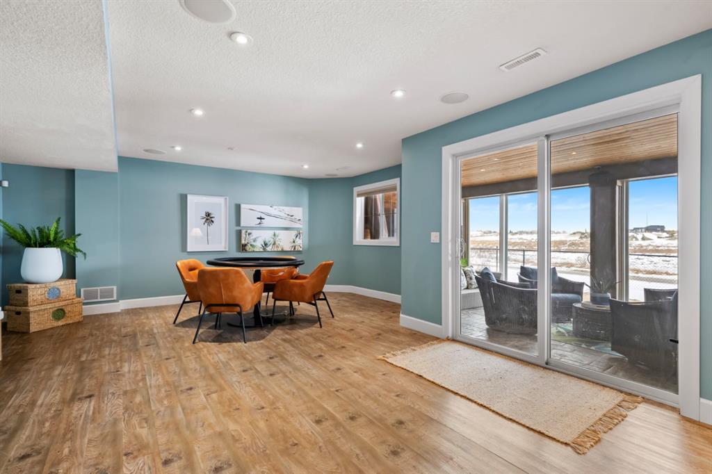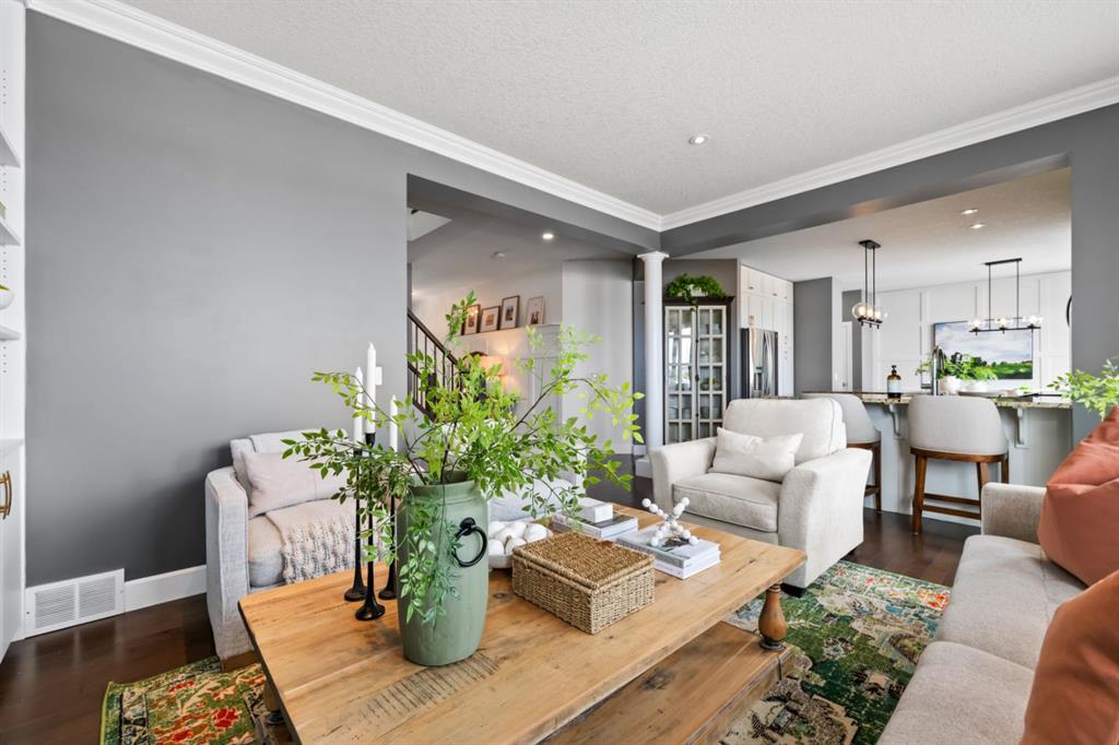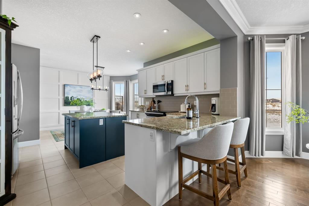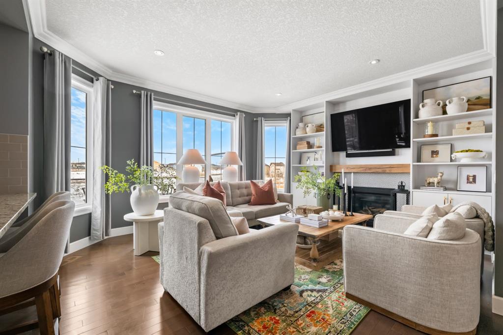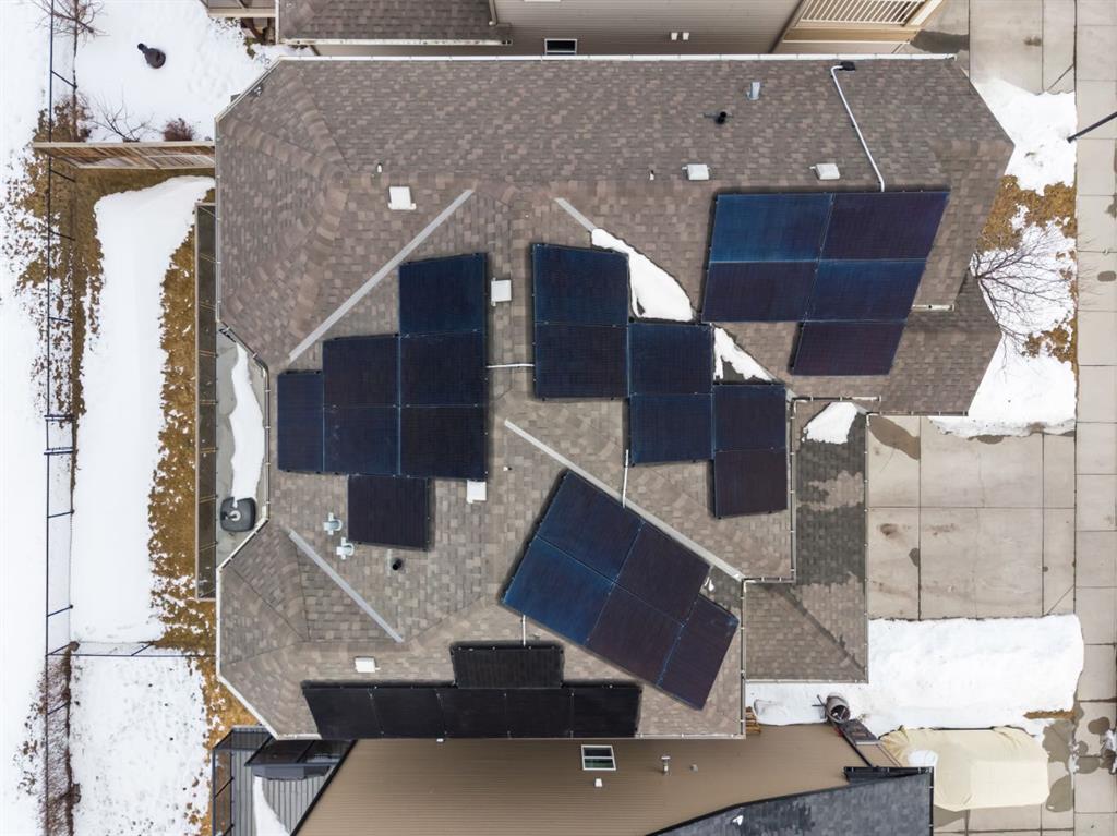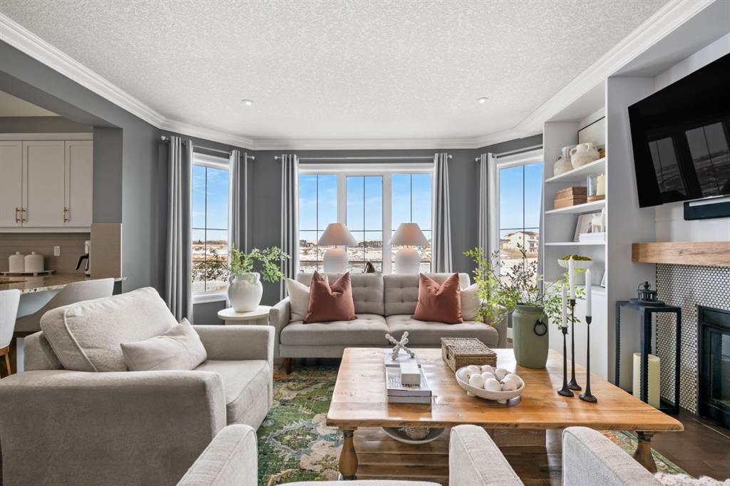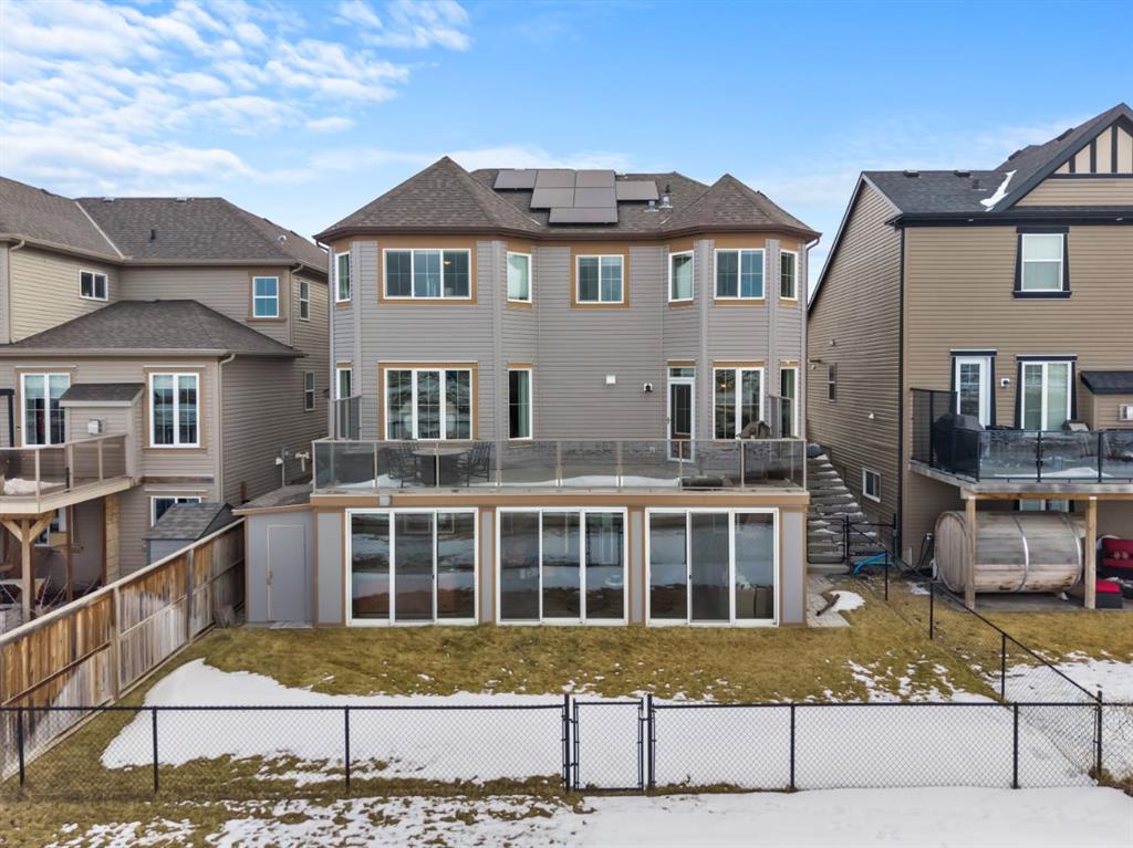 This exceptional executive two-storey walkout home offers over 3,000 sq. ft. of fully developed living space and backs onto a beautiful green space and a scenic pond which provides peaceful views and breathtaking sunsets. A spacious entryway welcomes you inside, where a bright flex room behind French doors creates the perfect home office or reading space. The main level features a sun-filled living room with west-facing windows, a cozy gas fireplace, and custom built-ins. The open-concept kitchen is designed for both everyday living and entertaining, showcasing a large granite island, ceiling-height cabinetry, stainless steel appliances, and recessed lighting. Step onto the oversized upper deck with a gas line for BBQ, perfect for enjoying the tranquil pond views. Upstairs you’ll find a spacious bonus room, upper-level laundry with a linen closet, and three generous bedrooms. The primary suite offers a walk-in closet and a spa-inspired ensuite with double vanities, a soaker tub, and a steam shower. Two additional bedrooms and a full bathroom complete the upper floor. The fully developed walkout basement adds incredible living space with a large recreation area and wet bar, an additional bedroom, full bathroom, and a bright sunroom with hot tub. There is direct access to walking paths along the pond and green space. Additional highlights include solar panels, air conditioning, a heated garage, irrigation system, permanent Govee exterior lighting, and concrete side stairs for convenient access. Ideally located close to parks, walking paths, a skate park, and pickleball courts. This home offers the perfect blend of space, comfort, and lifestyle.