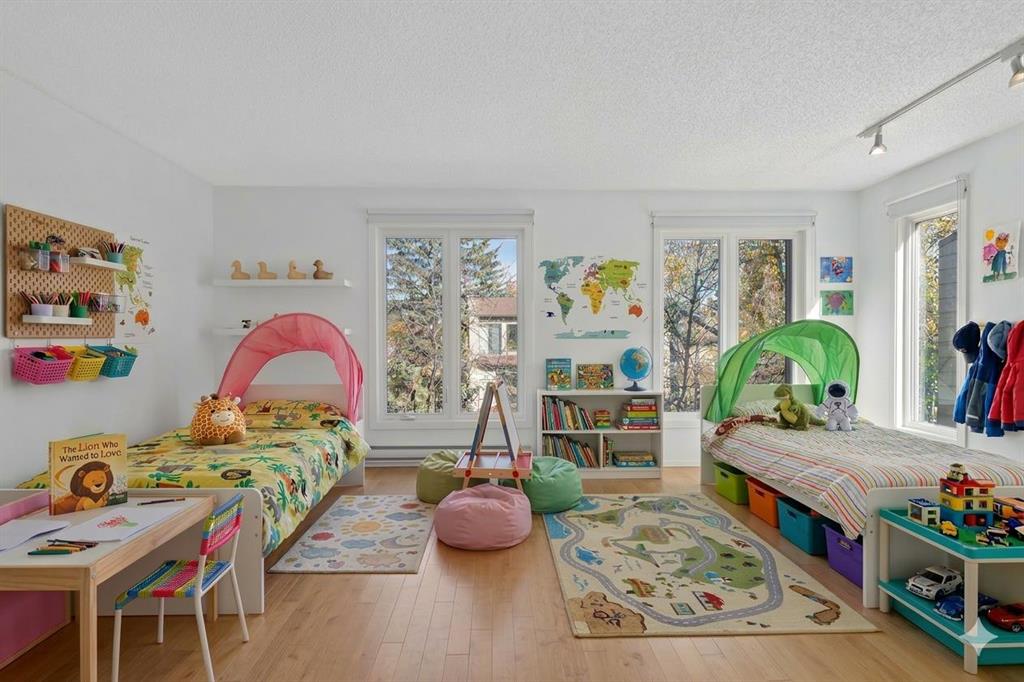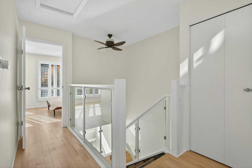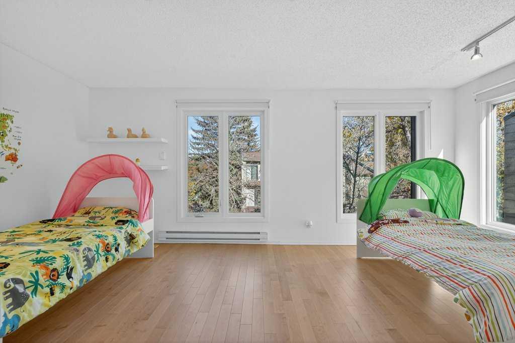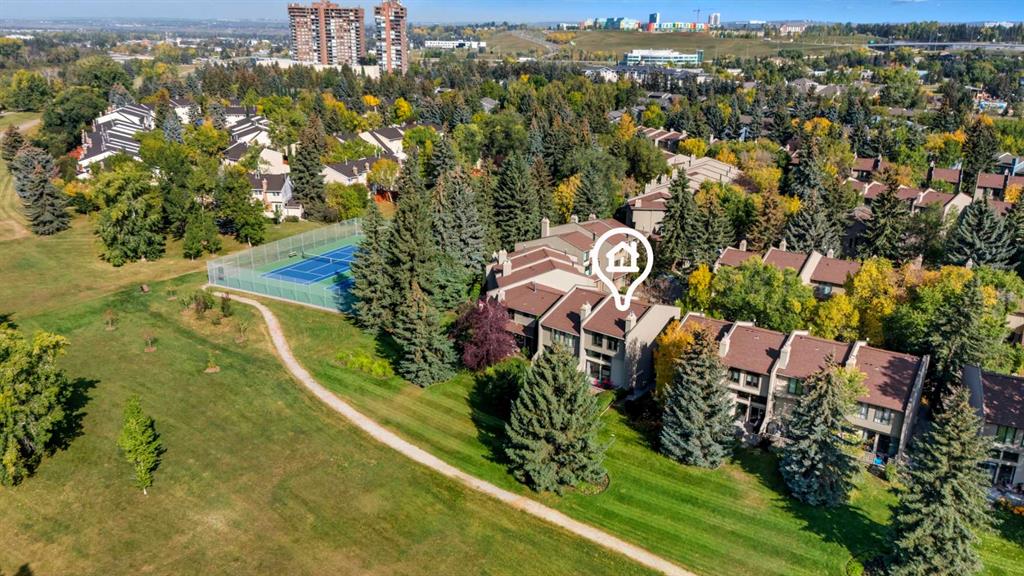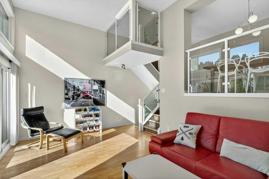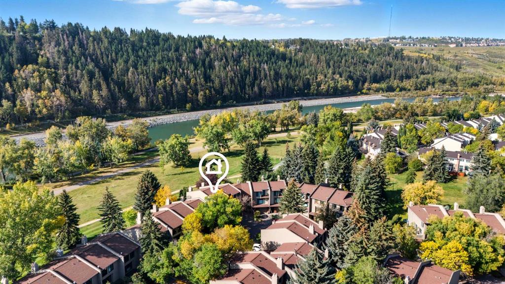 Experience inner city living in harmony with Calgary's natural beauty in this special riverside residence. A rare end unit (extra windows!), plus this townhome boasts larger windows and higher ceilings than neighboring complexes allowing natural light to stream in. The main level living room features vaulted ceilings and two gorgeous focal points: a sleek modern gas fireplace and the expansive (newer) triple pane windows which frame the greenspace and Bow River. Whether you are relaxing inside or stepping out onto the recently enlarged 200+ sq. ft. composite deck, the seamless connection to nature is unobstructed. Moving through the home, upgraded glass panel railings underscore the sense of openness. The upper main living area level offers a functional, updated kitchen with stainless steel appliances, a generous island, and a large pantry that also houses the laundry (no need to go all the way to the basement), alongside a nice sized dining room and half bath. The top level features two spacious bedrooms. The primary bedroom offers ensuite access and elevated open views of the twinkling Bow River - wake up to that scene every day! The second bedroom is an oversized space that could easily be divided to make a third bedroom. Because this is an end unit, three large windows keep this room exceptionally bright. The lower levels provide a welcoming foyer, a finished rec room for hobbies or exercise, and access to the heated single car garage with a workbench. A second car fits easily on the full length driveway, with guest parking nearby. This beautifully maintained community features hanging summer flower baskets and mature trees, creating a peaceful atmosphere with a strong sense of pride of ownership. For added value, the condo fee includes cable and internet, and the local tennis courts are a short walk west. Live your extraordinary life in this contemporary gem, nestled in the tranquil backdrop of the Bow.