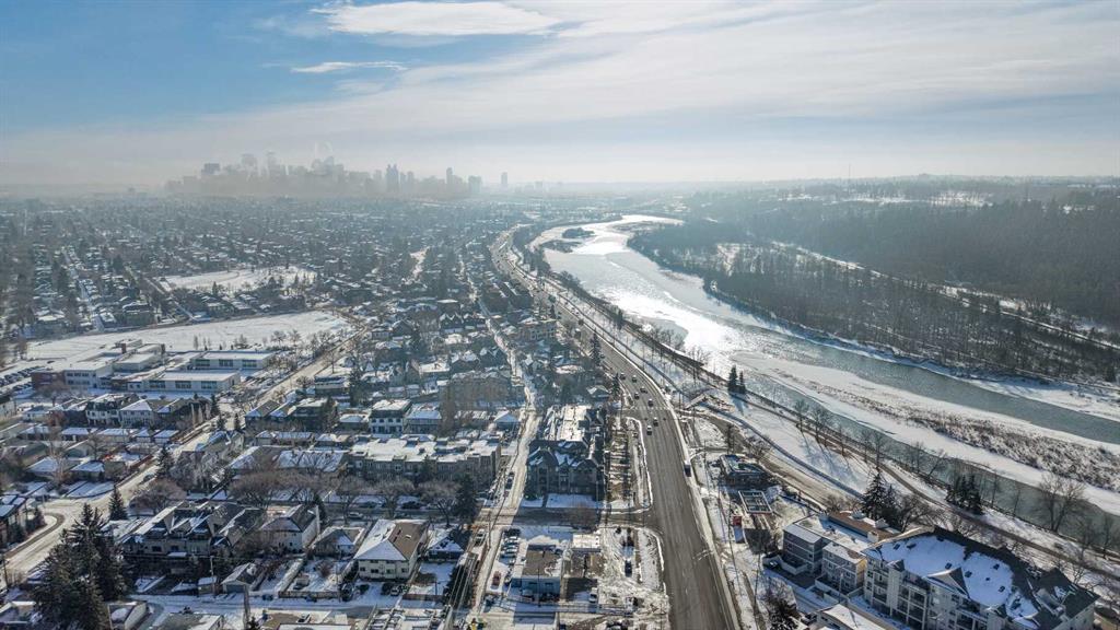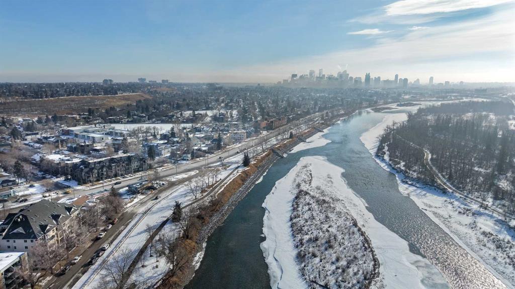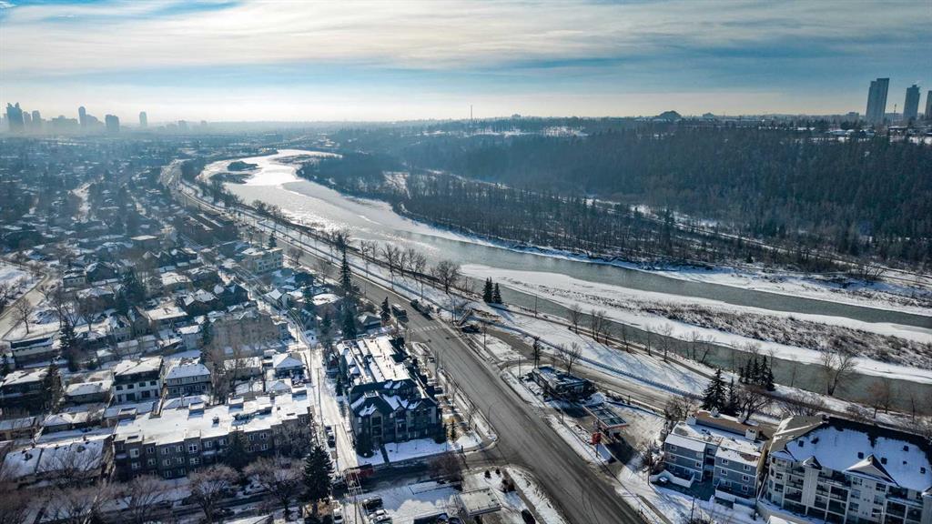 Welcome to The Riviera in Parkdale, offering refined inner-city living in one of Calgary’s most desirable riverfront communities. Ideally located directly across from the Bow River and its extensive pathway system, this location provides easy access to Kensington, Downtown, Foothills Hospital, and Alberta Children’s Hospital. This south-facing main floor 1 bedroom + den unit offers over 665 sq ft of thoughtfully designed living space with 9’ ceilings and large windows that fill the home with natural light. The modern kitchen features quartz countertops, quality appliances, a pull-out pantry, and a large island, opening seamlessly to the bright living area. Additional features include laminate flooring, in-suite laundry, central A/C, in-floor heating, central water softener, and extensive soundproofing. Enjoy the spacious south-facing patio with pleasant river valley views. The primary bedroom is bright and comfortable with convenient access to the 4-piece bath complete with a soaker tub. The Georgian-inspired Riviera building showcases a stunning lobby with 20’ coffered ceilings and elegant chandeliers, and the unit includes titled underground parking and an assigned storage locker. An excellent opportunity for professionals and investors seeking a premium location close to hospitals, downtown, shops, restaurants, and Calgary’s beautiful river pathways. Contact your favourite realtor today to book a showing!
