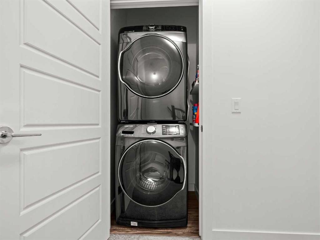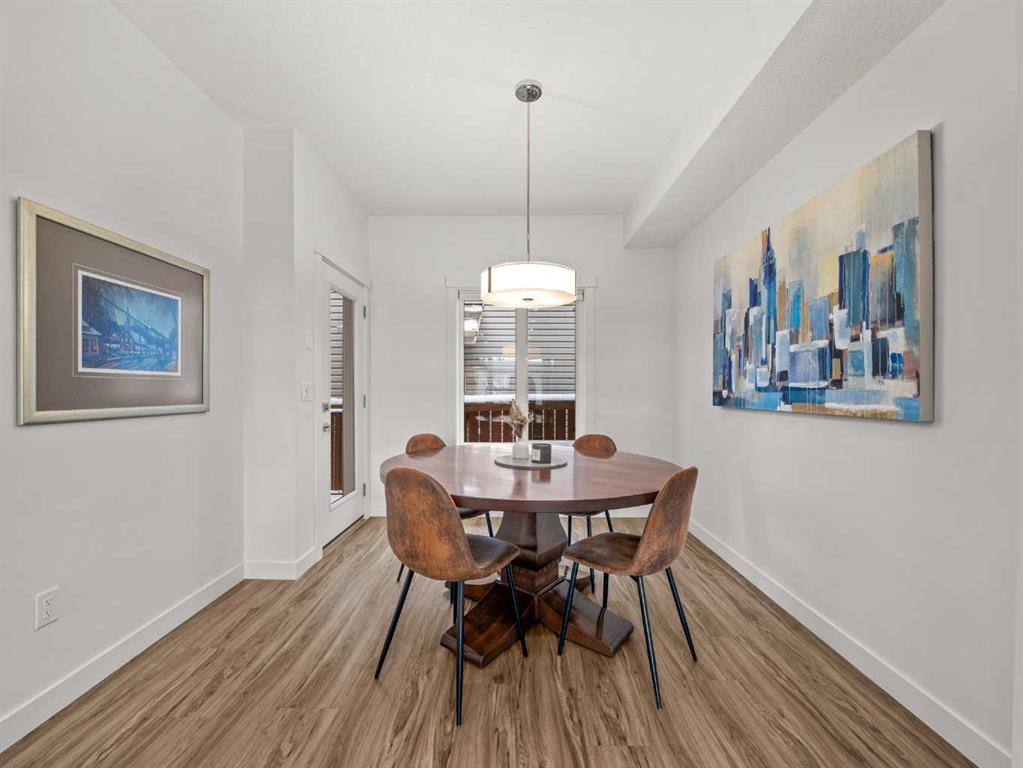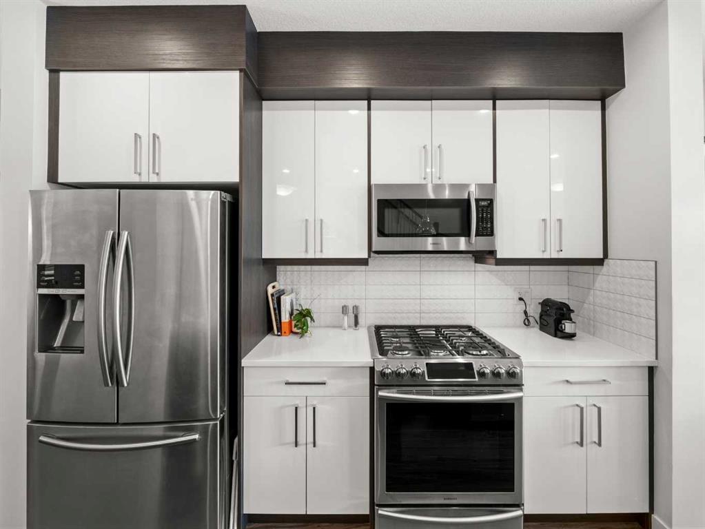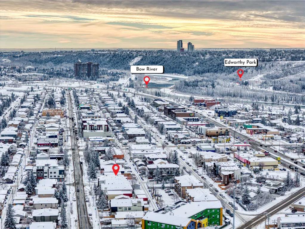 Well-designed townhome in Montgomery offering a great balance of space, light, and function. The open-concept main floor features a seamless flow between the living room, kitchen, and dining area. The living room has east-facing windows providing natural light throughout the day and a gas fireplace with built-in shelving and cabinets. The kitchen features a large island with an integrated sink, dishwasher, and drawers providing additional storage, offering ample prep and seating space for casual dining or entertaining. It comes with a stainless steel appliance package including a gas range and microwave hood fan. A convenient half bath completes the main floor. Upstairs are two bedrooms, each with its own ensuite bathroom. The primary bedroom features vaulted ceilings, a large window, and space for a desk or reading area. It is pre-wired for a wall-mounted television, and the adjacent private balcony provides a peaceful spot to enjoy the sunrise. The five-piece ensuite includes dual vanities with quartz countertops, a jetted soaking tub framed by tile, a glass and tile shower, and a skylight for added brightness. A walk-in closet connects directly from the ensuite. The second bedroom includes a walk-in closet accessed through its full four-piece ensuite. A stacked washer and dryer complete the upper floor. The finished basement adds a third bedroom, full bathroom, and generous storage with custom shelving under the stairs. The main floor, primary bedroom, and basement rec room are equipped with built-in speakers, each with independent volume controls. The home features central air conditioning installed in 2023 and a high-efficiency furnace. Outside, the front patio offers additional living space, while the backyard deck and gas hookup make it easy to set up a natural gas barbecue. One parking spot is assigned to the unit in one of the detached garage's spaces, with room for additional storage. With ample street parking available, the exterior visitor parking space has been converted into a dedicated area to store waste and recycling bins neatly away from the garage. Residents enjoy access to shared garden plots. This well-managed, self-administered condominium association maintains a healthy, fully funded reserve fund. Enjoy a convenient location with short walking access to Shouldice Athletic Park, the Bow River, and the Bow River Pathway. The home is also close to Edworthy Park and just a short walk from shops, restaurants, and cafés in University District, and Bowness Road. Quick access to Market Mall, Foothills & Alberta Children's Hospitals and the University of Calgary.