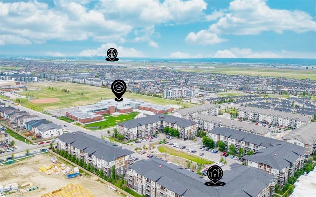 This modern ground-level, end unit offers the perfect blend of convenience and low-maintenance living, featuring 2 bedrooms, 2 full bathrooms, and a spacious walk-out covered patio. Ideally situated in a charming community, you’ll be within walking distance to Prairie Sky School, transit, and countless amenities—yet still able to come home to your quiet retreat. The ground-floor location allows for easy access while extending your living space outdoors, perfect for summer barbecues or relaxing evenings. Inside, the open-concept design is flooded with natural light from the extra windows only an end unit can offer. The contemporary kitchen is a chef’s delight with quartz countertops, full-height cabinetry, stainless steel appliances, and a peninsula island with breakfast bar, all overlooking the dining and living areas for seamless entertaining. The sunlit living room with large patio doors creates a warm, inviting atmosphere. Unwind in the spacious primary suite with a private 4-piece ensuite, while a second bedroom, another full bathroom, and in-suite laundry add comfort and practicality. Additional perks include heated underground parking and a storage locker. Located in the desirable Skyview Ranch community, you’ll be surrounded by parks, schools, shopping, and endless pathways—with quick access to Deerfoot and Stoney Trail. This immaculate home is truly move-in ready—just unpack and enjoy!
