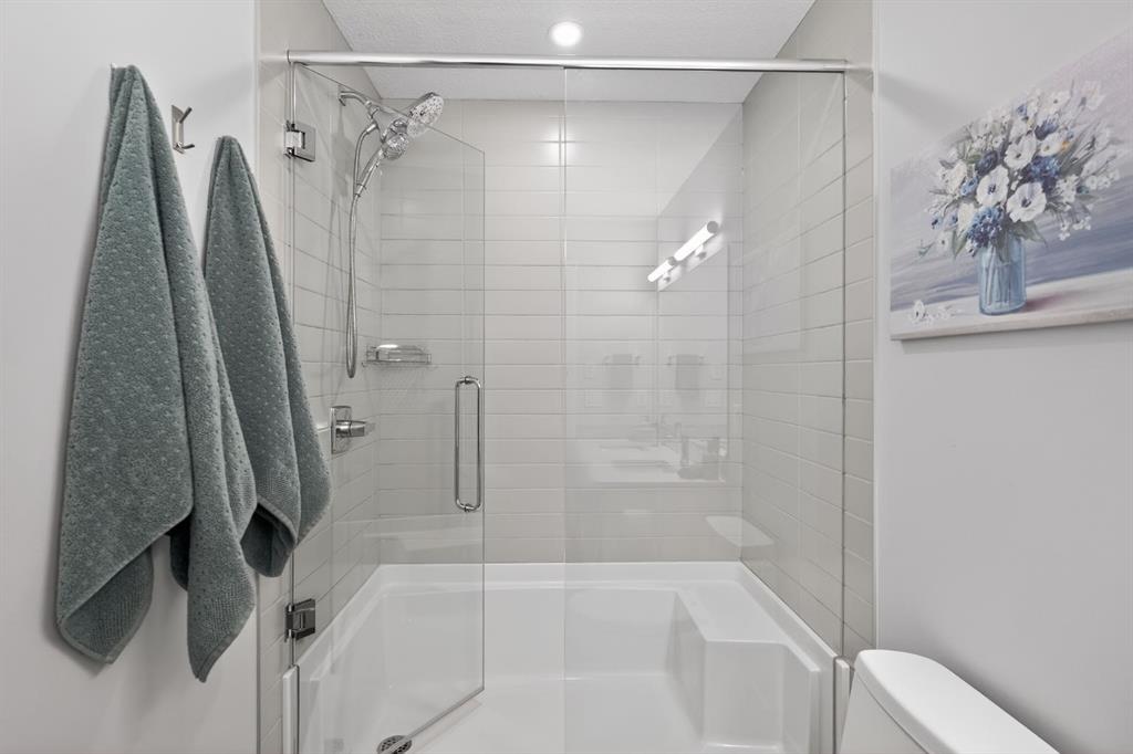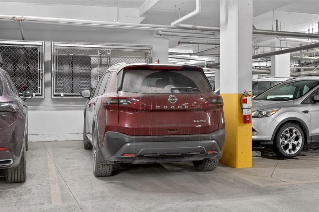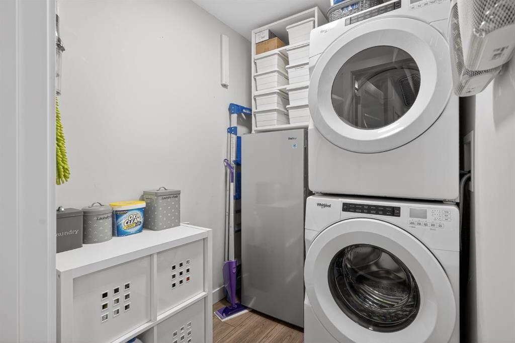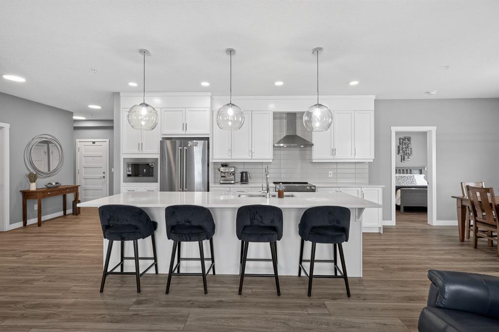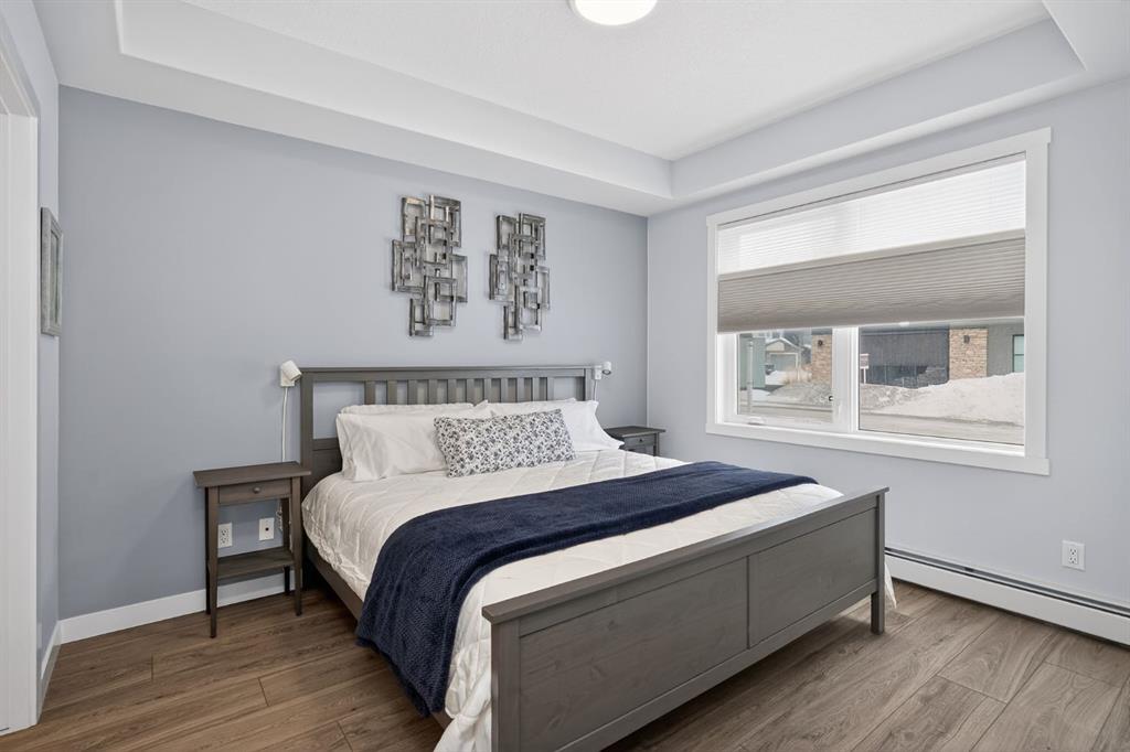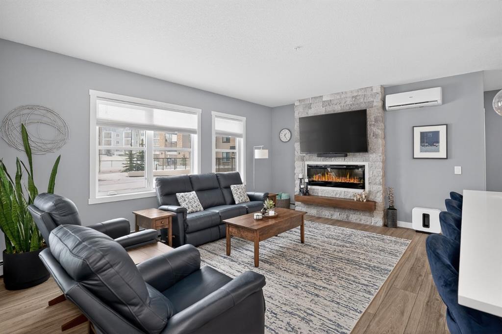 **Open House Sunday March 29th 1-3** Bright southwest corner unit with park views. One of the largest floorplans in Bow360, offering 1,174 sq ft of beautifully designed living space. Positioned on a desirable corner with windows on multiple sides, this home enjoys abundant natural light throughout the day and a more open, private outlook than many units in the building. Step outside to the expansive southwest wraparound patio with gas hookup, the perfect place to relax, entertain, or enjoy warm summer evenings while overlooking the surrounding green space. Inside, the open-concept layout showcases wide-plank luxury vinyl plank flooring, a striking floor-to-ceiling stone fireplace, and large windows that create a warm yet modern living environment. The seamless flow between the kitchen, dining, and living areas makes this home ideal for both everyday living and entertaining. The kitchen is thoughtfully appointed with upgraded cabinetry, quartz countertops, designer tile, stainless appliances, and a spacious central island, offering both functionality and style. The spacious primary bedroom comfortably accommodates a king-size bed and features a walk-in closet along with a private ensuite complete with dual sinks and an upgraded walk-in shower. A second bedroom and versatile den provide flexible space for guests, a home office, or hobbies. Additional highlights include remote blinds, air conditioning, in-suite laundry, titled underground parking, and quality finishings throughout. Located just steps from Fish Creek Park, the Bow River, Blue Devil Golf Course, extensive walking and biking paths, and a large off-leash dog park, Bow360 offers the perfect balance of nature and convenience with quick access to Stoney Trail and nearby amenities. One of the brightest corner locations in the building, this home offers exceptional space, natural light, and outstanding value in Wolf Willow.