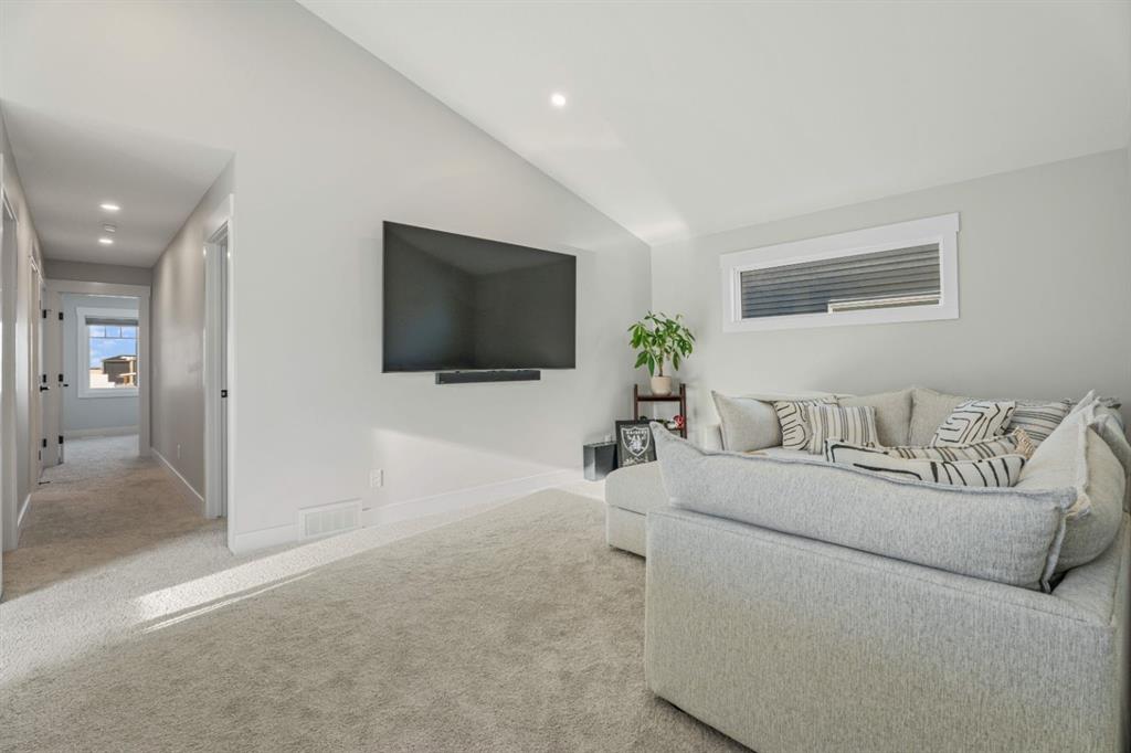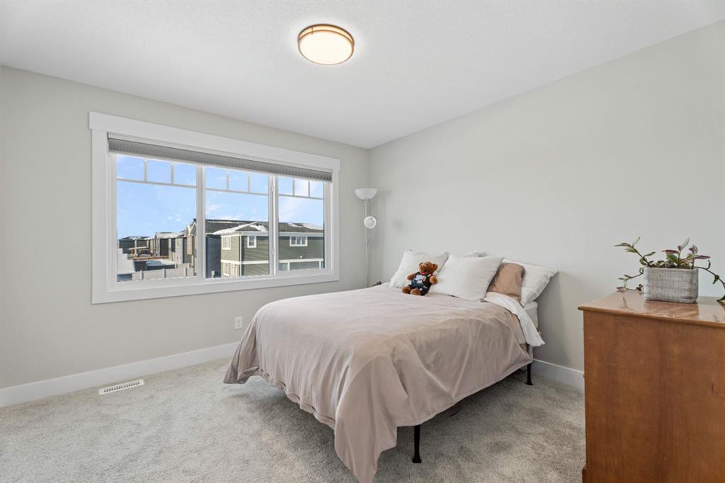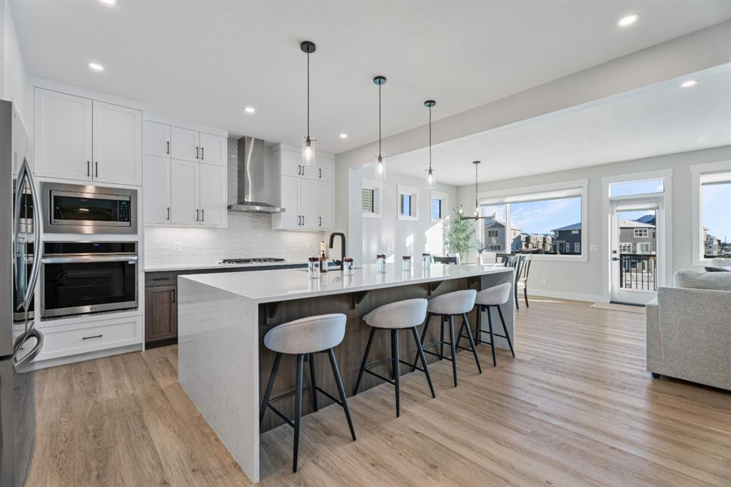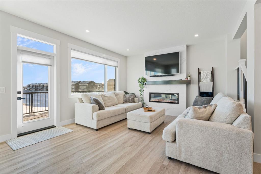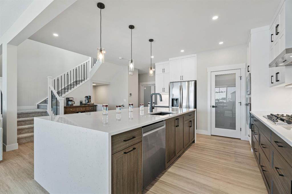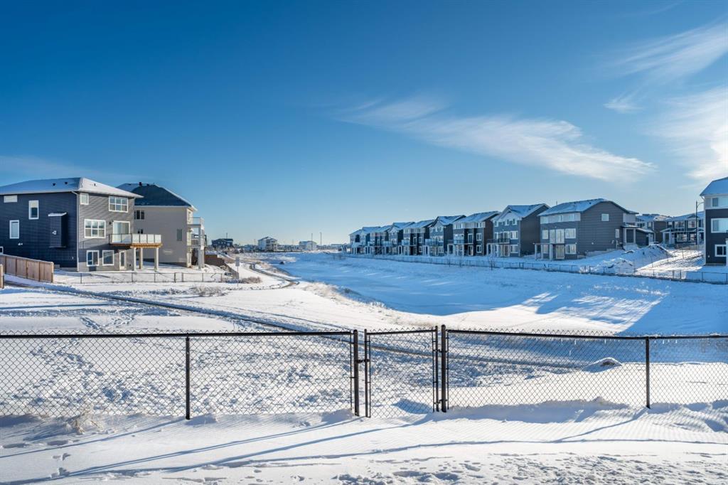 WELCOME TO 235 CHELSEA PARK, CHESTERMERE Nestled in family-friendly Chelsea Park, this stunning Anthem built home backs onto beautiful park space and a serene pond—your private oasis with no rear neighbors. Close to amenities and a future school, you'll enjoy the perfect balance of tranquility and convenience. The contemporary design with striking mountain blue siding, stone accents, and triple attached garage sets this home apart. Step through the bright, wide entry and discover over $108,000 in premium builder upgrades. Nine-foot ceilings on the main floor create an airy feel. Rich grey walls contrast beautifully with crisp white trim and luxury vinyl plank flooring. A private den with elegant French doors offers the perfect home office. The open-concept kitchen, dining room, and great room are designed for today's lifestyle. The show-stopping gourmet kitchen features a massive waterfall-edge island with brown cabinetry complemented by crisp white upper cabinets. The chef will love the gas cooktop, upgraded built-in wall oven and microwave in a stunning tower cabinet, French door fridge with WiFi, and large walk-in pantry. Custom tile backsplash extends to the ceiling, complementing beautiful quartz countertops. All black hardware, fixtures, and lighting add that executive touch. The spacious dining room showcases three large picture windows flooding the space with natural light and flows into the great room with a linear fireplace featuring floor-to-ceiling tile and dramatic black mantle. Step through to your extended deck with spectacular pond and park views. A stairway leads to the backyard and generous concrete patio—perfect for entertaining. Multiple gas line hookups mean you're ready for outdoor cooking year-round. Upstairs find your large primary bedroom—perfect for a king-sized bed—with generous walk-in closet and spa-inspired five-piece ensuite featuring heated floors, fully tiled walk-in shower with frameless glass, and soaker tub—all with executive black fixtures and quartz counters. Two additional generous bedrooms with walk-in closets share a five-piece bathroom. A vaulted bonus room with oversized picture window and upper-level laundry complete this floor. The walkout basement with 9-foot ceilings is roughed-in—bathroom plumbing ready, electrical outlets in place. The triple-insulated garage with gas rough-in offers workspace potential. Every detail matters: triple-pane windows, custom blind package, upgraded stacked kitchen cabinetry, executive black plumbing and lighting, luxury flooring, and quartz countertops throughout. More than just a home, this is where memories are made. Check out our virtual tour—you will not be disappointed. Welcome home.