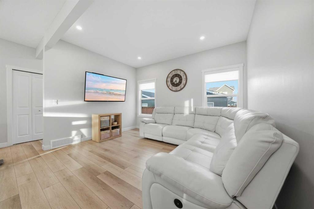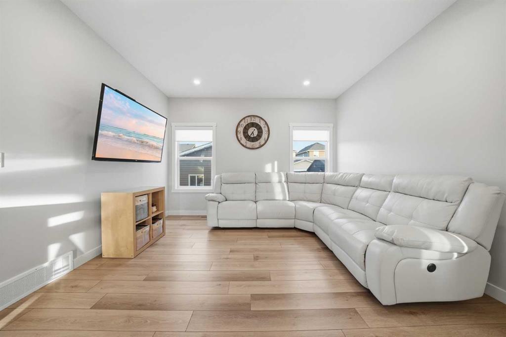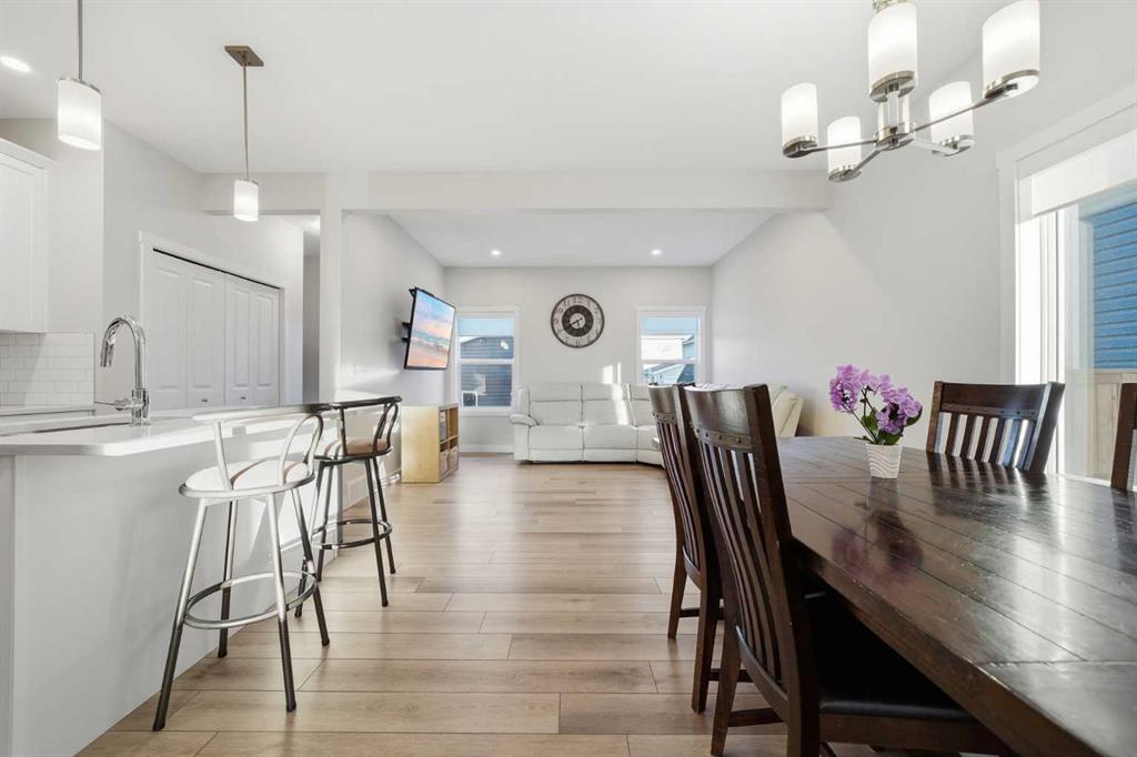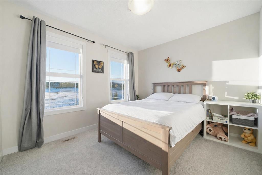 ** OPEN HOUSE SAT MAR 21 11AM-1PM ** Move-in ready and beautifully maintained, this stylish original-owner home offers nearly 2,500 sq. ft. of fully developed living space with thoughtful upgrades throughout. Perfectly positioned directly across from expansive greenspace, the home enjoys open views and an abundance of natural light from west-facing front windows, creating a bright and welcoming atmosphere from the moment you step inside. The main floor is designed for both comfort and connection, featuring a spacious living room highlighted by rich vinyl plank flooring and an inviting layout ideal for everyday living. The impressive kitchen is the heart of the home, complete with quartz countertops, stainless steel appliances, and a large central island perfect for gathering with family and friends. The generous dining area flows seamlessly to the backyard, where a sun-filled brick paver patio creates the perfect setting for morning coffee, summer barbecues, and relaxing evenings outdoors. Upstairs, the primary bedroom offers a stylish ensuite and ample closet space, while two additional bedrooms and a full bathroom provide flexibility for family, guests, or a home office. The fully finished permitted basement, completed in 2024, adds exceptional versatility with a comfortable rec room ideal for movie nights, a kids’ play area, or a quiet workspace, along with a spacious fourth bedroom. Additional upgrades include central air conditioning installed in 2022, extra-thick carpet underlay in the basement for added comfort, and a fully finished double detached garage with durable epoxy flooring that creates the perfect space for vehicles, storage, or a workshop. Located in the welcoming and family-friendly community of Bayview, this home is just steps from parks, playgrounds, scenic walking and biking paths, and conveniently close to schools, transit, shopping, and everyday amenities throughout southwest Airdrie. This exceptional property combines location, comfort, and quality upgrades, book your private showing today.