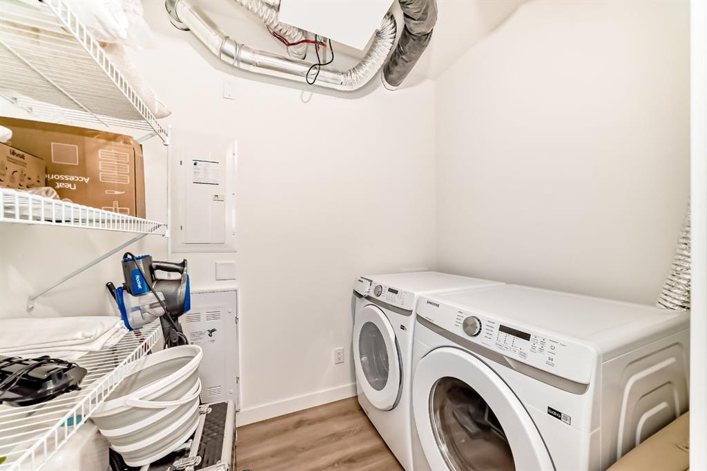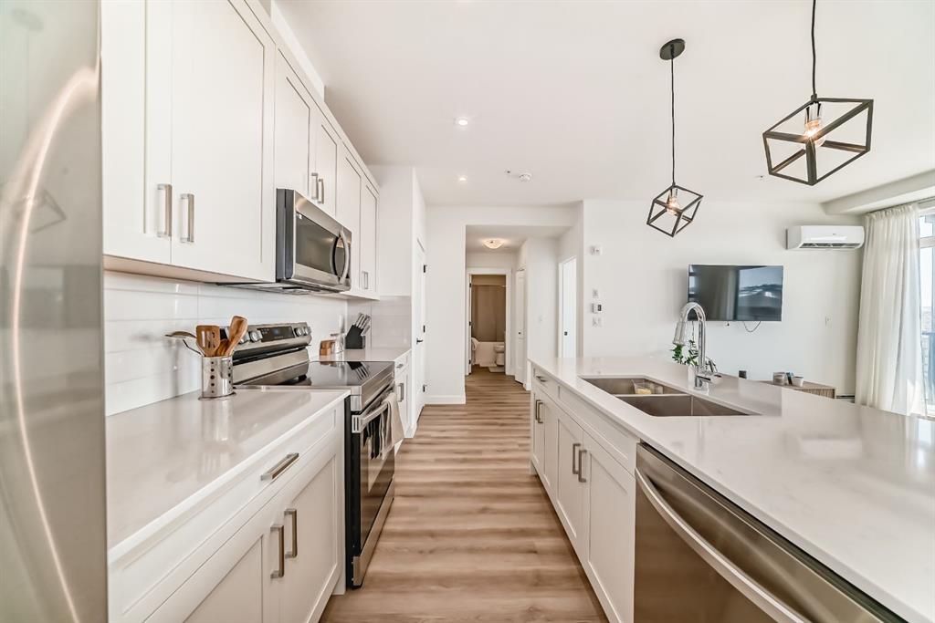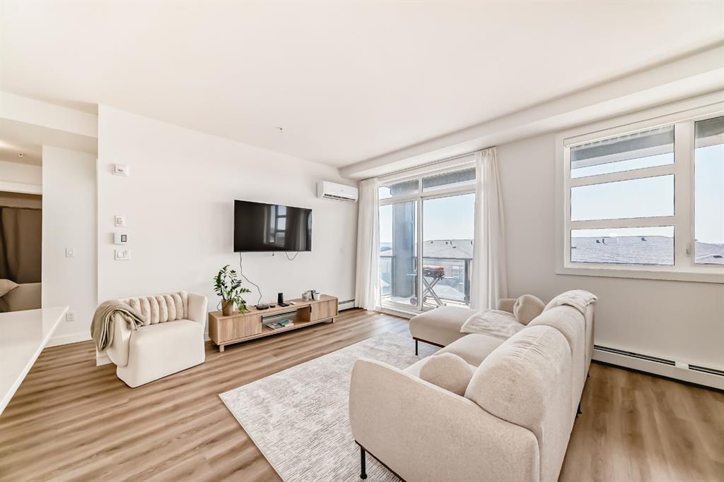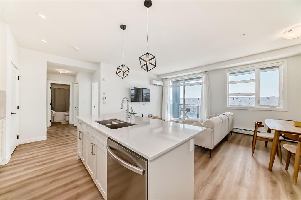 ** OPEN HOUSE SAT MARCH 28 & SUN MARCH 29, 2-4PM ** Bright west facing corner unit in Livingston, now attractively priced at $424,888. This beautifully designed 2 bedroom, 2 bathroom condo is located on the 3rd floor and offers an exceptional blend of style, comfort, and natural light. Step inside to a modern open concept layout that seamlessly connects the kitchen, dining, and living areas, creating a welcoming space for both everyday living and entertaining. The kitchen features sleek cabinetry, quartz countertops, stainless steel appliances, and a stylish backsplash. The spacious living room leads directly to the west facing balcony where you can relax and enjoy beautiful Calgary sunsets. The primary bedroom features a walk in closet, and a spa inspired ensuite with dual vanities and a glass stand up shower. The second bedroom sits conveniently next to the full main bathroom, making it ideal for guests, a home office, or a flex space. Additional features include air conditioning, luxury vinyl plank flooring, titled underground parking, and a secure storage unit. Located in the vibrant community of Livingston, residents enjoy access to parks, walking paths, and the impressive Livingston Hub with year round amenities. Now offered at $424,888, a number considered lucky and prosperous in many cultures, making this an exciting opportunity to own in one of Calgary’s fastest growing communities. Recently refreshed and priced to attract attention. Book your showing today.