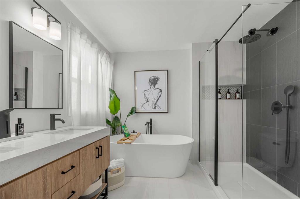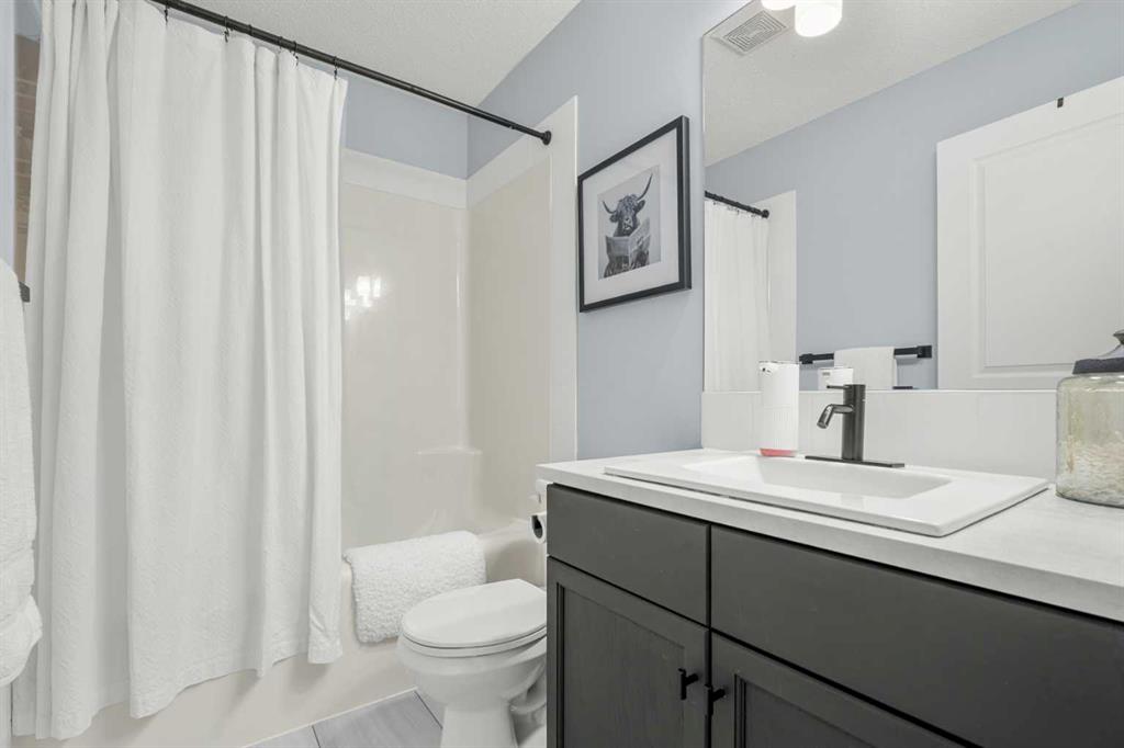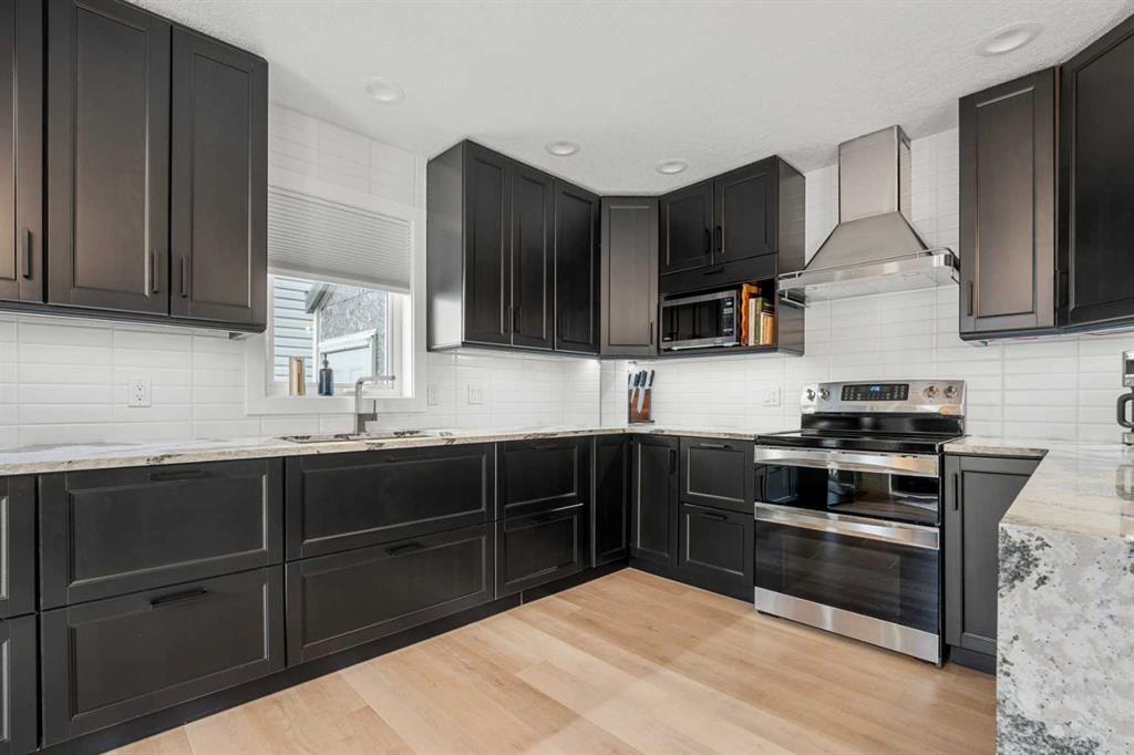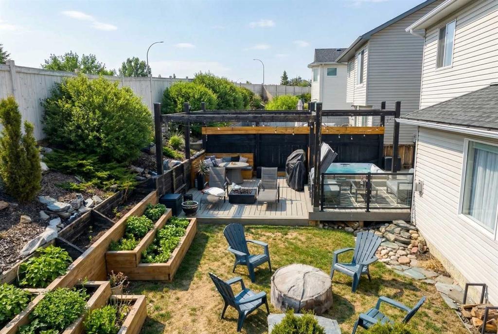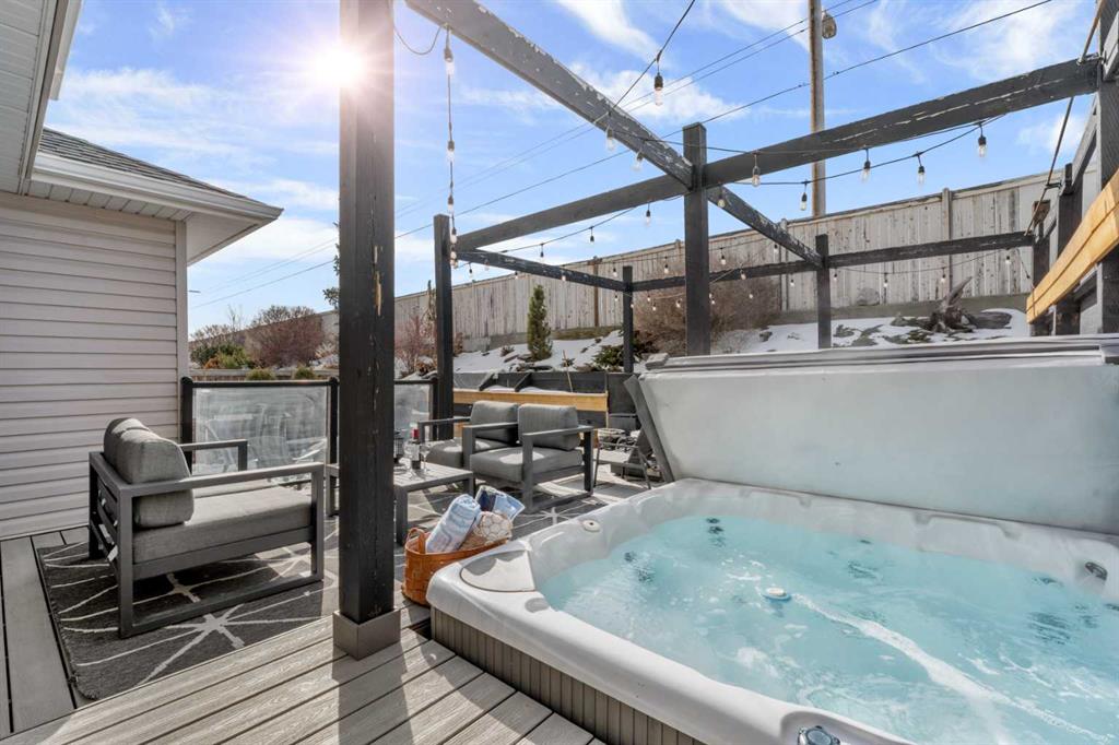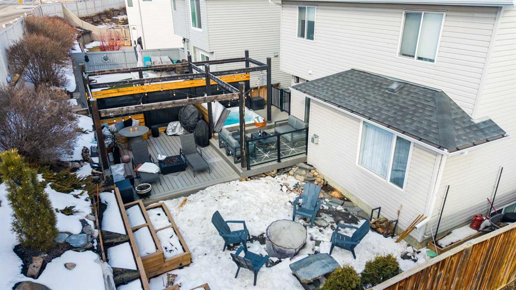 Welcome to this beautifully updated, top-to-bottom renovated home located in the desirable Fairways community of Airdrie, just minutes from Woodside Golf Course and conveniently close to Veterans Blvd NW, offering quick access to major routes, parks, and everyday amenities. This well-maintained property offers 3 spacious bedrooms upstairs, 2.5 bathrooms on the upper levels, plus a fully finished basement that includes an additional bedroom, a full bathroom, and a dedicated office space, making it perfect for growing families, remote work, or guests. Inside, the home showcases thoughtful upgrades throughout. The modern kitchen is designed for both functionality and style, featuring quality cabinetry, modern countertops, a stunning waterfall island, built-in dishwasher, stylish wine cabinet, and an electric range with double ovens, making it ideal for cooking, hosting, and everyday living. The primary ensuite has been beautifully renovated into a spa-like retreat, complete with a glass shower with built-in niche, upgraded plumbing fixtures, a relaxing standalone tub, and a stylish double vanity. The primary closet features a barn-style sliding door and built-in organizers, adding both character and practical storage. The fully finished basement adds valuable living space and includes a cozy electric fireplace, an additional bedroom, full bathroom, and a private office space, offering flexibility for work, guests, or extended family. Step outside to the true highlight of the home — the resort-style backyard, thoughtfully designed for relaxation and entertaining. The outdoor space features a pergola-covered seating area with privacy screen, a relaxing hot tub, cozy firepit area, raised garden beds, and a spacious deck perfect for gatherings. An L-shaped built-in bench seating area adds charm and functionality, creating the perfect place to host family and friends. Additional upgrades throughout the home include custom laundry storage, built-in closets, accent walls, upgraded baseboards, modern lighting fixtures, and stylish ceiling fans, giving the entire home a polished, move-in-ready feel. Located in one of Airdrie’s most family-friendly neighbourhoods, and just minutes from golf, parks, green spaces, and major roadways, this home offers the perfect combination of comfort, lifestyle, and convenience.