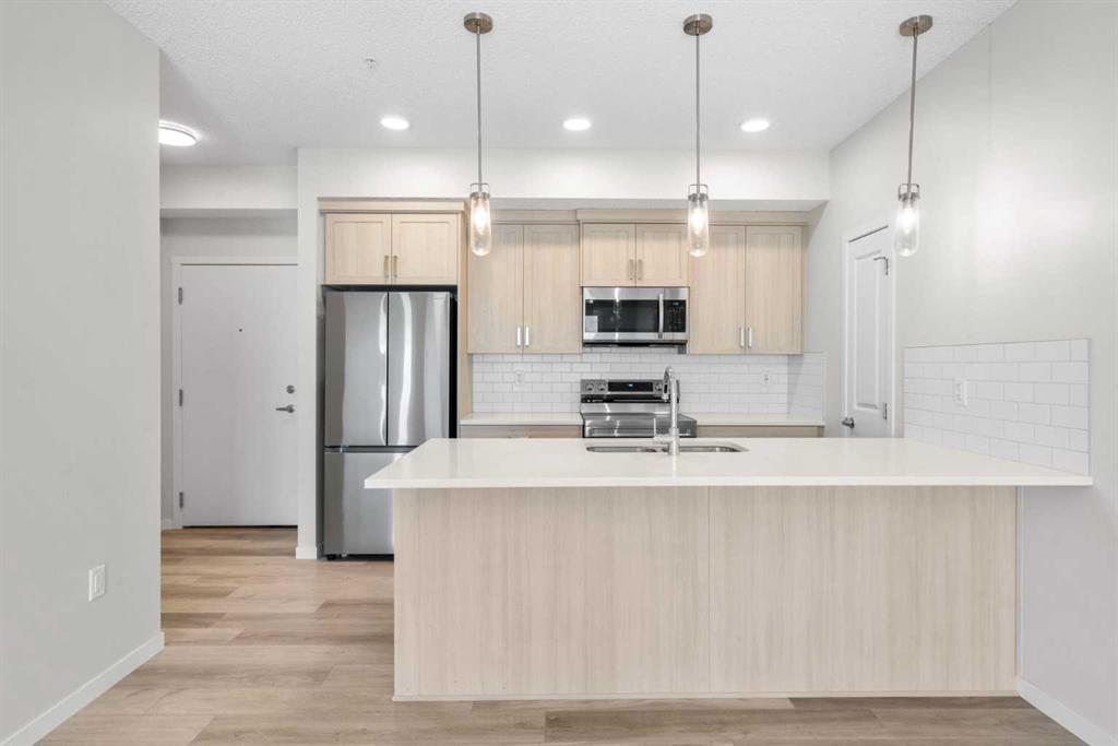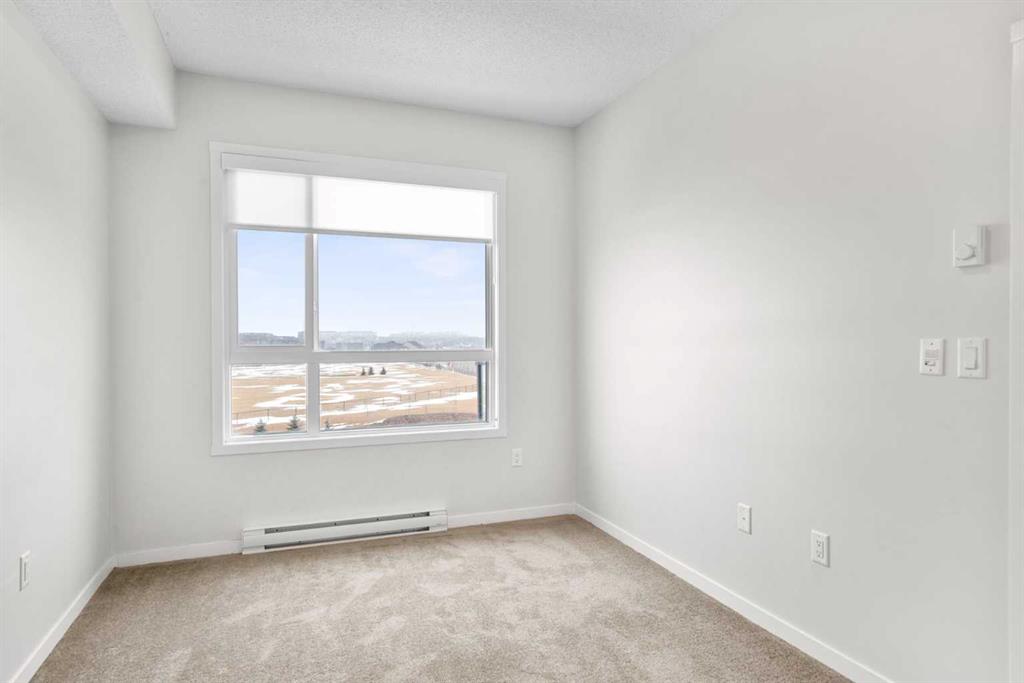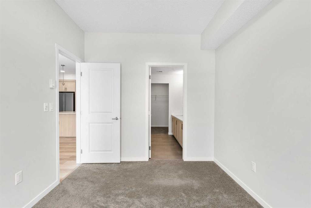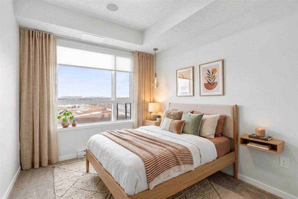 Modern, bright, and thoughtfully designed, welcome to this beautiful 2 bedroom, 2 bathroom condo in Carrington Plaza. Offering 842 sqft of well-planned living space, this east-facing unit enjoys excellent morning light and a unique sense of privacy thanks to the open field directly across the street, meaning no neighbours looking in. Inside, the open-concept layout creates an inviting flow between the kitchen, dining, and living areas, making the space ideal for both everyday living and entertaining. The modern kitchen features white quartz countertops, stainless steel appliances, light maple-toned cabinetry that extends to the ceiling, a white subway tile backsplash, pantry storage, and a convenient breakfast bar perfect for casual dining or morning coffee. Luxury vinyl plank (LVP) flooring runs throughout the main living areas, while the bedrooms offer soft carpeting for added comfort. One of the standout features of this home is the smart bedroom layout, with the two bedrooms positioned on opposite sides of the unit, ideal for privacy, guests, or a home office setup. The spacious primary bedroom easily accommodates a king-sized bed and connects to a walk-through area leading to your walk-in closet and private 4-piece ensuite. The ensuite features a full-sized shower and a double vanity with plenty of countertop space and storage. The second bedroom is also generously sized and includes its own walk-in closet, located just steps from the second full 4-piece bathroom with modern finishes that complement the rest of the home. Additional highlights include in-suite laundry with extra storage, a heated underground titled parking stall, and a separate storage locker. Located in the growing community of Carrington, you’ll enjoy quick access to Stoney Trail, major roadways, and nearby amenities, making commuting and everyday errands easy.