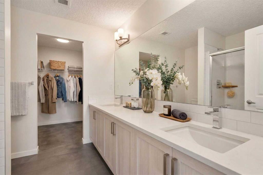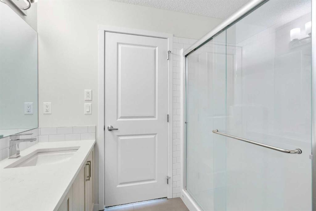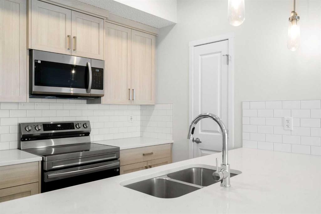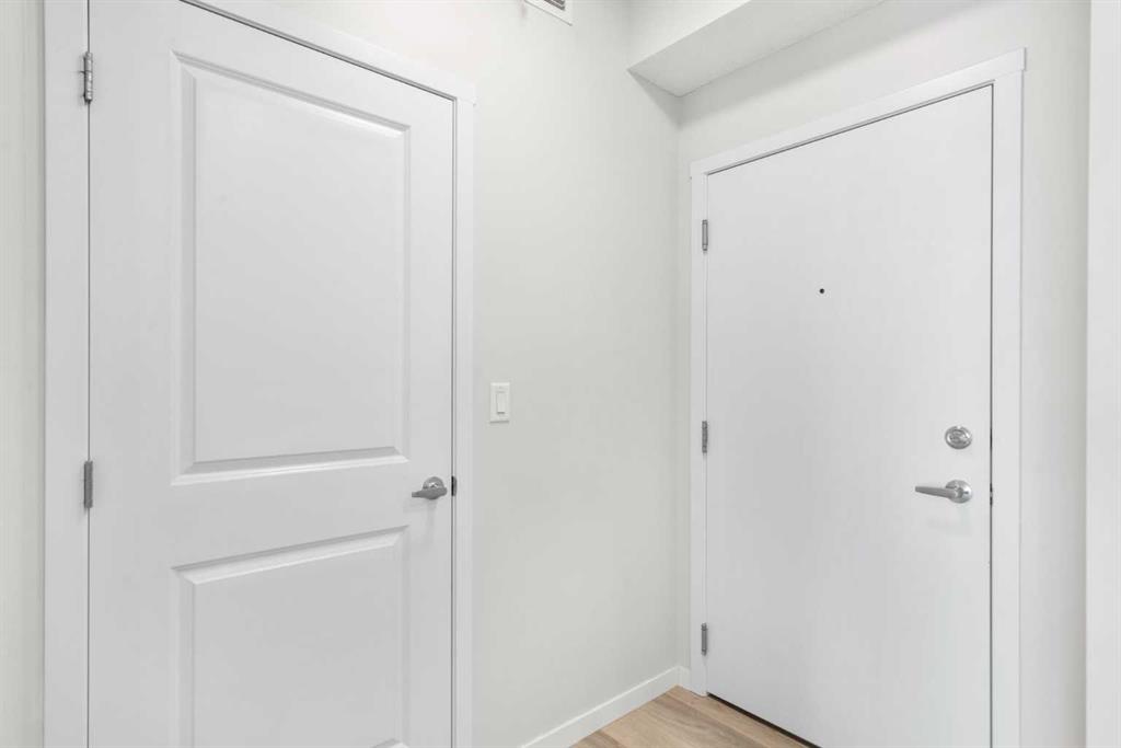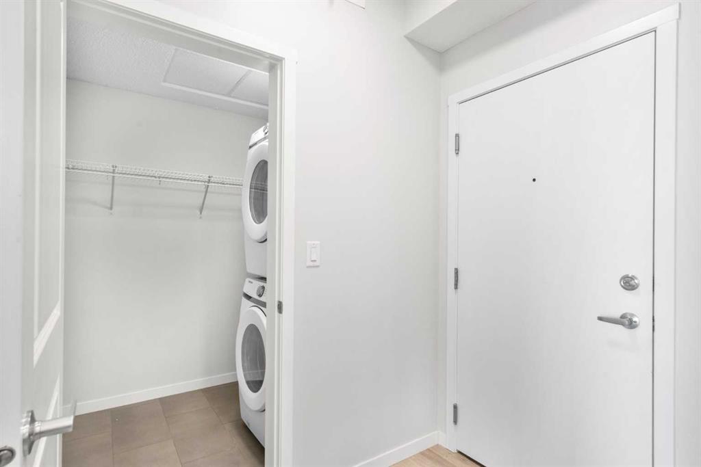 Modern, bright, and thoughtfully designed, welcome to this beautiful 2 bedroom, 2 bathroom condo in Carrington Plaza. Offering 842 sqft of well-planned living space, this east-facing unit enjoys excellent morning light and a unique sense of privacy thanks to the open field directly across the street, meaning no neighbours looking in. Inside, the open-concept layout creates an inviting flow between the kitchen, dining, and living areas, making the space ideal for both everyday living and entertaining. The modern kitchen features white quartz countertops, stainless steel appliances, light maple-toned cabinetry that extends to the ceiling, a white subway tile backsplash, pantry storage, and a convenient breakfast bar perfect for casual dining or morning coffee. Luxury vinyl plank (LVP) flooring runs throughout the main living areas, while the bedrooms offer soft carpeting for added comfort. One of the standout features of this home is the smart bedroom layout, with the two bedrooms positioned on opposite sides of the unit, ideal for privacy, guests, or a home office setup. The spacious primary bedroom easily accommodates a king-sized bed and connects to a walk-through area leading to your walk-in closet and private 4-piece ensuite. The ensuite features a full-sized shower and a double vanity with plenty of countertop space and storage. The second bedroom is also generously sized and includes its own walk-in closet, located just steps from the second full 4-piece bathroom with modern finishes that complement the rest of the home. Additional highlights include in-suite laundry with extra storage, a heated underground titled parking stall, and a separate storage locker. Located in the growing community of Carrington, you’ll enjoy quick access to Stoney Trail, major roadways, and nearby amenities, making commuting and everyday errands easy.