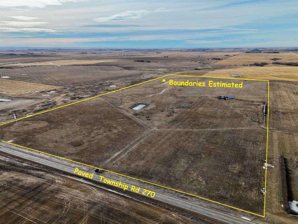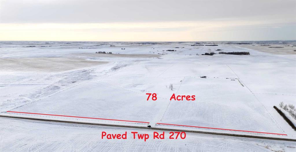Country Quiet, City Close! 78 Acres on PAVED Township Road 270 just east of Airdrie, Alberta. Combination of hay and pasture, with nice elevated building sites with Mountain, City and country views. Quick access to Airdrie, CrossIron Mills and Calgary. Ideal for quiet country living and home based business (by permit), A-SML Agricultural, Small Parcel District. 1,300' frontage on Township Road 270. East from Airdrie on Yankee Valley Boulevard/Township Road 270 past Airdrie Airpark and past Range Road 290, first approach east of MD #285079 on south side of the road. Livestock on the property, do not access without permission. GST may apply.