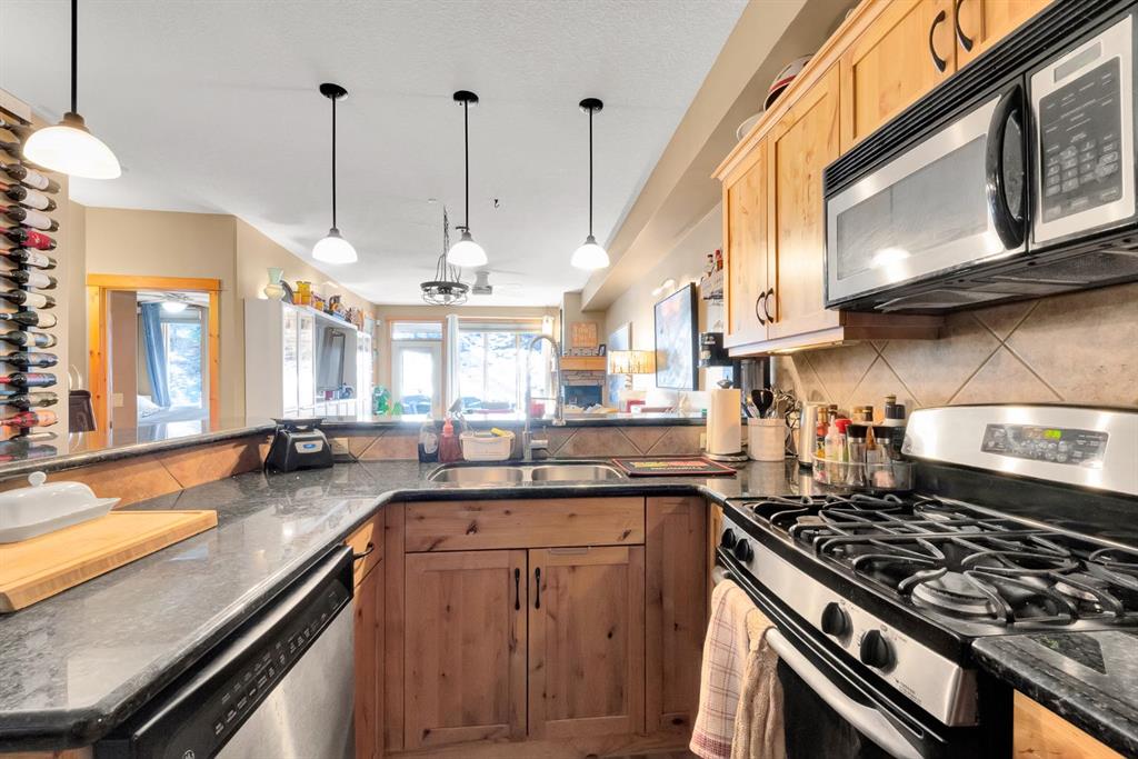 This 2 bed, 2 bath home in Canmore’s sought after Three Sisters community offers the perfect mix of comfort, function, and location. Inside, you’ll find exposed wood cabinetry, solid stone countertops, and matching wood trim, doors, and vanities that give the home a clean, mountain feel. The open layout includes a gas fireplace with exposed rock and a wooden mantle, plus loads of natural light and a primary suite with a 3 piece ensuite and walk in closet. Heated linoleum floors with in-floor radiant water heating keep things efficient and warm year round. Step outside to your private patio with a built in gas BBQ, great for winding down after a day in the mountains or entertaining friends and family. This unit comes with two heated, secured underground parking stalls and a large heated storage unit for all your gear. You're minutes to Stewart Creek Golf Course, downtown Canmore’s restaurants and shops, and right next to a network of hiking, biking, and walking trails. Banff National Park is just 15 minutes away, with four major ski resorts - Norquay, Sunshine, Nakiska, and Lake Louise, all within a 40 minute drive. A clean, well-kept home in a prime location - ready for full time living or a mountain escape.