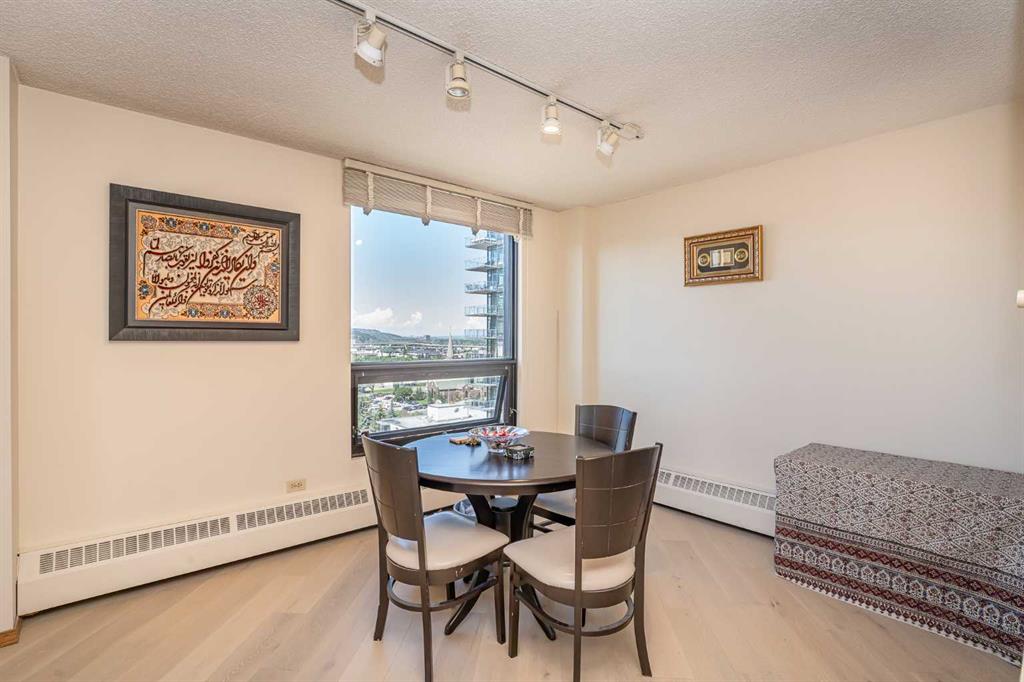 Experience elevated downtown living in this expansive 1,315 sq. ft. penthouse, located in a well-maintained concrete and brick building in Calgary’s vibrant Beltline. With sweeping city views, modern upgrades, and a highly walkable location, this 2-bedroom, 2-bathroom corner unit offers a rare blend of comfort, functionality, and classic charm. Inside, you will find hardwood flooring and a striking wood-burning fireplace with a marble surround. Oversized windows fill the spacious living and dining areas with natural light, creating a warm and inviting atmosphere. The well-maintained kitchen features generous cabinetry, a built-in wall oven and microwave, and a recently replaced refrigerator. The primary suite offers three closets and a spacious 4-piece ensuite with updated tile, flooring, and modern faucets. The second bedroom is adjacent to a fully renovated 3-piece bathroom with a standing shower, updated finishes, and contemporary fixtures. Enjoy panoramic downtown views from your private balcony. Additional features include a full laundry room, one underground parking stall, and a dedicated storage locker. This pet-friendly, professionally managed building is located just steps from the best of 17th Avenue, restaurants, cafes, shops, parks, and public transit. Penthouse units with this layout, level of care, and character are rarely available. Book your private showing today.