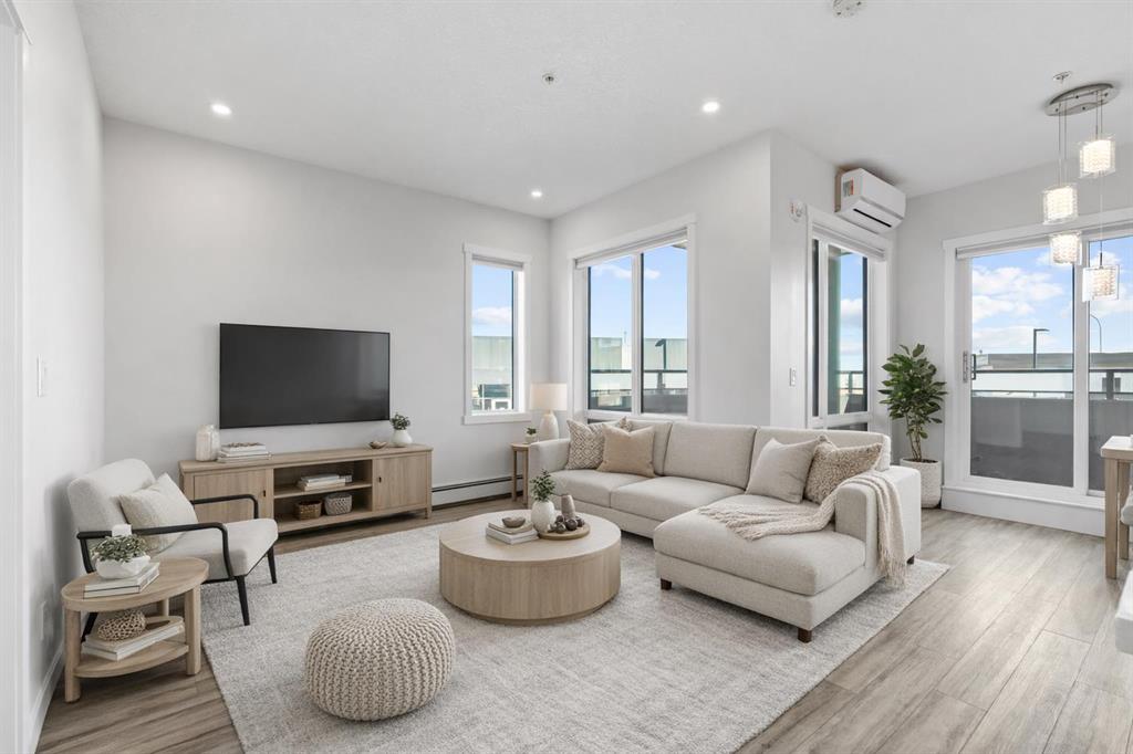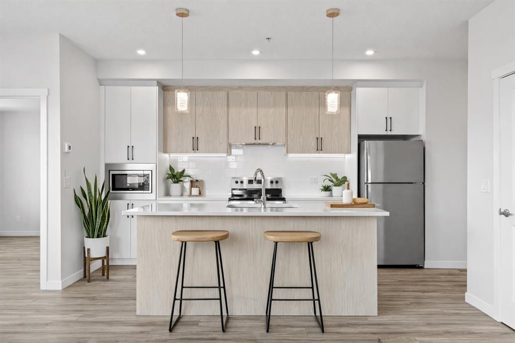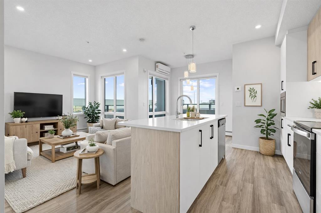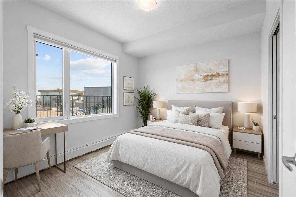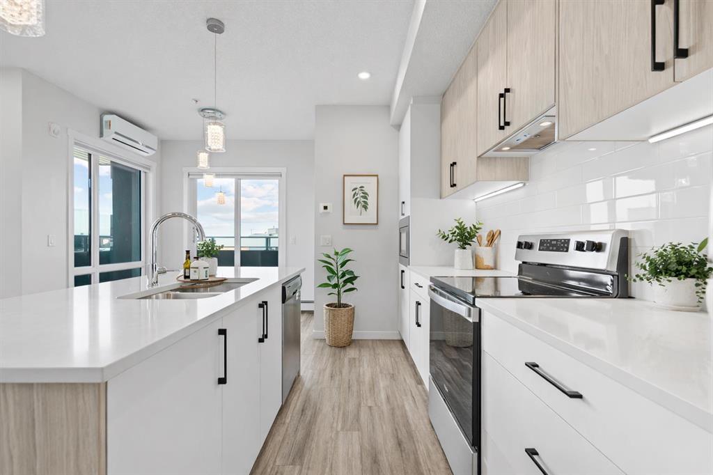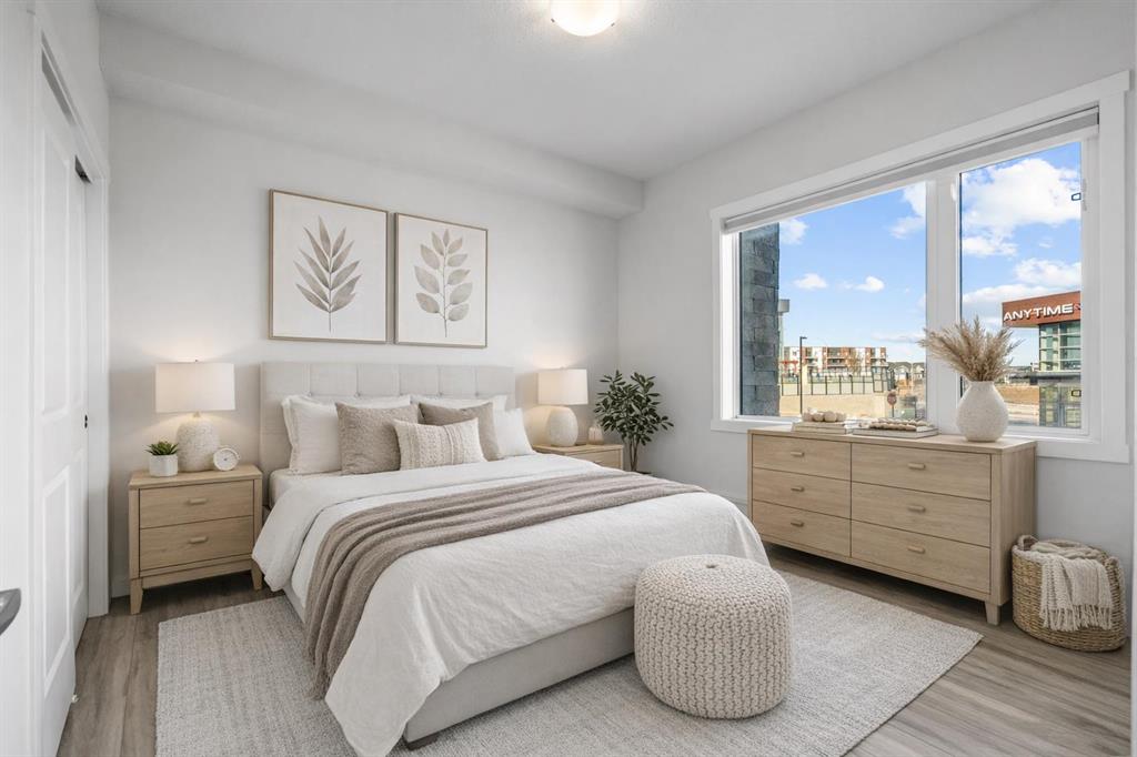 Welcome to this stylish CORNER, AIR CONDITIONED unit in Q Condos at Sage Hill NW, offering the perfect blend of privacy, upgrades, and unbeatable walkability. Although the unit is located on the ground level, it sits elevated and set back from the street, creating a private and secure outdoor space that feels more like a raised terrace than a typical ground floor patio. This bright, modern and clean 2-bedroom, 2-bathroom home features over 800 square feet of open concept living, enhanced by extra windows that fill the space with natural light throughout the day. This unit feels brand new! The thoughtful layout creates great separation between the bedrooms while the 9 ft ceilings add to the spacious, airy feel. The upgraded kitchen is both functional and elegant, showcasing quartz countertops, kitchen cabinets to the ceiling, stainless steel appliances, a slide-in electric range, and pot lights for a clean modern finish. Luxury vinyl plank flooring runs through the main living areas and the home also includes professionally installed window coverings throughout. One of the standout features of this home is the oversized L-shaped balcony with unobstructed views, offering a fantastic space for relaxing or entertaining. Comfort is further enhanced by an air conditioning unit, helping keep the home cool during Calgary’s warmer months. There is also a TITLED heated UNDERGROUND parking spot + TITLED heated underground STORAGE. The location is a major highlight. You are just a one minute walk to Sage Hill Crossing, where you will find everyday conveniences including Co-op grocery store, Shoppers Drug Mart, Canada Post, Tim Hortons, Anytime Fitness, childcare services, Golf Sweet indoor golf, and numerous restaurants and shops. The home also offers quick access to Stoney Trail and Deerfoot Trail, making commuting easy, while downtown Calgary is approximately 20 minutes away. Scenic walking paths, parks, and playgrounds are also close by. Whether you are a first-time buyer, downsizer, or investor, this well-designed condo offers modern comfort, privacy, and a location that is hard to beat in one of NW Calgary’s most convenient and growing communities. Book your showing today and experience everything Sage Hill living has to offer! NOTE: for pets - max 1 pet unit allowed. View our 3D iGuide Virtual Tour!!