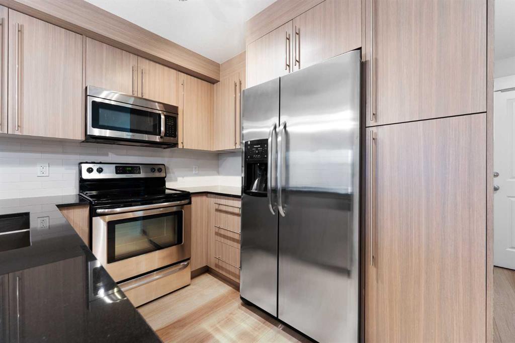 Discover easy, modern living in the heart of Mahogany—one of Calgary’s most desirable lake communities where lifestyle, recreation, and everyday convenience blend seamlessly. Situated in the thoughtfully designed 51 Oak complex, this freshly painted third-floor condo offers a stylish and low-maintenance home in a peaceful, well-kept setting. Built around a beautifully landscaped central courtyard, the development features three carefully planned buildings that create a quiet and welcoming environment from the moment you arrive. Inside, this bright and spacious 2-bedroom home offers an efficient and comfortable layout designed for everyday living. Fresh flooring installed in 2025 brings a crisp, updated feel throughout the space. The open kitchen is both functional and attractive, featuring gleaming stainless steel appliances—including a refrigerator with water and ice—along with granite countertops, a deep double sink with a bistro-style faucet, tall cabinetry, and a classic subway tile backsplash. A convenient breakfast bar seamlessly connects the kitchen to the main living area, creating a natural hub for casual dining, relaxing, or hosting guests. Large windows invite in an abundance of natural light while overlooking the peaceful courtyard below, adding to the bright and airy atmosphere of the home. The bathroom offers a contemporary vessel sink and a deep soaker tub—perfect for relaxing at the end of a long day. Everyday convenience continues with the inclusion of an in-suite stackable front-load washer and dryer. Step outside onto the generously sized balcony, an ideal spot to enjoy your morning coffee, unwind with an evening drink, or simply take in some fresh air throughout the day. Parking and storage are simple and secure thanks to the titled underground stall and attached storage locker—providing valuable space for seasonal items, tools, and outdoor gear. Living in Mahogany means enjoying access to an exceptional range of community amenities. Residents can take advantage of the private lake for swimming, skating, and fishing, along with beautiful beaches, tennis courts, scenic ponds, and an extensive network of walking paths. The community also hosts vibrant events throughout the year, creating a true neighborhood atmosphere. Everyday essentials—including grocery stores, shops, restaurants, and services—are just minutes away. Whether you’re a first-time buyer, downsizer, or investor, this well-kept and move-in-ready condo offers an outstanding opportunity to enjoy the best of Mahogany living in a comfortable and well-connected home.