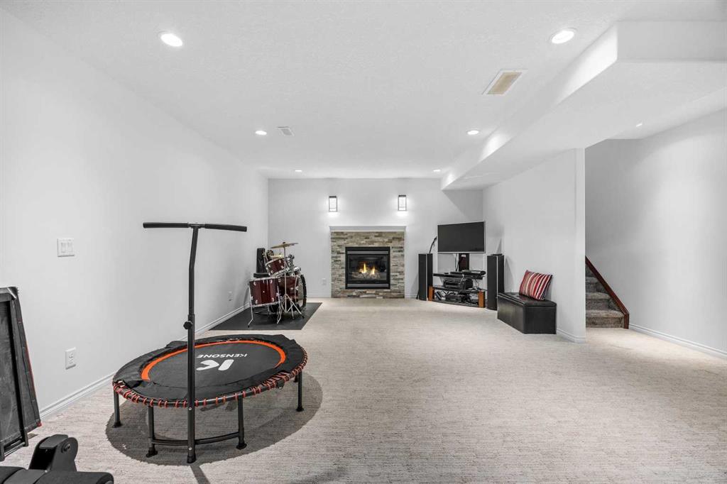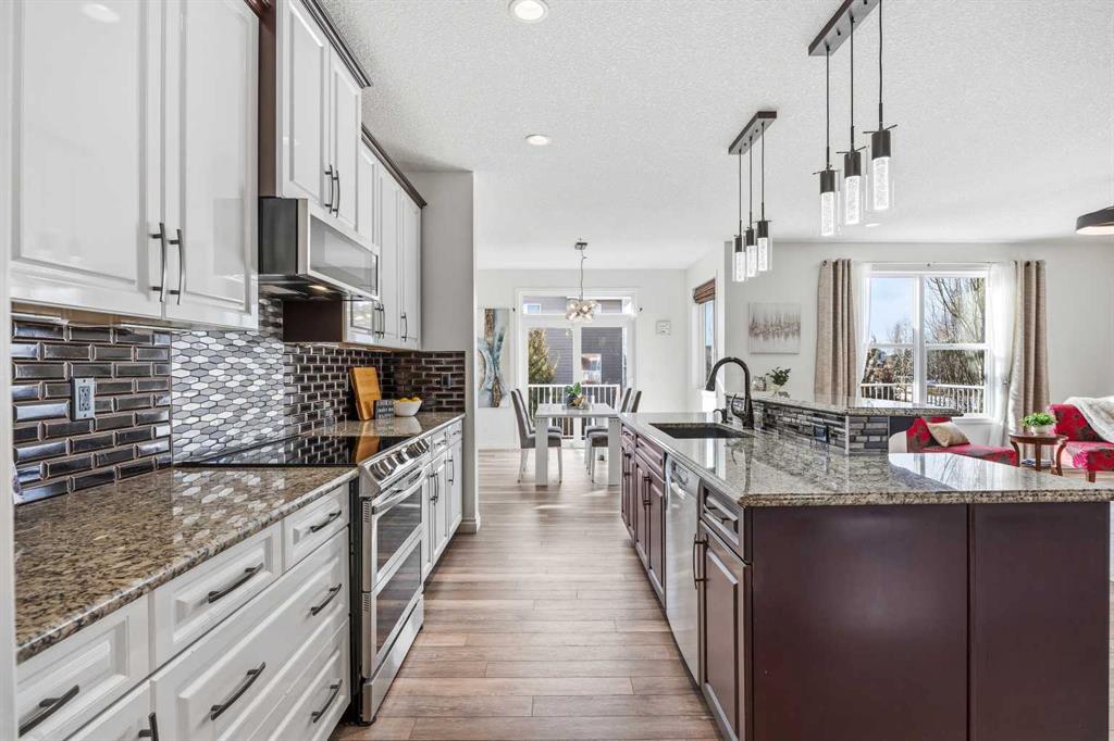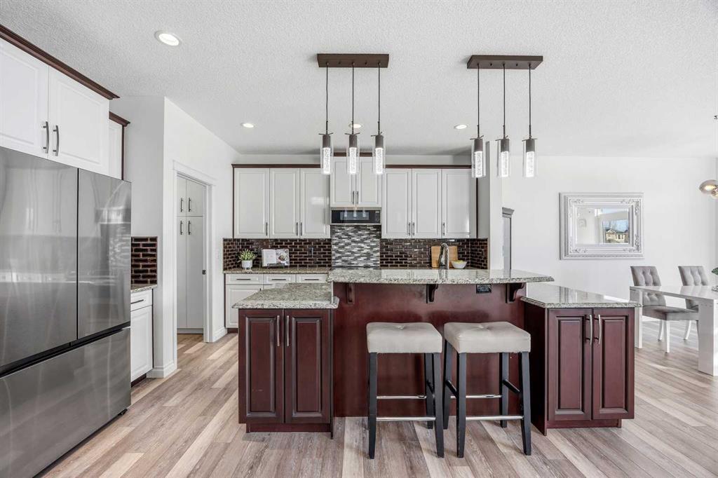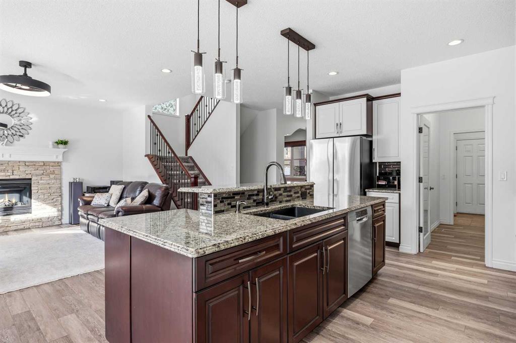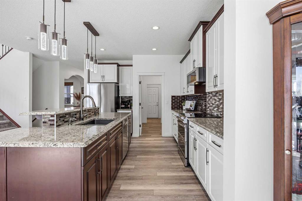 Welcome to Air Ranch, one of Okotoks’ most desirable communities. This beautifully maintained two-storey home offers four bedrooms, and a rare heated quad garage with a tandem third bay. (With approximately 876 sq. ft. of garage space, car enthusiasts and hobbyists will appreciate the tandem bay, complete with drains for washing, a sink, insulated doors, a separate ventilation fan for working on cars, and wiring for 220V.) Situated on a quiet street backing directly onto green space, pathways, and a playground, the location is ideal for families who value both privacy and connection to the outdoors. Inside, the main floor features a bright open layout with high ceilings and updated new vinyl flooring throughout. The kitchen is truly the heart of the home with two-tone cabinetry, granite countertops, updated backsplash, a raised eating bar, and a walkthrough pantry complete with built-ins and a coffee bar — an excellent setup for both everyday living and entertaining. The dining area and living room with gas fireplace overlook the backyard and open green space beyond. A main floor office or den, mudroom with great storage, and powder room complete the level. Upstairs you’ll find a spacious bonus room with vaulted ceilings, convenient upper laundry, and three generous bedrooms including the primary suite featuring heated floors in the ensuite, dual sinks, quartz countertops, a soaker tub, and a large walk-in closet. The main upper bathroom also features quartz countertops and an extended vanity with plenty of storage. The fully finished basement adds even more living space with a large recreation room with a second fireplace, fourth bedroom, and full bathroom, making it perfect for movie nights, guests, or a home gym. During the basement development, extra spray foam insulation was added for improved comfort and efficiency. Recent updates provide additional peace of mind, including new paint throughout the walls and baseboards (2025), new carpet (2025), a new refrigerator (2025), and a new hot water tank (2025). Additional features include central air conditioning, wiring for a hot tub under the deck, a dual-zone furnace, water softener, reverse osmosis to the fridge, and excellent storage throughout. Backing onto parks and pathways and located close to schools with quick access to Calgary, this home offers space, functionality, and a fantastic location in one of Okotoks’ most sought-after neighbourhoods.