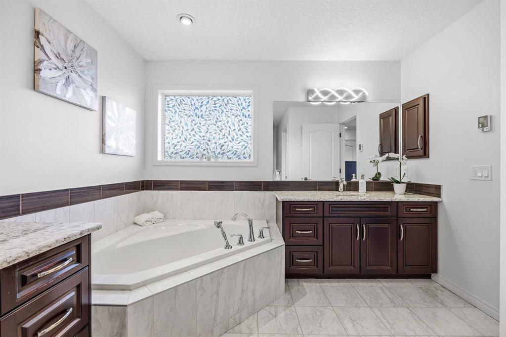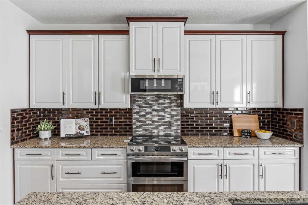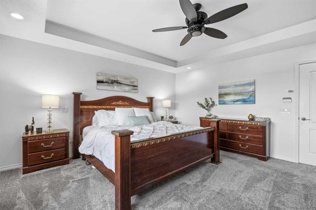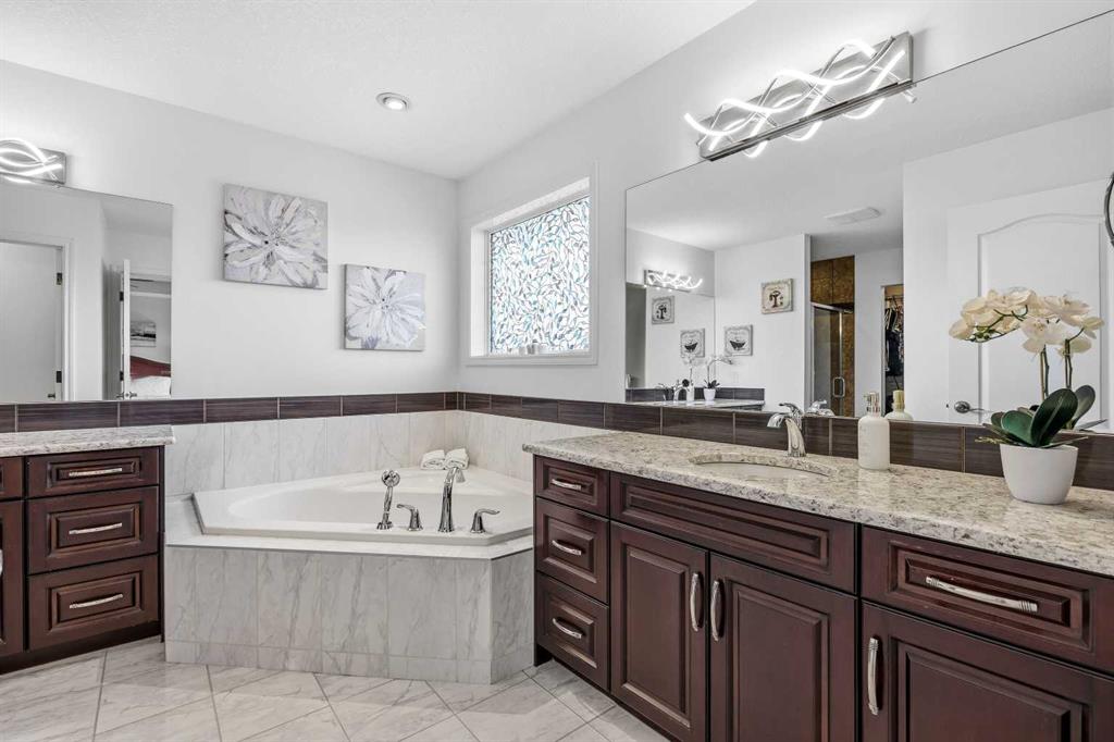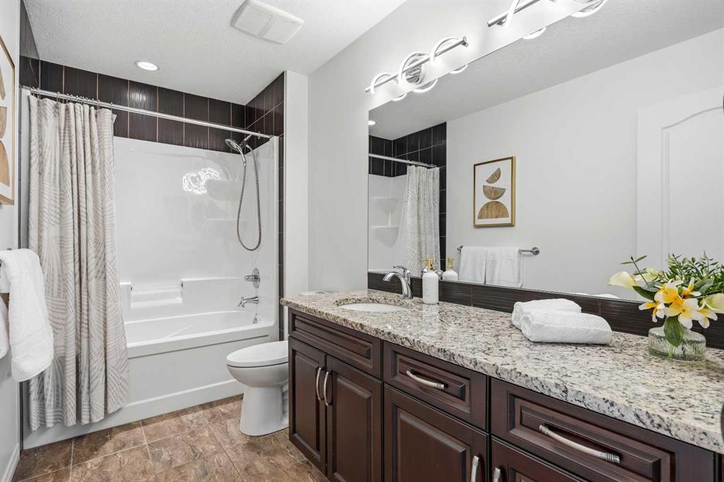 Welcome to Air Ranch, one of Okotoks’ most desirable communities. This beautifully maintained two-storey home offers four bedrooms, and a rare heated quad garage with a tandem third bay. (With approximately 876 sq. ft. of garage space, car enthusiasts and hobbyists will appreciate the tandem bay, complete with drains for washing, a sink, insulated doors, a separate ventilation fan for working on cars, and wiring for 220V.) Situated on a quiet street backing directly onto green space, pathways, and a playground, the location is ideal for families who value both privacy and connection to the outdoors. Inside, the main floor features a bright open layout with high ceilings and updated new vinyl flooring throughout. The kitchen is truly the heart of the home with two-tone cabinetry, granite countertops, updated backsplash, a raised eating bar, and a walkthrough pantry complete with built-ins and a coffee bar — an excellent setup for both everyday living and entertaining. The dining area and living room with gas fireplace overlook the backyard and open green space beyond. A main floor office or den, mudroom with great storage, and powder room complete the level. Upstairs you’ll find a spacious bonus room with vaulted ceilings, convenient upper laundry, and three generous bedrooms including the primary suite featuring heated floors in the ensuite, dual sinks, quartz countertops, a soaker tub, and a large walk-in closet. The main upper bathroom also features quartz countertops and an extended vanity with plenty of storage. The fully finished basement adds even more living space with a large recreation room with a second fireplace, fourth bedroom, and full bathroom, making it perfect for movie nights, guests, or a home gym. During the basement development, extra spray foam insulation was added for improved comfort and efficiency. Recent updates provide additional peace of mind, including new paint throughout the walls and baseboards (2025), new carpet (2025), a new refrigerator (2025), and a new hot water tank (2025). Additional features include central air conditioning, wiring for a hot tub under the deck, a dual-zone furnace, water softener, reverse osmosis to the fridge, and excellent storage throughout. Backing onto parks and pathways and located close to schools with quick access to Calgary, this home offers space, functionality, and a fantastic location in one of Okotoks’ most sought-after neighbourhoods.