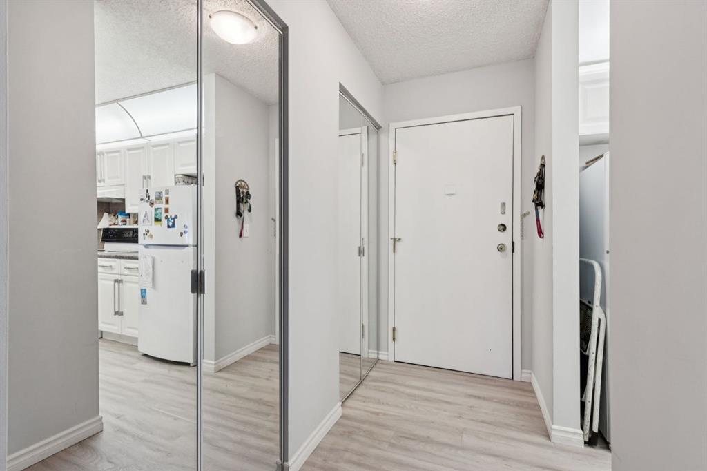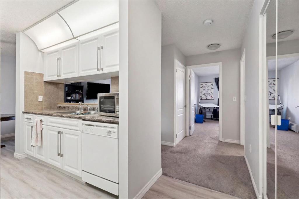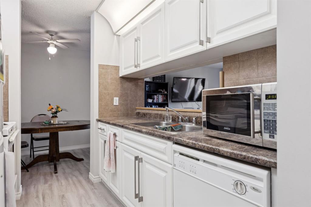 Welcome to this bright and beautifully maintained 1bedroom, 1 bathroom condominium featuring an large, private balcony where you can enjoy sunny mornings and comfortable shade in the afternoon. The thoughtfully designed kitchen features full height cabinetry with elegant over cabinet lighting for a clean European inspired look, along with ample countertop space that provides plenty of room for cooking and entertaining. A convenient pass through to the living room allows for natural light and easy conversation while hosting. The open layout flows effortlessly into a spacious dining and living area that can comfortably accommodate a full dining suite and a variety of furniture arrangements, making it ideal for everyday living or entertaining guests. A ceiling fan with integrated lighting adds comfort to the dining space. The large bedroom easily fits a king size bed and offers a generous double closet. Additional storage is thoughtfully incorporated with a wide entry closet and a separate storage room. The stacked washer and dryer are tucked neatly into their own closet just outside the bedroom for added convenience. This fourth-floor home is filled with natural morning light and features stylish laminate flooring, a private covered balcony, and excellent in suite storage. Low monthly condo fees include heat, water, sewer, insurance, professional management, reserve fund contributions, snow removal, landscaping, parking, and common area maintenance. The location offers exceptional convenience with quick access to Peigan Trail, Deerfoot Trail, and the new Ring Road system, while still being just minutes from downtown Calgary. Shopping, schools, parks, and playgrounds are all within walking distance, and a bus stop is conveniently located directly in front of the building. Additional features include an assigned parking stall and ample visitor parking. Whether you are a first-time buyer, downsizer, or investor, this well-kept home presents a fantastic opportunity in a highly accessible location. This suite is excellent value, reach out today to book your private viewing.