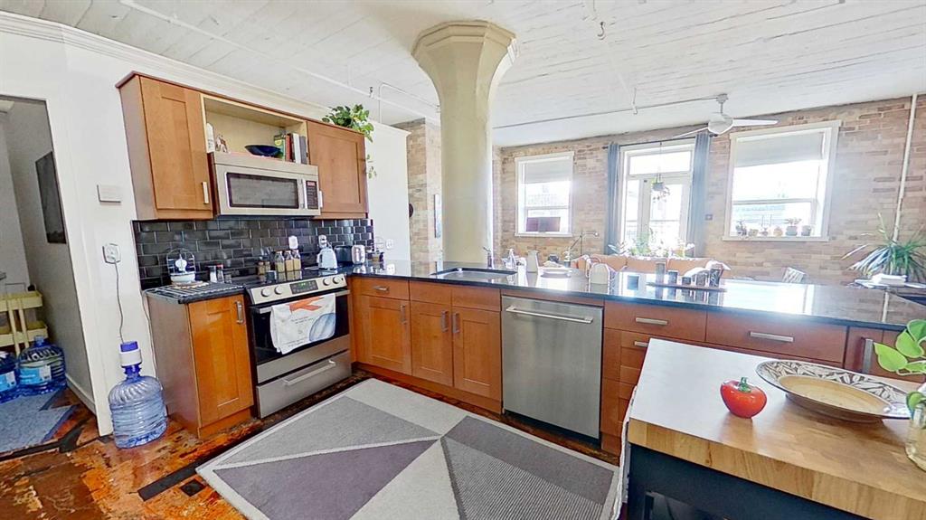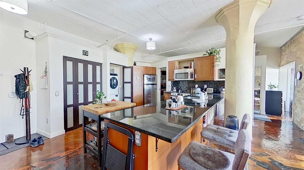 Loft-style condo offering an open 82.1 m² layout with one private bedroom. The unit features a bathroom area with sink and shower, with a separate enclosed space for the toilet and in-suite washer and dryer. Located in a building pursuing heritage designation, the property also includes access to a shared rooftop patio. Situated in Calgary’s Beltline community just outside the downtown core, the location provides convenient access to restaurants, cafés, shops, and other urban amenities.