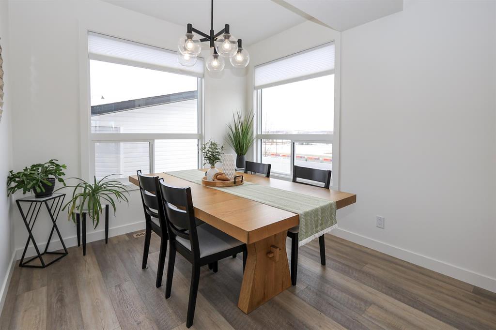 FULLY DEVELOPED 4 BEDROOM, 4 BATH 2-STOREY TOWNHOME ~ END UNIT ~ DETACHED GARAGE ~ Large front veranda overlooks the front yard, community walking trails and wetlands ~ Welcoming foyer with a built in bench ~ Open concept main floor layout is complemented by high ceilings, large windows and vinyl plank flooring ~ The living room has views of the park and features a cozy fireplace ~ The stunning kitchen offers tons of ceiling height cabinets, ample quartz counter space including a large island with an eating bar and pendant lights above, full tile backsplash, and stainless steel appliances ~ Easily host large gatherings in the dining room with more large windows with park views ~ Mud room with a built in bench and shelving and a closet offer garden door access to the deck and fully fenced backyard ~ 2 piece main floor bathroom ~ The spacious primary bedroom can easily accommodate a king size bed and furniture, has a walk in closet with built in organizers and a 4 piece ensuite ~ 2 additional bedrooms are located across from the 4 piece bathroom ~ Two oversized linen closets located across from the conveniently located laundry ~ The fully finished basement with high ceilings features a family room, 4 piece bathroom, 4th bedroom and space for storage ~ The low maintenance backyard is fully enclosed with vinyl fencing, has mulched garden beds, and landscaping rock offering a low maintenance yard ~ HEATED 22' L x 13' W detached garage is insulated, finished with painted drywall, with more parking beside the garage and a paved alley ~ Located in Evergreen, known for its green spaces, walking trails, with easy access to schools, multiple shopping plazas loaded with great amenities, plus amazing outdoor activities with Riverbend Golf & Rec Area, Canyon Ski and more all close by ~ Pride of ownership shines in this like new home.
