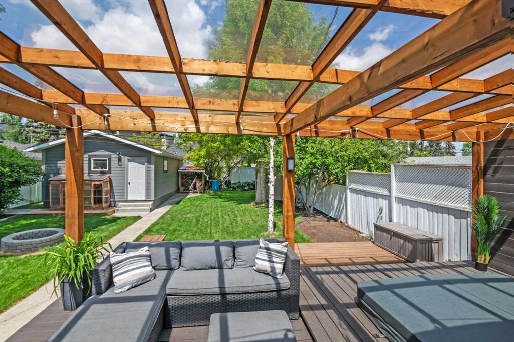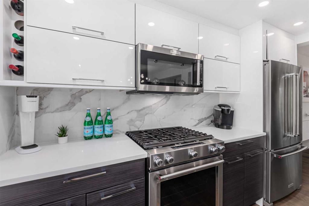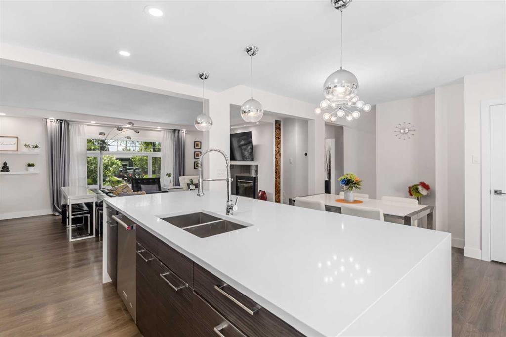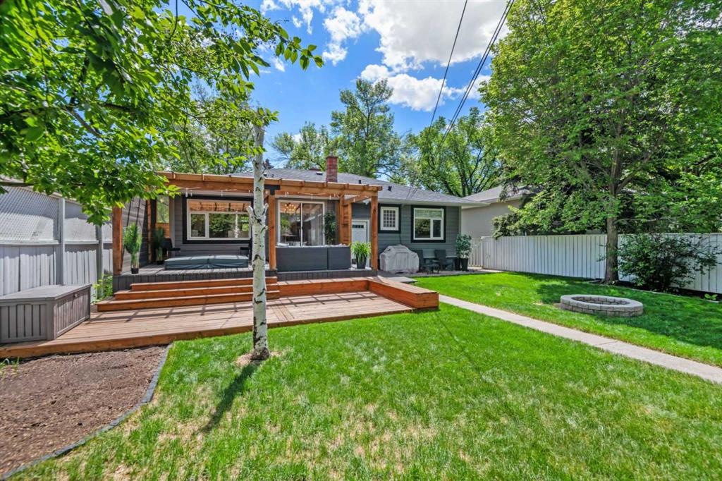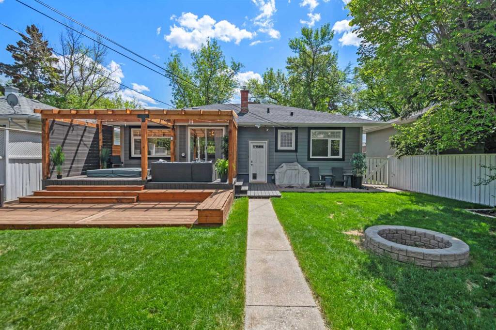 Absolutely GORGEOUS property LIKE NEW CONDITION on tree-lined street tucked away in Killarney's best corner Beautifully renovated raised bungalow with contemporary finishes and perfect floorplan. This main floor is 1,160 square feet of completely renovated living space with a modern kitchen featuring quartz countertops and huge island/breakfast bar. Full KitchenAid stainless steel appliance package with gas range and OTR microwave. Designer cabinets, cupboards and lighting tie the open plan kitchen into the living and dining areas - all open to huge windows permitting an abundance of natural light to flood the main living areas. In winter time, cozy up to the feature wood-burning fireplace with unique wood storage alcove. The two bedrooms are comfortably sized and serviced by nearby laundry and completely renovated bathroom naturally lighted through glass block shower !! Newer hardwood floors grace the main floor with tile in bathroom and entries. Through sliding glass doors from the dining area is a beautiful covered tiered deck with sunken hot tub - yours to enjoy year round. Beautifully landscaped/fenced yard and the over-sized, insulated garage complete the picture for this perfect home. 3211 Kilkenny Road is ideally located (WalkScore of 73) on the best quiet tree-lined street in the area with very easy access to Richmond Road, 37 Street, Glenmore Trail, Crowchild Trail and the Ring Road.... a short walk to Glamorgan Shopping Centre (Safeway, Glamorgan Bakery !) and major transit routes. Mount Royal University, Currie Barracks, Marda Loop and North Glenmore Park are all a very short distance away