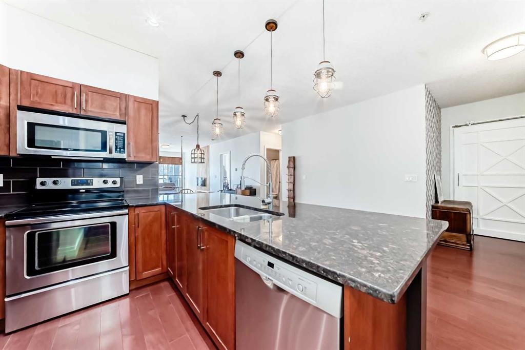 Absolutely immaculate throughout and offering the largest floorplan in the building with1,350 sq ft of living space and 2+1 bedrooms, this original-owner condo presents a fantastic opportunity! Exceptional location with quick access to downtown, Foothills Hospital, Alberta Children’s Hospital and the University of Calgary, along with the many shops, restaurants, grocery stores, and the VIP movie theatre in University District, not to mention Notable Restaurant right downstairs. Nine-foot ceilings enhance the open-concept layout which features a generous kitchen with stainless appliances & granite counters including a breakfast counter, adjoining dining area, and a bright living room with a feature wall and cozy electric fireplace. There are two spacious bedrooms including a primary with a full ensuite bathroom and walk-in closet, plus a versatile third bedroom/den that works perfectly as a guest room, office, hobby space or additional storage. Additional highlights include a private balcony with room for a barbecue, in-suite laundry and a titled underground parking stall, along with underground visitor parking. Just a short walk to the Bow River pathway system and with quick access to the mountains, this is a truly convenient lifestyle location. Condos of this size and functionality rarely come available, so contact your favorite realtor to schedule your private viewing!