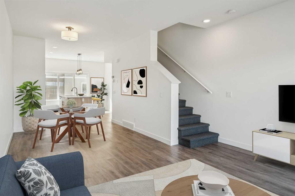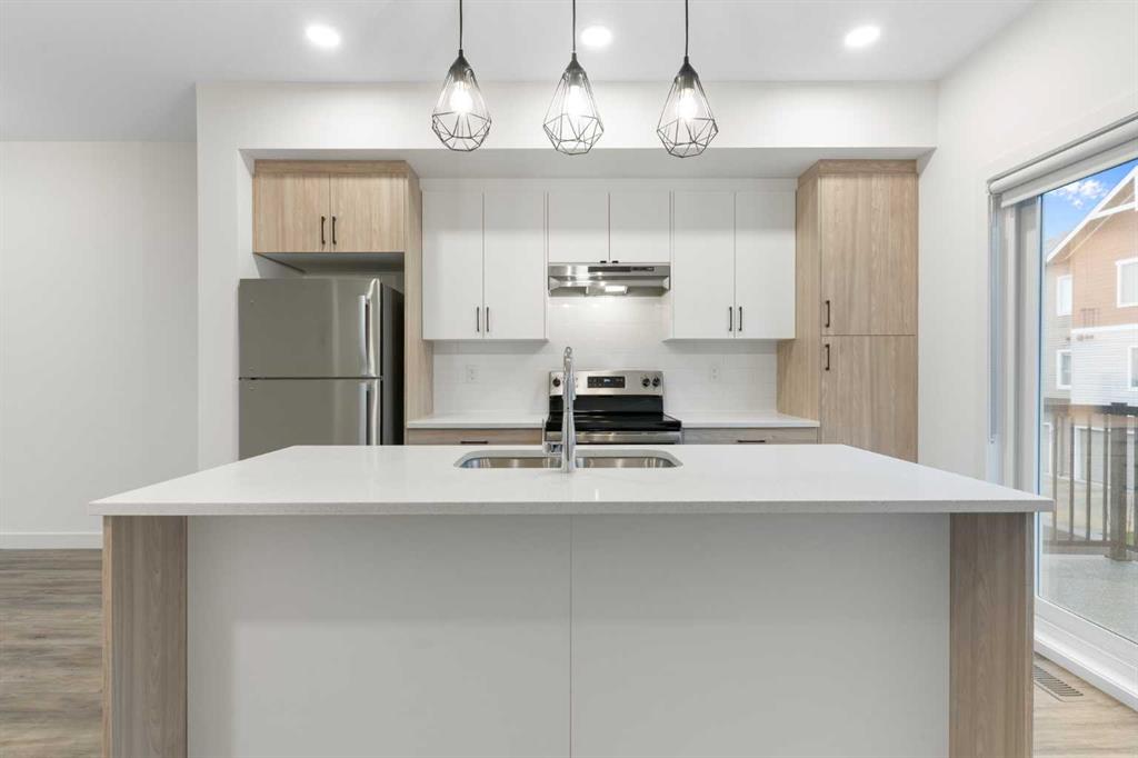Experience the best of modern living in this lightly lived in Cochrane townhome. , enjoy a west facing backdrop! Located directly across from the future Rivercrest School! and offering stunning Mountain Views! Inside, discover a bright, open-concept haven designed for both entertaining and everyday comfort. The kitchen is the heart of the home, featuring a sprawling white quartz island perfect for casual meals or lively gatherings. You'll love the sleek two-tone cabinetry with soft-close drawers, a full GE stainless steel appliance package, ample cabinet space, and a pantry, all illuminated by stylish pendant lighting. Large windows on both sides of the unit flood the space with natural light, highlighting the durable vinyl plank floors and soaring, knock-down textured ceilings. Pull-down window coverings offer privacy and shade when desired, while the adjacent living room provides a natural gathering spot. This meticulously designed townhome offers two spacious bedrooms, 1.5 baths, and a versatile flex space on the main level—perfect for a home office, guest room, or creative studio. The primary suite on the third level boasts dual closets for ample storage and large windows. This level also features a convenient laundry area and a full 4-piece bath. Convenience is paramount with the oversized, fully insulated single-car garage, a true game-changer with dual access (doors on both sides of the unit). Whether you're storing outdoor gear or setting up a workshop, this space offers flexibility. Location is key! Nestled in a fantastic complex, you're just steps from shopping, scenic pathways, and the tranquil Bow River. Bow Valley High School is close by, with a future school site conveniently located next door, and local transit is mere steps away. Enjoy quick access to Calgary for work or entertainment and the majestic mountains for weekend adventures. This isn't just a property; it's a lifestyle—a perfect blend of modern comfort, convenience, and a great location.
