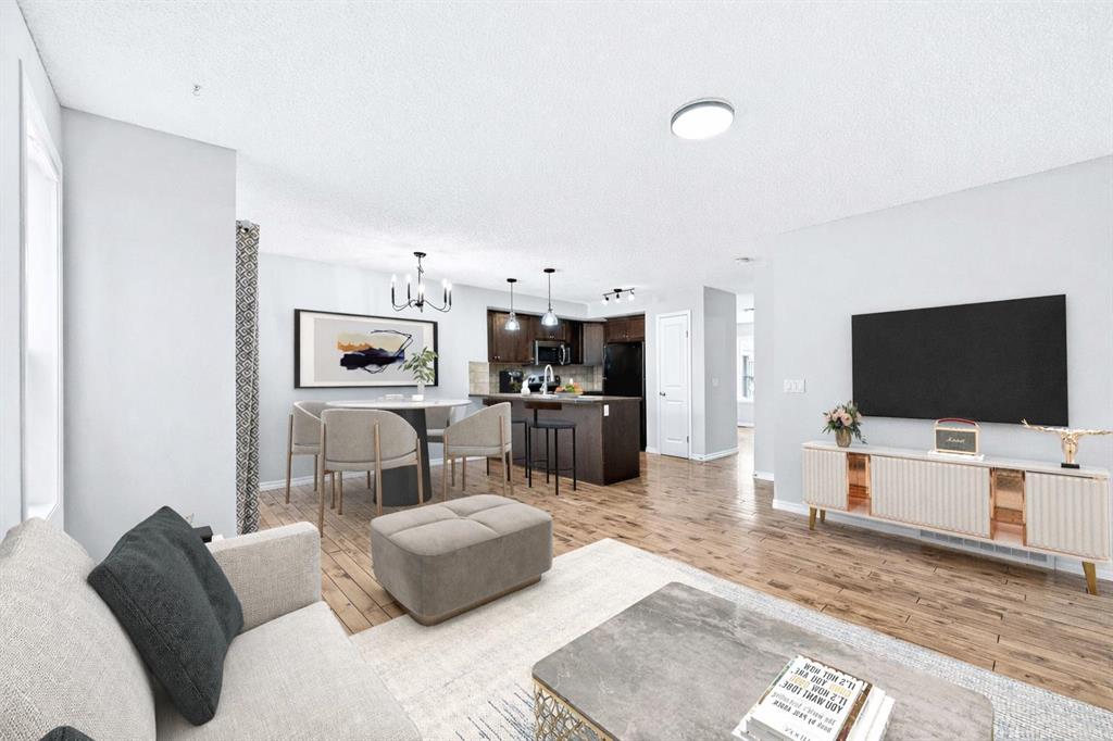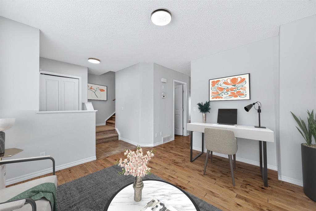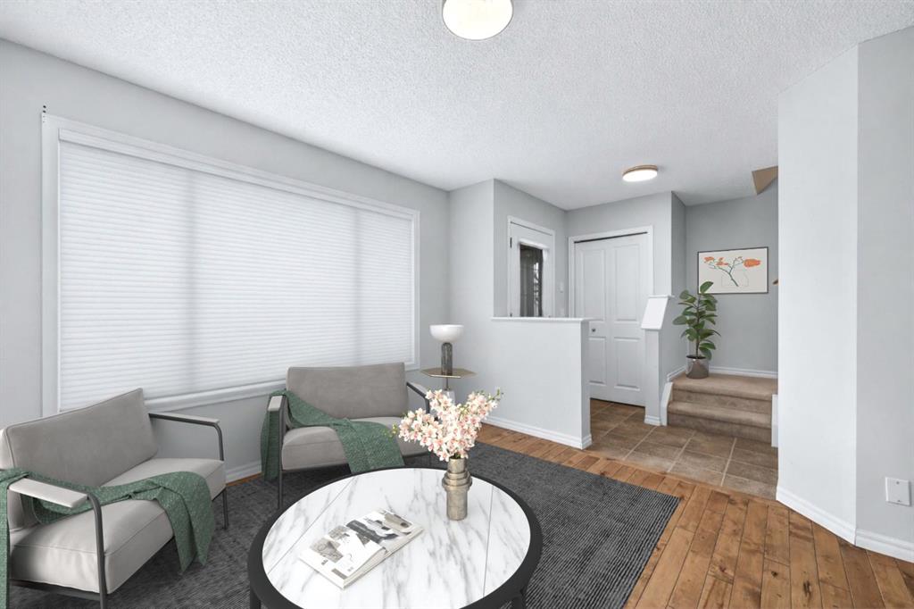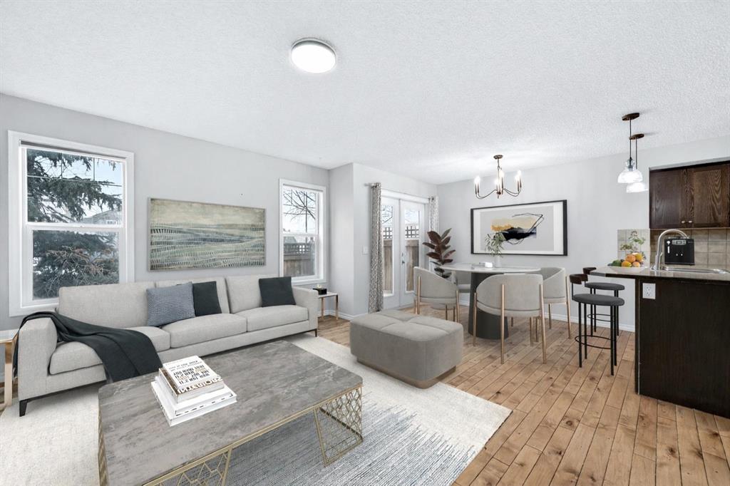Welcome to this beautifully refreshed end unit townhome in the heart of Sagewood’s family-friendly community. Offering over 1,350 sq. ft. of thoughtfully designed living space, this 3 bedroom, 2.5 bathroom home is large and features an open layout perfectly suited for comfortable everyday living. Fresh, neutral paint tones and modern light fixtures create a bright, welcoming atmosphere throughout the home. The main level features rich alder hardwood flooring that adds warmth and character to the open concept layout. A spacious front living room provides a comfortable space to relax and gather and flows seamlessly into the warm and functional kitchen. Complete with stained maple cabinetry, a breakfast bar, pantry, and ample counter space, the kitchen is perfect for those who love to cook or bake. This area is also equipped with a new Frigidaire electric range and hood fan, offering a modern touch for everyday cooking and entertaining. Just off the kitchen, you can step outside through elegant French doors to your private patio with sunny south exposure, ideal for morning coffee, summer BBQs, or simply enjoying the outdoors. Upstairs, the spacious primary retreat features a large walk-in closet and private 3 piece ensuite, while two additional generous bedrooms and a full 4 piece bathroom provide plenty of room for family, guests, or a home office. The unspoiled basement offers excellent storage or the opportunity to develop additional living space to suit your needs. Perfectly located just steps from parks, schools, walking paths, and everyday amenities, this home offers the lifestyle and convenience today’s buyers are looking for. Whether you're a first-time buyer, growing family, or investor, this Sagewood townhome is a fantastic opportunity to call home.