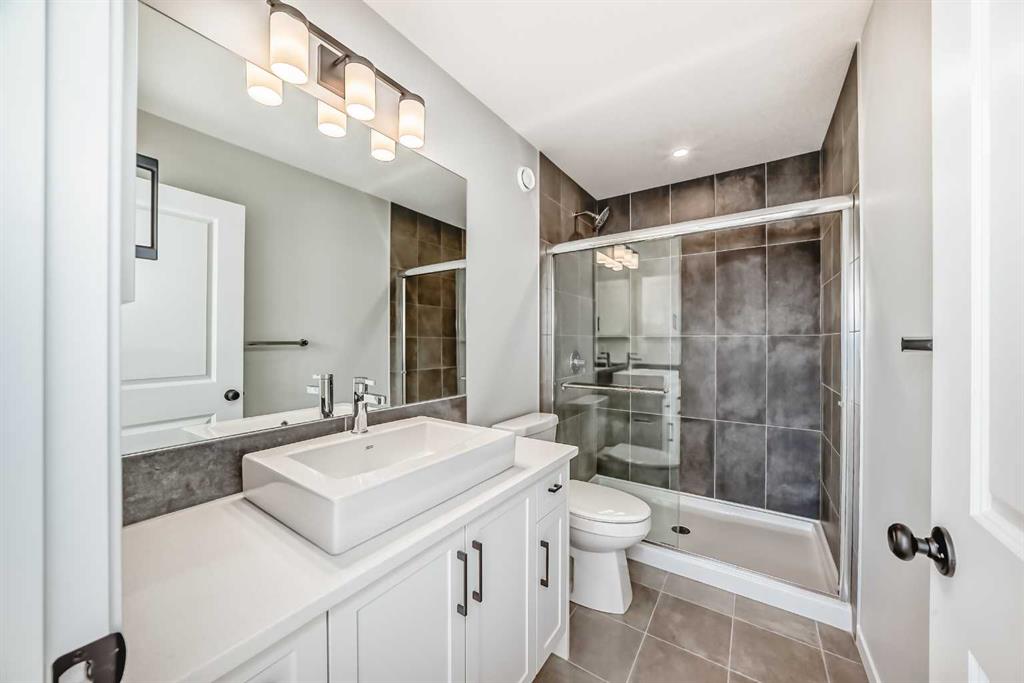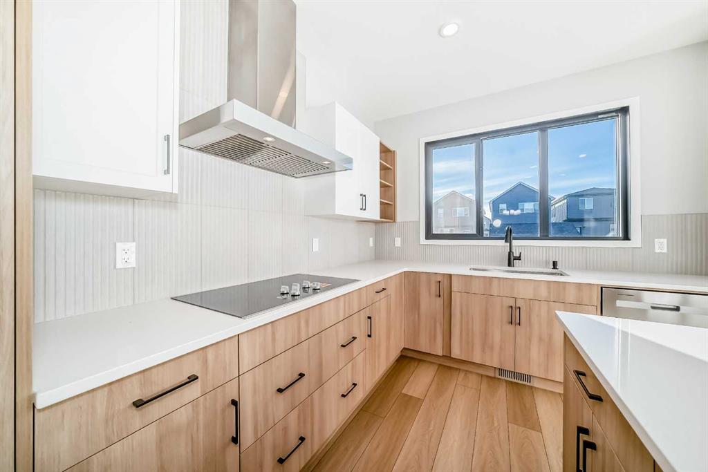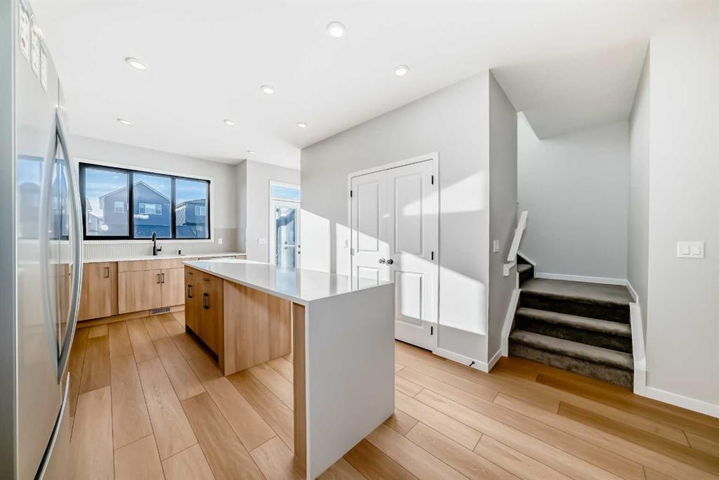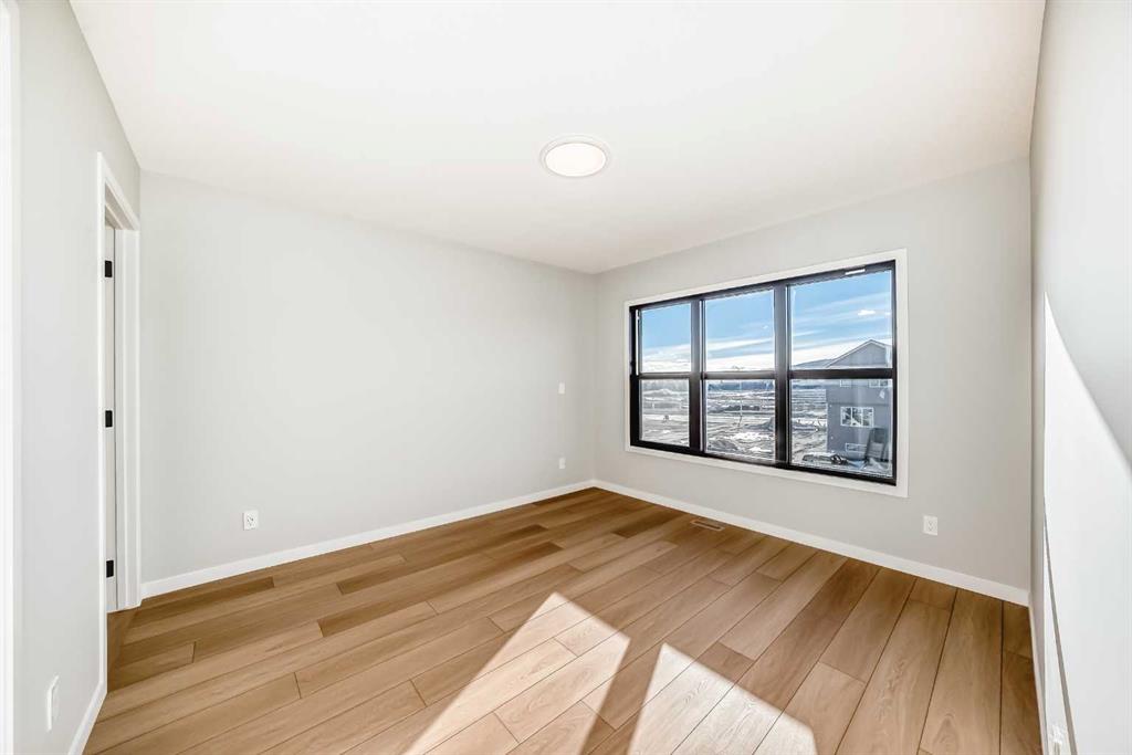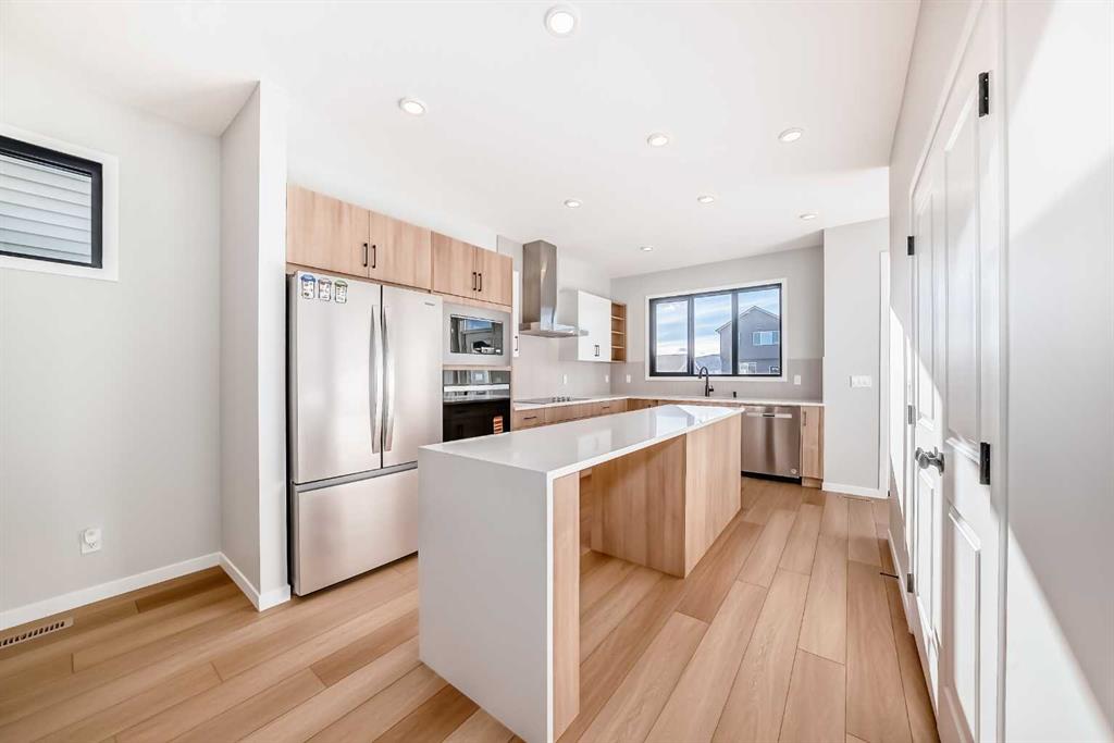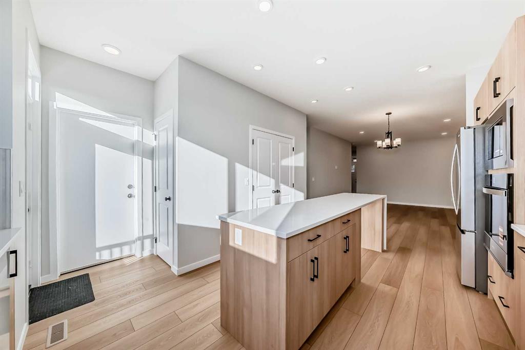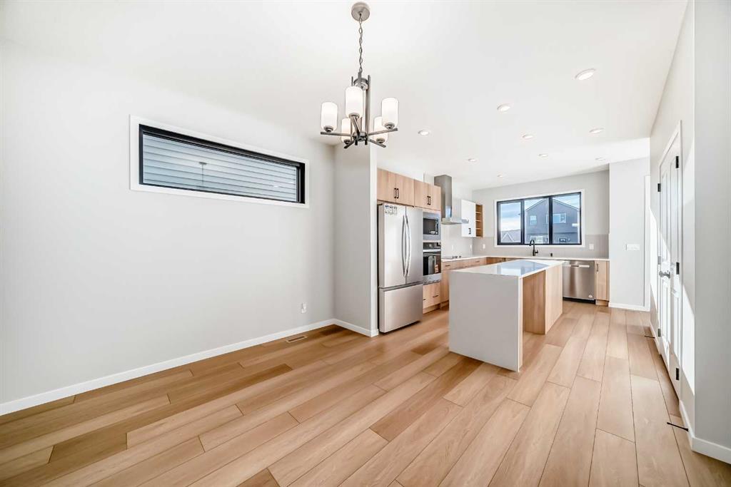 Welcome to this brand new, upgraded home in the vibrant community of Pine Creek! Known for blending nature, family living, and modern homes, Pine Creek offers scenic pathways, nearby parks, and easy access to city conveniences. This beautifully designed property features extensive upgrades throughout and is perfect for homeowners looking for a mortgage helper opportunity with its thoughtfully designed basement living space. The main floor showcases luxury vinyl plank flooring throughout the entire main and second floor, a spacious layout, and a gorgeous extended kitchen with two-tone cabinetry, waterfall island with additional cabinet storage, upgraded backsplash tiles, built-in appliances, and a modern upgraded hood fan. A larger walk-in pantry adds both convenience and storage. The home also features upgraded black window frames, adding a striking modern exterior and interior aesthetic. A versatile additional room on the main floor is complemented by a full bathroom with an upgraded standing shower and full wall tile finish, perfect for guests or multi-generational living. Upstairs, you’ll find spacious bedrooms and an upgraded ensuite featuring a beautifully finished standing shower with full wall tiles. The extended basement bedroom enhances the lower level’s functionality, making it ideal for extended family or rental potential. Both the main floor and basement kitchens feature stylish two-tone cabinetry, creating a cohesive and upscale look throughout. Additional highlights include: Upgraded washer and dryer sets for both main floor and basement, Upgraded stair carpet, Pressure-treated backyard deck with sleek black railings, Upgraded exterior stone detailing, Doorbell camera system for both the main entrance and basement entrance. This move in ready home combines style, functionality, and income potential in one of Calgary’s growing communities.