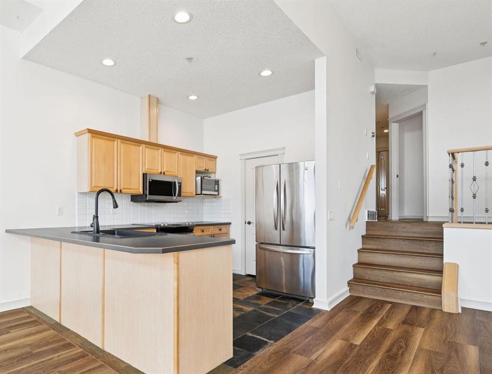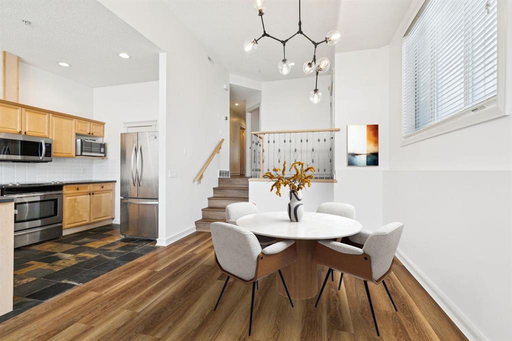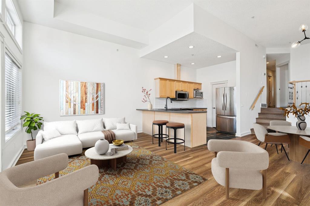 Welcome to comfortable inner-city living in the vibrant community of Killarney. This beautifully maintained bungalow-style townhome offers the perfect blend of style, comfort, and convenience in a quiet residential setting, just moments from the energy of 17th Avenue. Freshly painted throughout, the home feels bright and inviting from the moment you step inside. Large windows fill the space with natural light, highlighting the dramatic 12-foot ceilings, luxury vinyl plank and slate flooring, and the warmth of in-floor heating. The open design creates a welcoming flow that’s ideal for both relaxing and entertaining. The kitchen is thoughtfully designed with an eating bar, pantry, new black double sink, and stylish new backsplash, making it both functional and attractive for everyday living. Just off the main living area, step outside to your cozy, private fenced patio—a perfect spot to enjoy a quiet morning coffee or unwind at the end of the day. This spacious home offers over 1,200 sq. ft. of living space with two bedrooms and a versatile den area ideal for a home office. The generous primary bedroom features a walk-in closet and a private ensuite with a jetted soaker tub and separate shower, creating a comfortable retreat. A second full bathroom adds convenience for guests or family. The well-maintained complex consists of only four units and is self-managed, helping keep condo fees low while maintaining pride of ownership throughout. You’ll appreciate the convenience of your garage parking stall at the rear, along with easy access to 17th Avenue, Crowchild Trail, parks, playgrounds, schools, transit, shops, and restaurants. If you’re looking for bright, low-maintenance inner-city living in one of Calgary’s most loved neighbourhoods, this Killarney gem is a must see. BOOK YOUR APPOINTMENT TODAY. Some of the photos have been virtually staged.