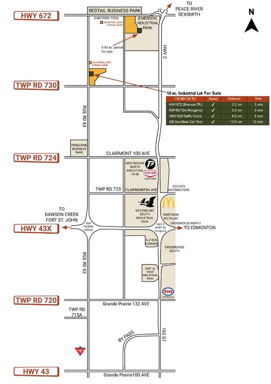 This subdivision – at just the right time! With the new HWY 43X traffic circle now fully operational and moving heavy traffic quickly, this strategically located subdivision puts you exactly where you need to be. Enjoy quick, efficient access to 43X via Range Road 63 (116 Street) by heading south, or head east to Emerson Trail—passenger vehicles enjoy unparalleled access to both popular truck routes in five minutes or less. You get the visibility of a high-traffic corridor without the frustration of city congestion. Traffic flows, routes are easy to access, and time is saved. With Clairmont just minutes away, fuel stops are also quick and convenient, whether arriving late at night or heading out early in the morning. This 10 acre parcel is already approved, with additional lots coming soon—so if 10 acres works, but you'd like a second lot too for even more space, explore that opportunity here. This parcel is ready for title. 4-5 weeks for title. Call your agent to learn more.