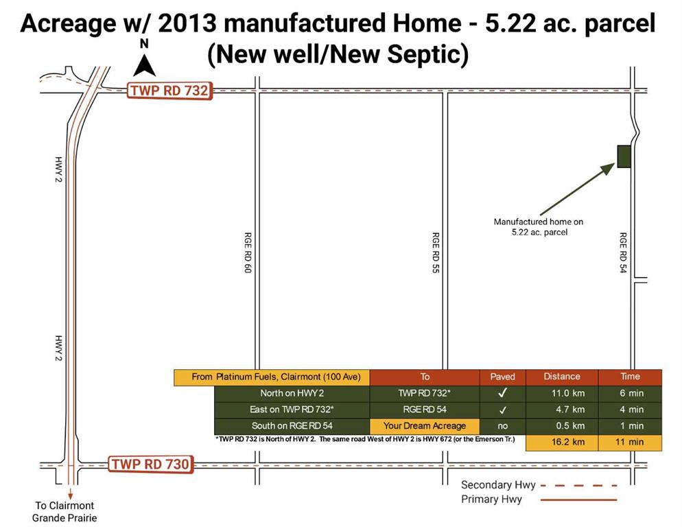 Perfect for first-time acreage buyers or families seeking space! Looking to give your family more space to grow—without giving up convenience? This 5.22 acre acreage offers room to breathe, open views, and a quieter lifestyle, all approximately 15 minutes north of Grande Prairie and closer than Sexsmith. The drive is almost entirely paved, with only 0.5 km of gravel, making daily commuting, school runs, and errands easy year round. Zoned CR5, this property is ideal for families who want flexibility—whether that’s building a shop, keeping a horse, giving kids space to roam, or running a home based business. It’s acreage living that adapts as your family’s needs change. The 2013 manufactured home (1,520 sq ft) is well suited for family life, featuring 3 bedrooms, 2 full bathrooms, a gas fireplace, a large kitchen and livingroom for gatherings, and a spacious primary bedroom with an ensuite and a walk-in closet. The home has been freshly painted, includes new flooring throughout, and sits on an elevated site with excellent natural drainage—practical and low maintenance. Key infrastructure is already in place: • Brand new well (50 GPM) • New septic system For families, this home provides peace of mind knowing the most expensive systems are new, reliable, and not nearing replacement. A great fit for families seeking space and lifestyle, with the added bonus of CR5 zoning flexibility for home based business or hobby use—all while staying close to town and on pavement.