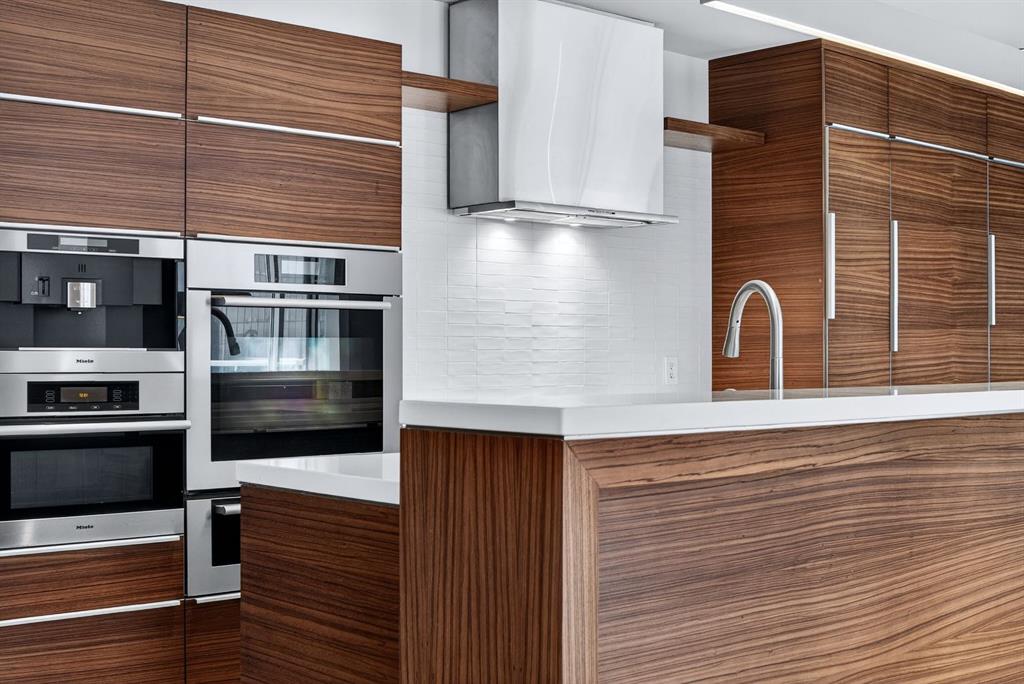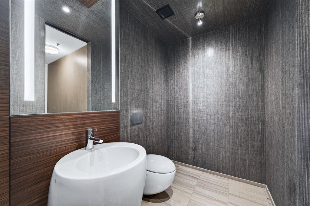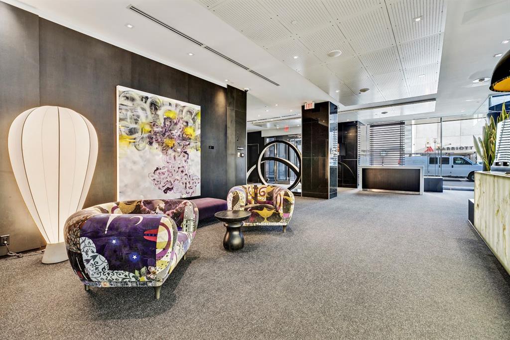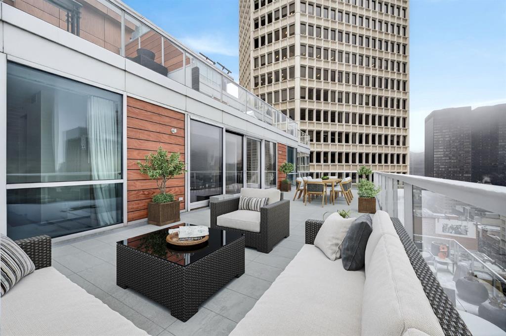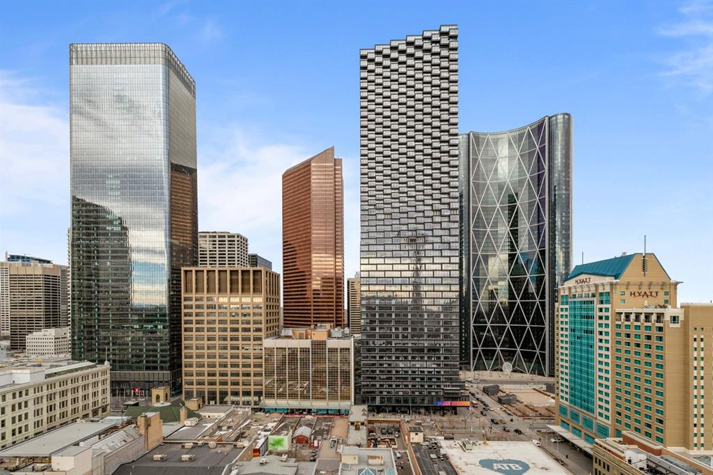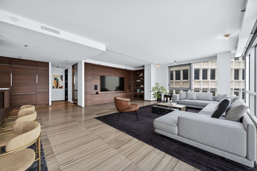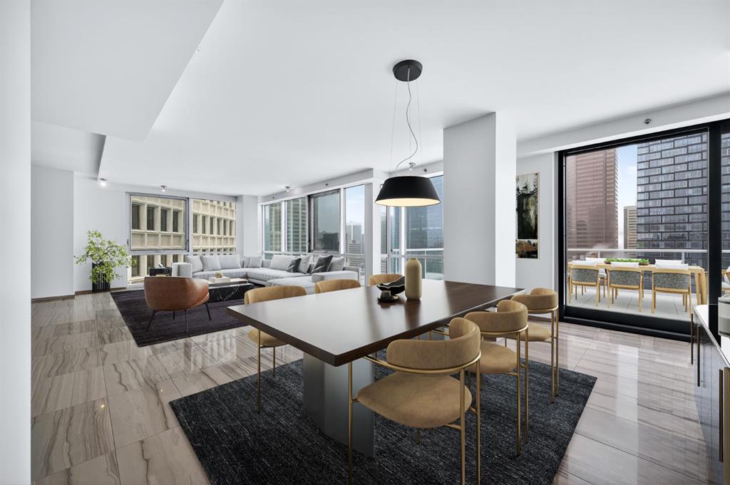 One of the most exclusive condominium residences in downtown Calgary, this exceptional sub-penthouse at Le Germain Residences offers 2,393 sq.ft. of refined living space with breathtaking panoramic views of the city skyline. Designed by internationally renowned architectural firm Lemay Michaud, the residences offer a boutique, club-like atmosphere with full access to the services and amenities of the acclaimed Le Germain Hotel. This beautifully designed suite features 9-ft ceilings, floor-to-ceiling windows, and open-concept living with north, south, and west exposures. High-end finishes include custom wood cabinetry by André Julien, quartz countertops, stone tile, Kohler fixtures, electronic blinds, and in-floor radiant heating, along with new paint and kitchen backsplash. The chef’s kitchen is equipped with Miele appliances and a wine fridge. A spectacular 650 sq.ft. terrace offers stunning city views, while the primary suite features a private balcony a walk-in dressing room, and spa-inspired ensuite. A second bedroom with private ensuite and balcony complete the home. Residents enjoy white-glove concierge service and full access to Le Germain Hotel amenities, including spa, fitness centre, valet parking, restaurants, and room service. The unit includes two premium underground parking stalls and secure storage. Ideally located between Stephen Avenue and the Calgary Tower, this is downtown living at its finest. Images and 3D tour have been virtually staged to help illustrate the property’s potential layout and furnishings. Furnishings, Tv's and decor shown are not included in the sale.