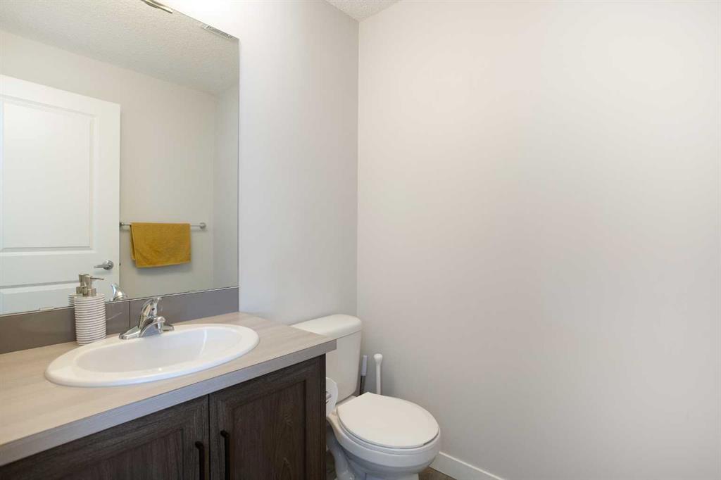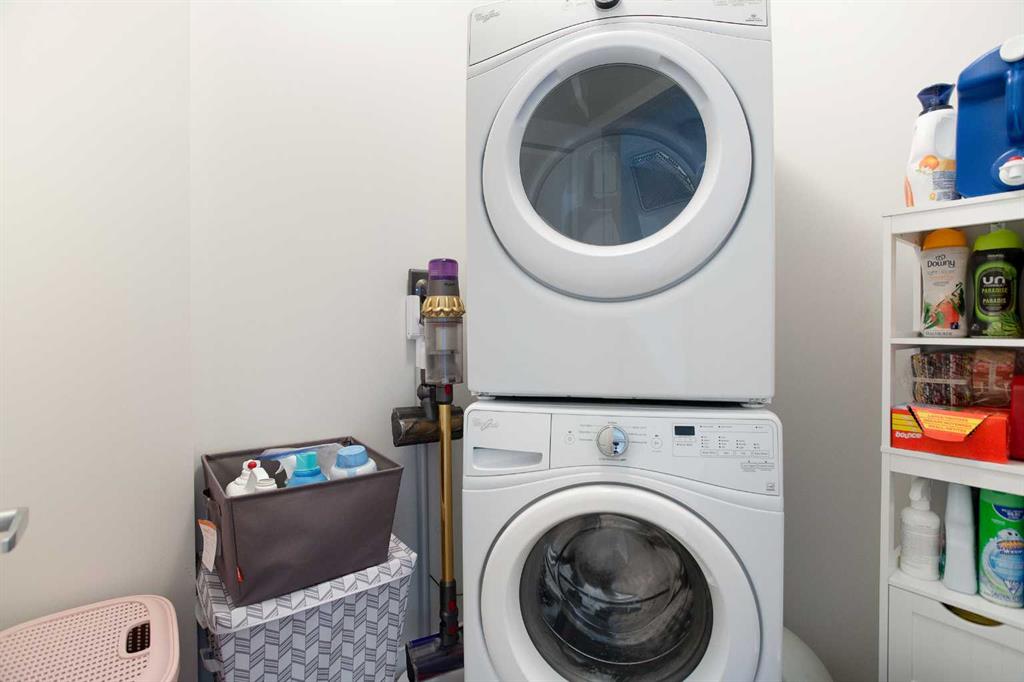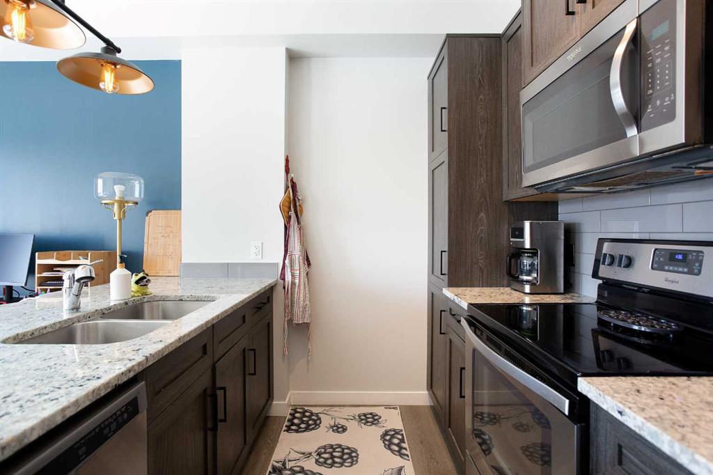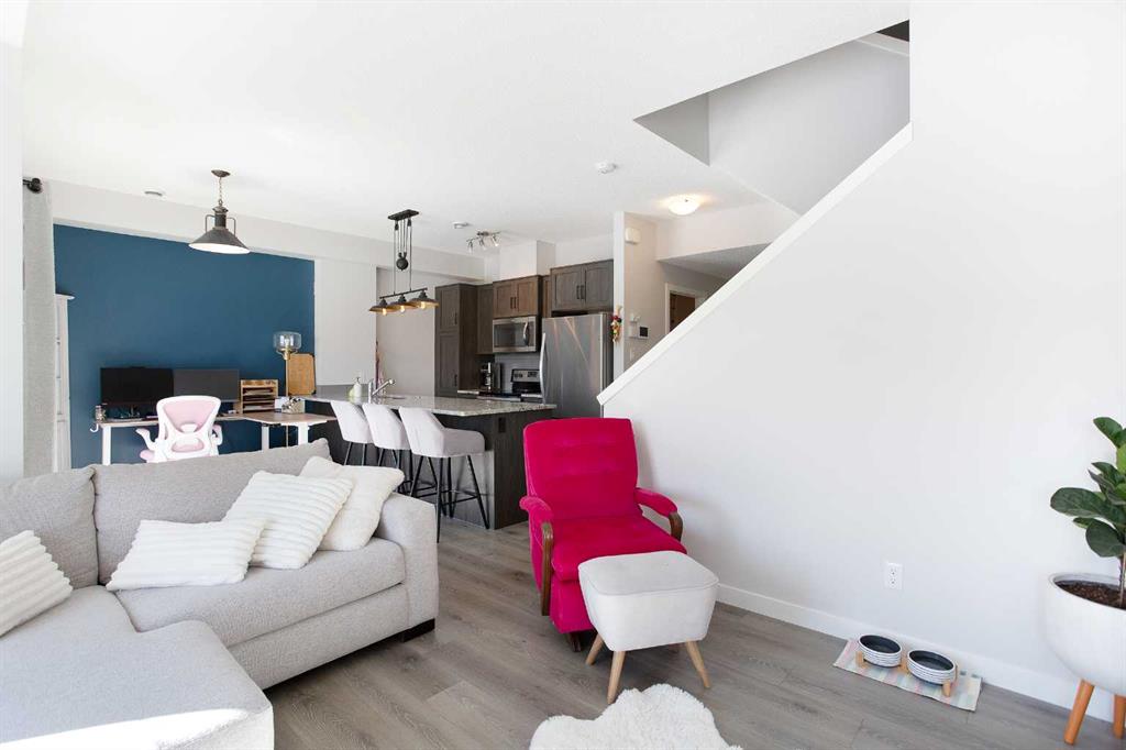 Enjoy breathtaking pond and wetland views from this like-new 2-storey townhome offering over 1,000 sq ft of bright, modern living space. Tucked away at the quiet back of the complex, this beautifully finished home combines peaceful surroundings with convenient access to everyday amenities. Step inside through your private entrance to an open and thoughtfully designed floor plan featuring gorgeous laminate flooring, upgraded lighting, and large windows that fill the home with natural light. The stylish U-shaped kitchen is perfect for entertaining with granite countertops, subway tile backsplash, stainless steel appliances including an upgraded full-size fridge, and an oversized island with flush eating bar. The kitchen flows seamlessly into the spacious dining and living areas, creating a warm and inviting space to gather. Patio doors off the dining area lead to a generous balcony overlooking the serene pond and surrounding wetlands—an ideal place to enjoy morning coffee or evening sunsets. Upstairs offers two spacious bedrooms, including a primary retreat with its own private balcony, plus a full bathroom and convenient upper-floor laundry with a washer and dryer. Additional features include titled parking, dedicated storage, visitor parking, and low condo fees, making this home ideal for low-maintenance living. Located just minutes from local amenities with quick highway access for easy in-and-out of town, this home is perfectly position for both convenience and adventure-only about an hour's drive to Canmore, and within easy reach of Calgary, Ghost Lake, and the breathtaking Rocky Mountains. Move-in ready and beautifully maintained — this one is not to be missed.