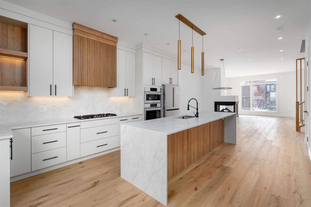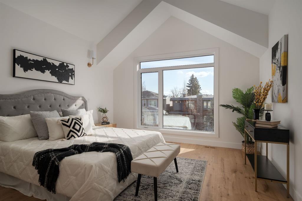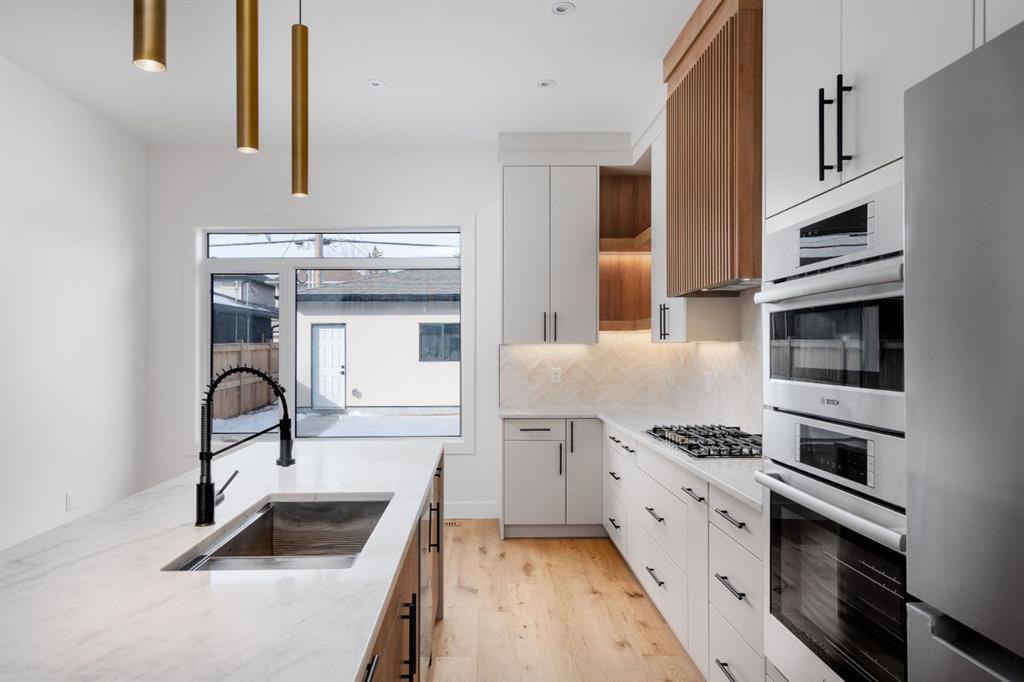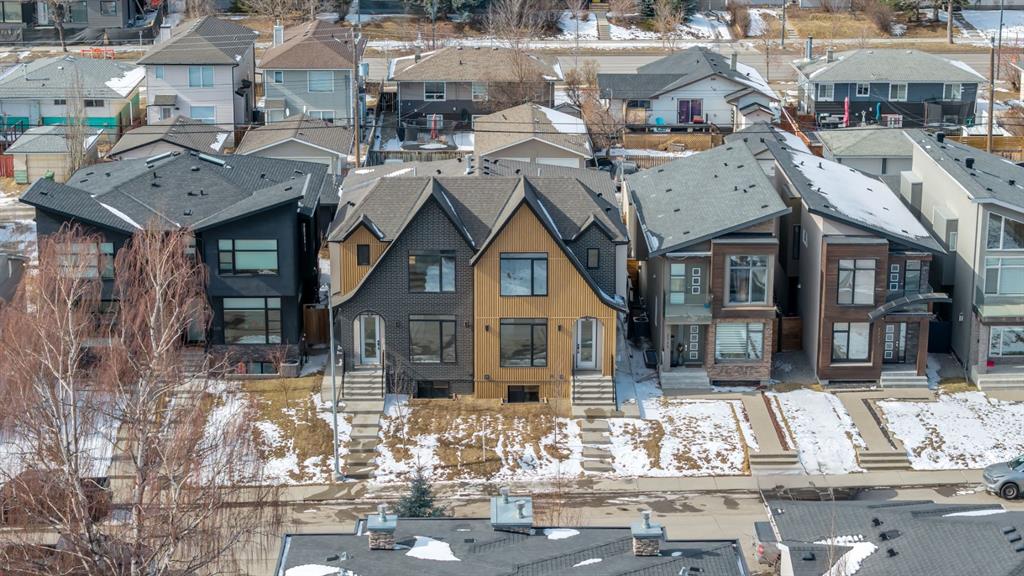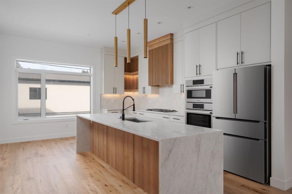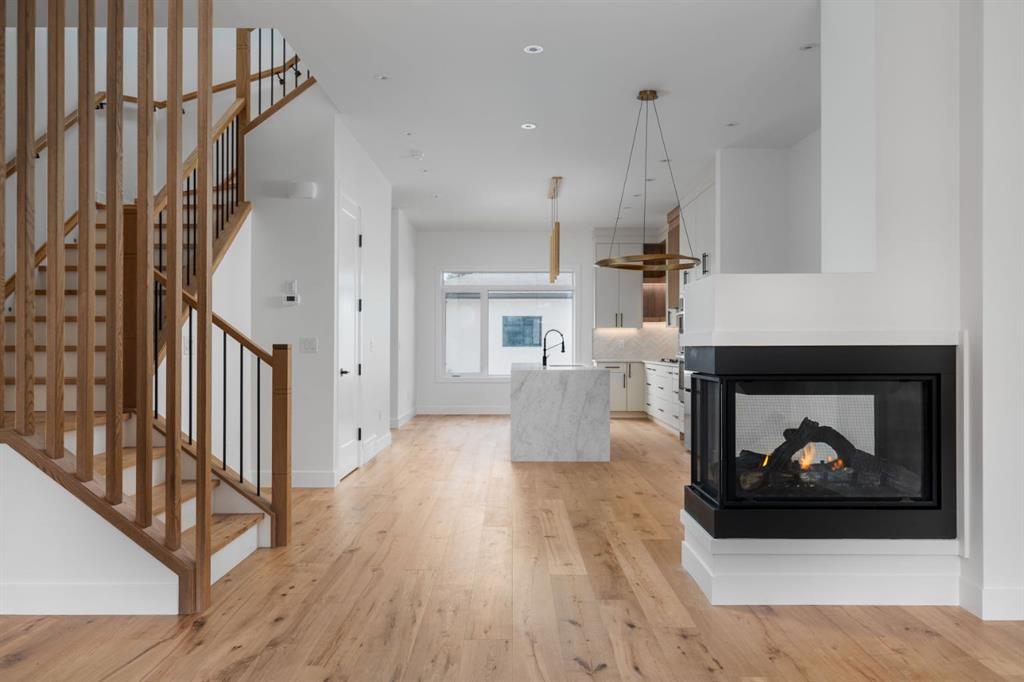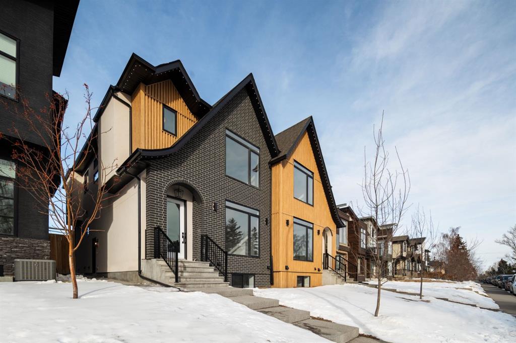 Welcome to The Killarney Collection in SW Calgary—thoughtfully crafted on a quiet street, this fully upgraded duplex infill offers a refined balance of scale, texture, and modern comfort. From the moment you arrive, the home makes a striking first impression with its sleek, contemporary exterior, pairing oversized triple-pane windows for abundant natural light with warm natural tones of true brick detailing and stucco accenting stands out. Inside, 10-foot main floor ceilings create a grand sense of arrival, setting the tone for the interior designer–curated colour palette carried throughout the home. Every detail has been intentionally explored, with the heart of the main floor anchored by a chef-inspired gourmet kitchen. Featuring a premium Bosch appliance package, fully custom-painted cabinetry, and an oversized waterfall granite island, the space effortlessly blends luxury with everyday functionality. A dedicated central dining off the kitchen offers a warm setting for gatherings, while the front living room provides a more intimate retreat, both areas are anchored by the full feature-wall gas fireplace—perfect for evenings spent unwinding. Thoughtful storage solutions are seamlessly integrated, including built-ins at the entry and a fully custom mudroom at the rear, ensuring every inch of space is maximized. Ascending to the upper level, subtle design moments continue to impress, with a full wood feature wall, custom stair lighting, and luxury wide-plank hardwood flooring flowing continuously throughout both the main and upper levels for a seamless transition.The oversized primary bedroom is a true sanctuary, showcasing a vaulted and peaked ceiling design with expansive windows that welcome morning light. The spa-inspired ensuite features a dual vanity, an expansive full-tile shower, and a calming, private retreat. Two additional bedrooms offer generous proportions, each complete with custom closet built-ins. The upper-level laundry room maintains the home’s commitment to efficiency and design, offering full cabinetry, a folding counter, side-by-side washer and dryer, and a laundry sink. A versatile work-from-home alcove completes the upper floor, easily functioning as a den or secondary living space.The lower level further extends the home’s flexibility with an oversized 2-bedroom, 1-bath legal suite (900+SQFT), centered around a spacious open kitchen—ideal for rental income, guests, or multi-generational living. A separate full laundry room, understair storage, and built-ins throughout each closet to ensure the same level of thoughtful design continues below.Perfectly positioned close to inner-city Calgary, recreation centres, shopping, and public transit, this Killarney residence offers a timeless blend of form and function—designed to live beautifully today and adapt effortlessly for tomorrow.