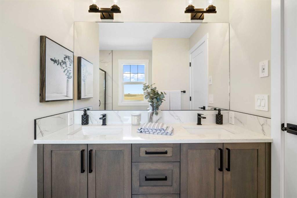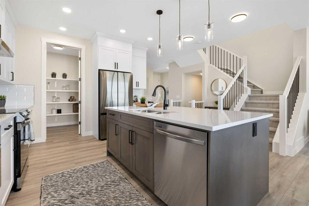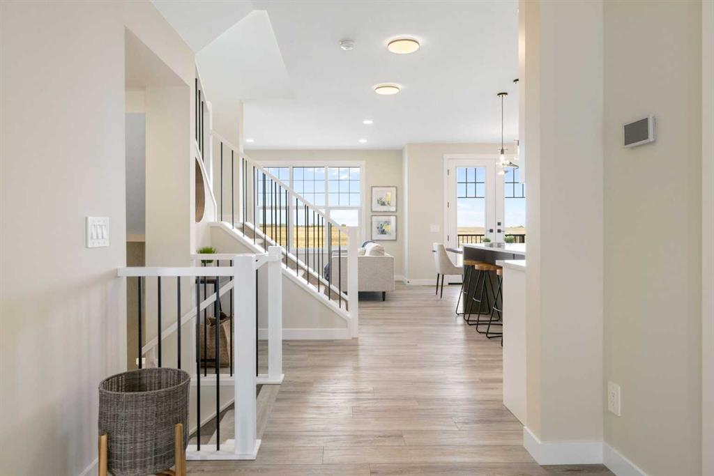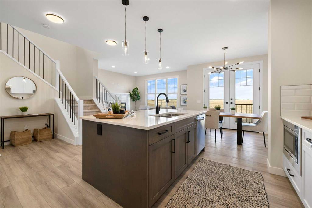 Welcome to 458 Kinniburgh Loop — an elegantly designed 1,840 sq. ft. duplex in the highly sought-after community of Kinniburgh South, Chestermere. Built by luxury builder Golden Homes, this residence blends modern living, functionality, and timeless design — all just minutes from schools, everyday amenities, and Lake Chestermere. The main floor features an inviting open-concept layout with soaring 9' ceilings and 8' doors, creating a spacious and grand feel. A large 8' front door with built-in glass window sets the tone for the luxury inside, while a convenient half bath, side entrance, and staircase access to the basement add everyday practicality. At the heart of the home is a chef-inspired kitchen boasting a striking two-tone cabinet design, quartz countertops, a large island with breakfast bar seating, ceiling-height painted cabinetry, and sleek stainless-steel appliances. Oversized triple-pane windows flood the living and dining areas with natural light, while an electric fireplace with multiple color settings and heat modes completes the living room in style. Upstairs, a grand staircase with white railings and matte black iron spindles leads to the luxurious primary bedroom, complete with a spa-like 5-piece ensuite featuring a freestanding tub, fully tiled walk-in shower, dual vanities, and an enclosed toilet. A custom walk-in closet with built-in shelving and organizers adds the finishing touch. Two additional spacious bedrooms and a full bathroom provide room for the whole family, while the tiled laundry room — complete with a quartz countertop — delivers everyday convenience. The partially developed basement offers a fantastic head start for future living space, with a separate side entrance, finished mechanical room, plumbing rough ins which all provide added flexibility. Premium finishes throughout include an oversized 20'x22' garage, matte black fixtures and hardware, upgraded MDF shelving, and high-efficiency triple-pane windows for year-round energy savings. The enhanced party wall ensures superior soundproofing between units. The exterior is fully landscaped with grading, loam, sod to the side entrance, and a front yard tree — offering instant curb appeal from day one. With its west-facing orientation, enjoy beautiful morning light and warm afternoon sun throughout the day. Pictures are of the same model. Selection specifications are subject to change.